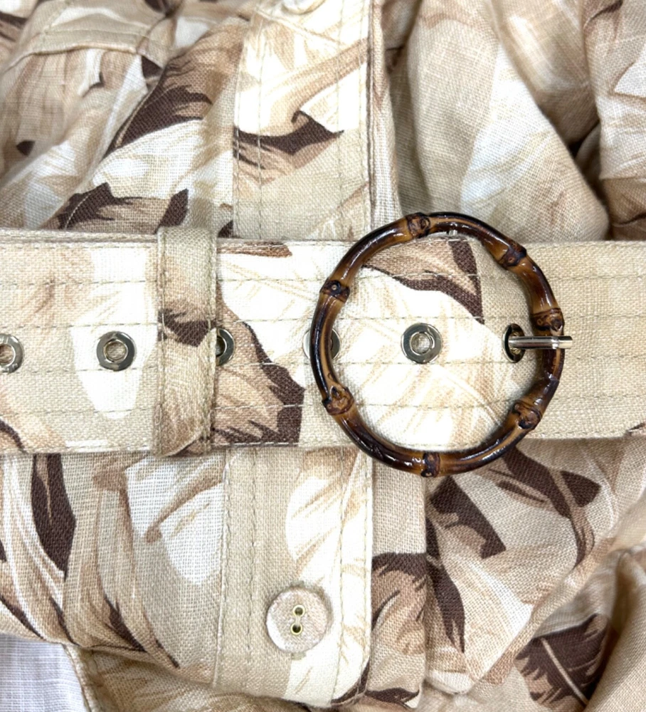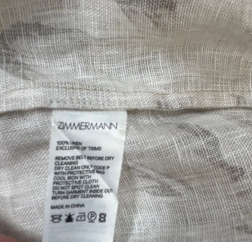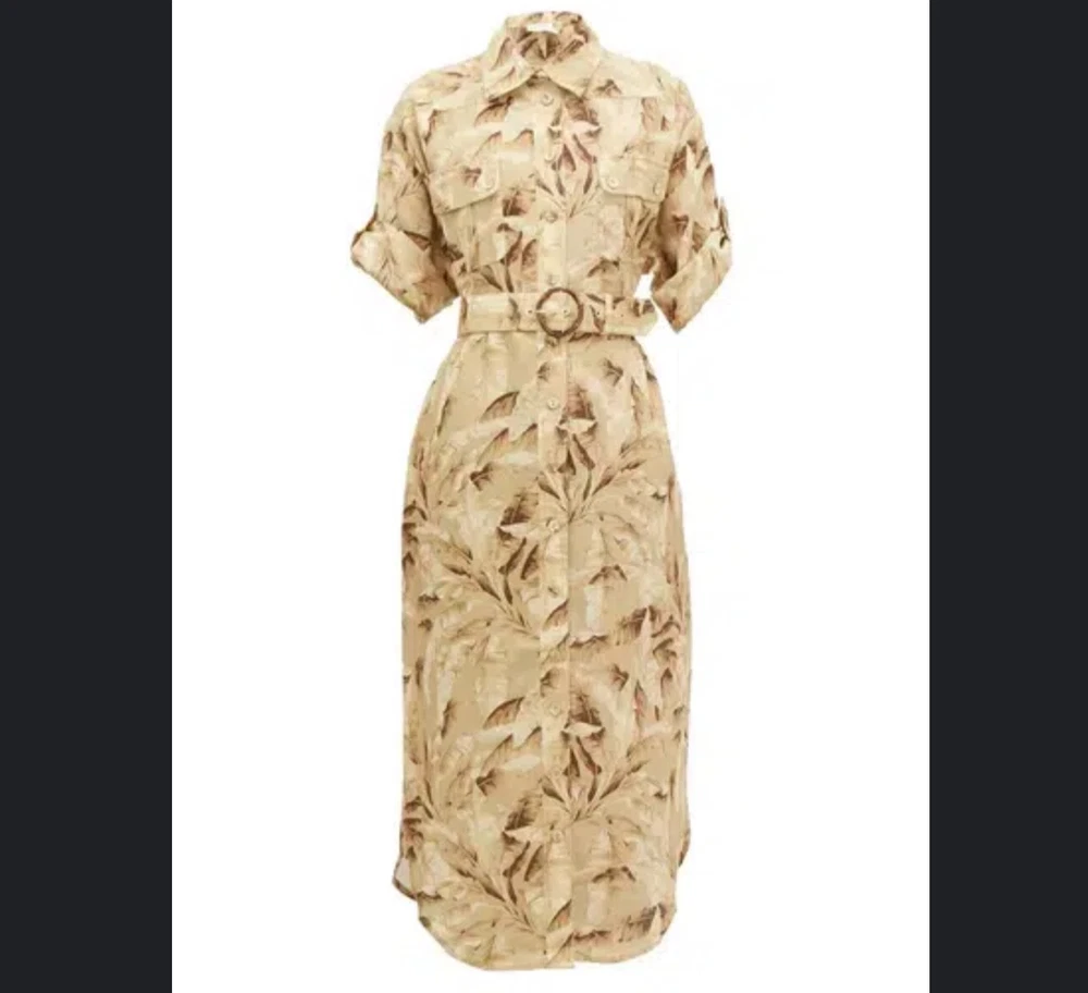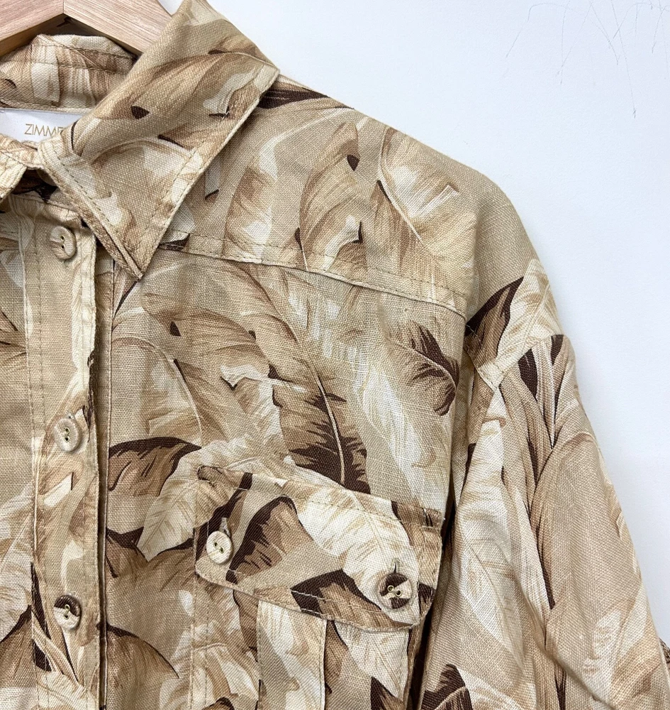 ZIMMERMANN SUPER EIGHT PALM TREE PRINT LINEN BELTED SAFARI SHIRT DRESS IN NEUTRALS Size 3 (AU/UK 14, US 10) Pls refer to brand website for more specific info re sizing Brand new with tags Safari style shirt dress Printed 100% Linen Pleated back Short sleeves with Buttoned tabs Detachable belt with bamboo circle buckle detail Folded cuffs Two side slit pockets Breast pockets Button fastenings through front Curved hem Non-stretchy fabric Mid-weight fabric Delicate dry clean 100% Linen ***pls note this is a brand new dress and condition is as such - however there is a tiny mark on the back of belt, if you refer to last pic & zoom in you might be able to see it, however due to the nature of the busy print its really not noticeable but wanted to disclose*** If you have any questions or require more details, photos ect pls don’t hesitate to msg me Pls check out my other listings - am open to reasonable offers (no low balls pls) and happy to combine postage #designer #australian #alemais shona joy alice mccall acler aje spell tropical safari African Safari Holiday