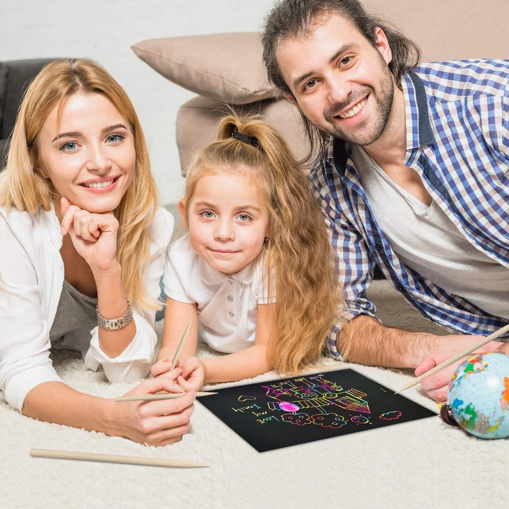 🌈🍒Great Value Scratch Paper Art Set: 🍓Scratch magic paper come with 50 sheets scratch sheets and 5 wooden stylus can meet your needs. you can use the stylus to scratch away to reveal the beautiful rainbow background. Let kids make outstanding handmade artworks, and keep boys and girls busy with fun DIY kids art craft project 🌈🍒Safe and Durable Material: 🍓Rainbow scratch paper art are made of premium paper and are safe and tasteless, not easy to tear up, durable enough for long time use and safe to create colorful picture designs. Kids scratch paper is a wonderful activity that allows children to paint, play games, and practice letters with parents. 🌈🍒Fun & Creative for DIY: 🍓Cut out your beautiful designs with this magic scratch art as Easter gifts eggs, bookmarks, gift tags, hanging decorations, scrapbooks and other scratch crafts projects, ideal for festival decorations, family fun day, art class, school projects and day cares on the holiday. Rainbow paper craft kit can improve your drawing, imagination and creativity skills, add more fun for you 🌈🍒The Perfect Scratch Gift: 🍓This rainbow sketch pad is suitable as a birthday gift and festival holiday gift for 3 years old up boys and girls. Perfect gift for children at Christmas, Children's Day, Valentine's Day, Mother's Day, Father's day, Halloween and Easter craft gifts for children to develop painting interests and skills 🌈🍒Wide Application for Colorful Life: 🍓Kids arts crafts use for multiple purposes, doodle, jot notes, create cards, sketch, draw, trace and more. This girls toys art makes an excellent art supplies for kids activity or grown-up artists. Throw this toddler craft set in your backpack, bag or even your pocket and create whenever inspiration strikes Product Description 1. Simple to Use & Easy to Draw Just use the wooden styluses included to easily scratch away the black film to reveal the beautiful rainbow colors! Kids can use the scratch off doodle pad to jot down notes, etch doodles, and create cool illustrations and designs 2. Delightful Craft Makes an excellent children art supplies and grown-up artists! Immerse your kids in this delightful black paper scratch pad design away from e-sports games. Inspire your toddler to create physical representations of their imagination, helping encourage communication skills. 3. High Quality Scratch Off Paper Art: Made of thick paper and won't being easily torn. This scratch and sketch paper is sufficient in quantity of various in kinds, suitable for you to use or send to others as a novel gifts Gift for Your Kids Christmas Halloween Birthday Children's Day No Messy, NO Terrible Smell Art Paper A Creative way to develop your kid's drawing and painting skills! This rainbow scratch drawing paper will be a nice gift for your preschool kids who love to draw and paint. With this magic drawing art kit, it enables your kids draw at the board with wooden stylus, no more stain and mess. Easy to clean and won't dirty kid's hands, your kids could create their own painting over and over again with their endless imagination. Feature of Our Fun Creativity Paper Kit Safe & Nontoxic Material Easy to clean and won't dirty No Messy & No Odd Flavor Good Quality & Thick Paper Virtually everyone has tried drawing with paint before, but have you heard of rainbow scratch paper art? This draw book is made of good quality & thick paper, won't fade & deform easily that's allow your kids fun for it with a long period No Toxic Powder, Safe & Clean Our rainbow art papers are made of thick, safe & clean paper material, no toxic and no terrible smell. These scratch rainbow art papers no terrible flavor & easy to use that allows your kids spend their time to draw and create their masterpieces. Colorful & Shiny Art Set These cute papers are cute and perfect size for your little kids who can use it to create some pretty drawings with different color. Excellent for everyday fun or a rainy day. Want to turn 'me' time into 'we' time? Let's scratch you a picture! Arts and crafts for girls is one of the best activities to help toddlers and preschoolers develop essential communication and social skills. Help your little artists express their imagination