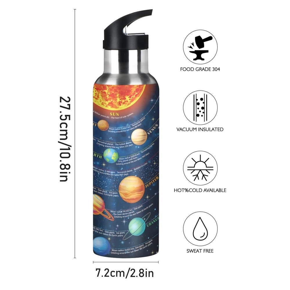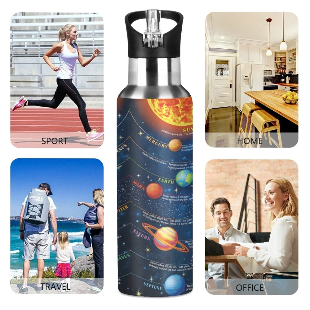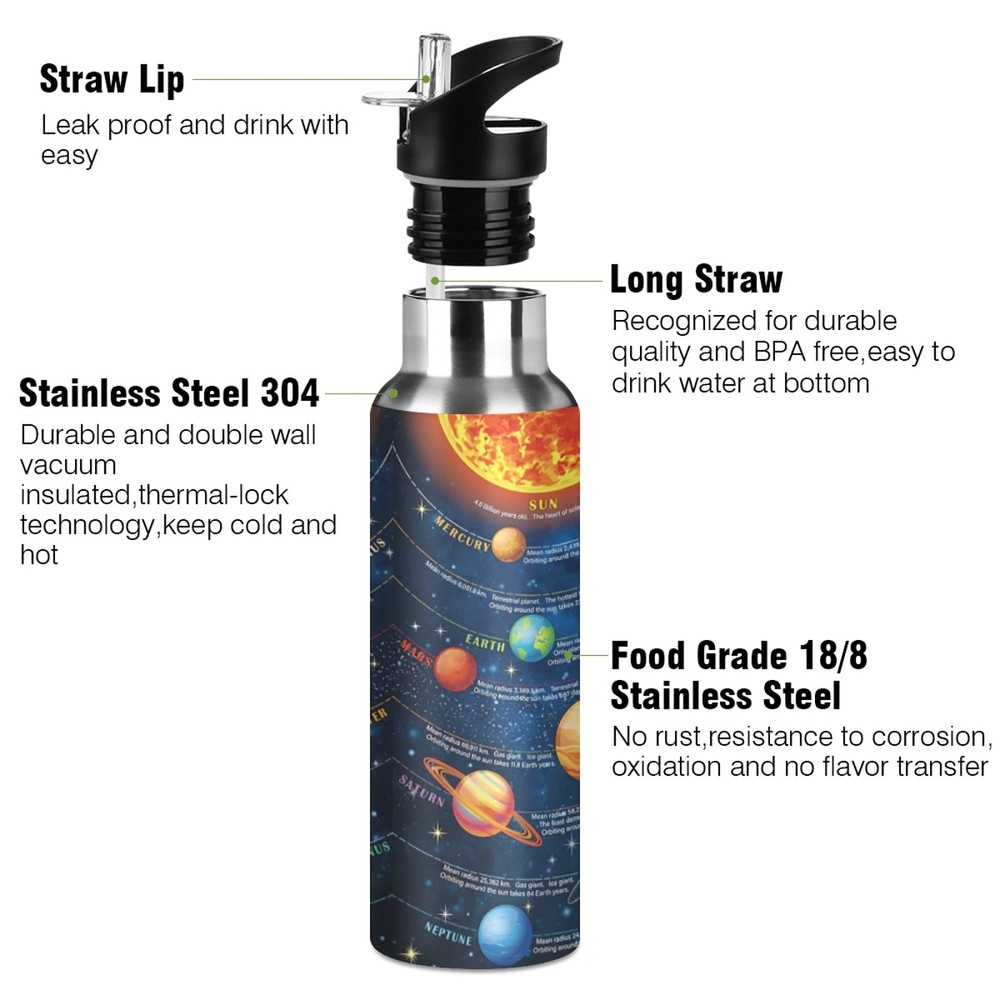Material: Stainless Steel Package Include: 1x Vacuum insulation bottle FEATURE Perfect Size: Comfortably carry this quality bottle in your hand or place it in your gym bag, backpack, or suitcase. NO BPA, Phthalate, and Toxin-Free: With your health in mind, our insulated bottles are made without BPA, phthalates, and toxins. Use your reusable water bottle for all of your hydration needs! Fashion Style: This bottle is perfect for school, work, travel and fitness. The built-in straw will prevent you from choking on drinking water too quickly after exercise. The wide mouth opening also fits large ice cubes and allows you to fill up your bottle fast. Personalized Water Bottle: The unique pattern is a perfect birthday gift, Thanksgiving gift, Christmas gift, New Year gift, or Back to School gift. Stainless steel water bottles without BPA. The polyethylene straw is safe and non-toxic, resistant to high temperature and no deformation. High-quality stainless steel double-layer vacuum structure, the outside of the water bottle body is made of food-grade metal outer material, which can be completely removed and washed. 8 hours keep COLD & WARM. food-grade stainless steel inner tank, the outer wall of the inner tank is equipped with a heat insulation layer, and a vacuum temperature lock layer, creating a very heat preservation effect. Straw & detachable bottle cap, foldable storage, convenient for drinking, clean and hygienic. The sports water bottles is equipped with a vent valve to ensure air circulation and facilitate drinking. Widened handle position can be easily lifted with two fingers, making it more portable.