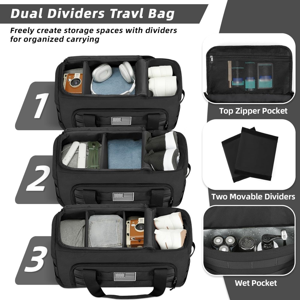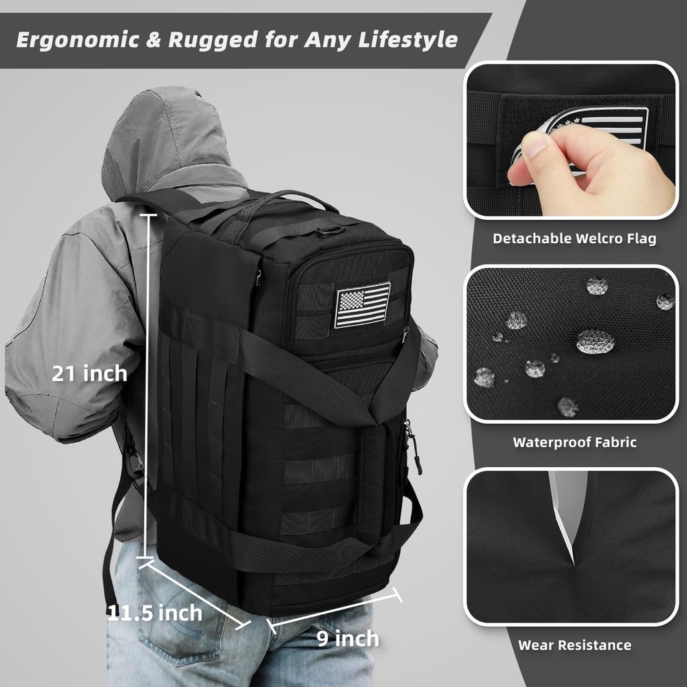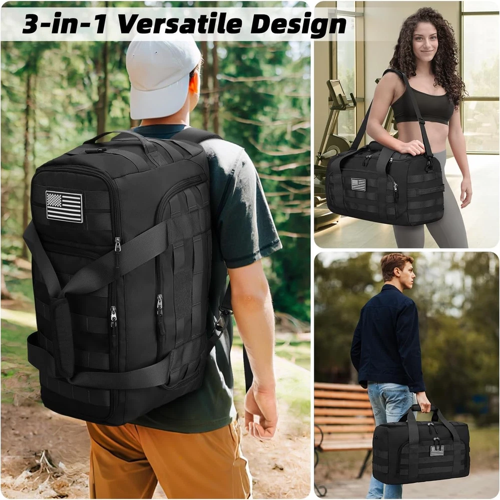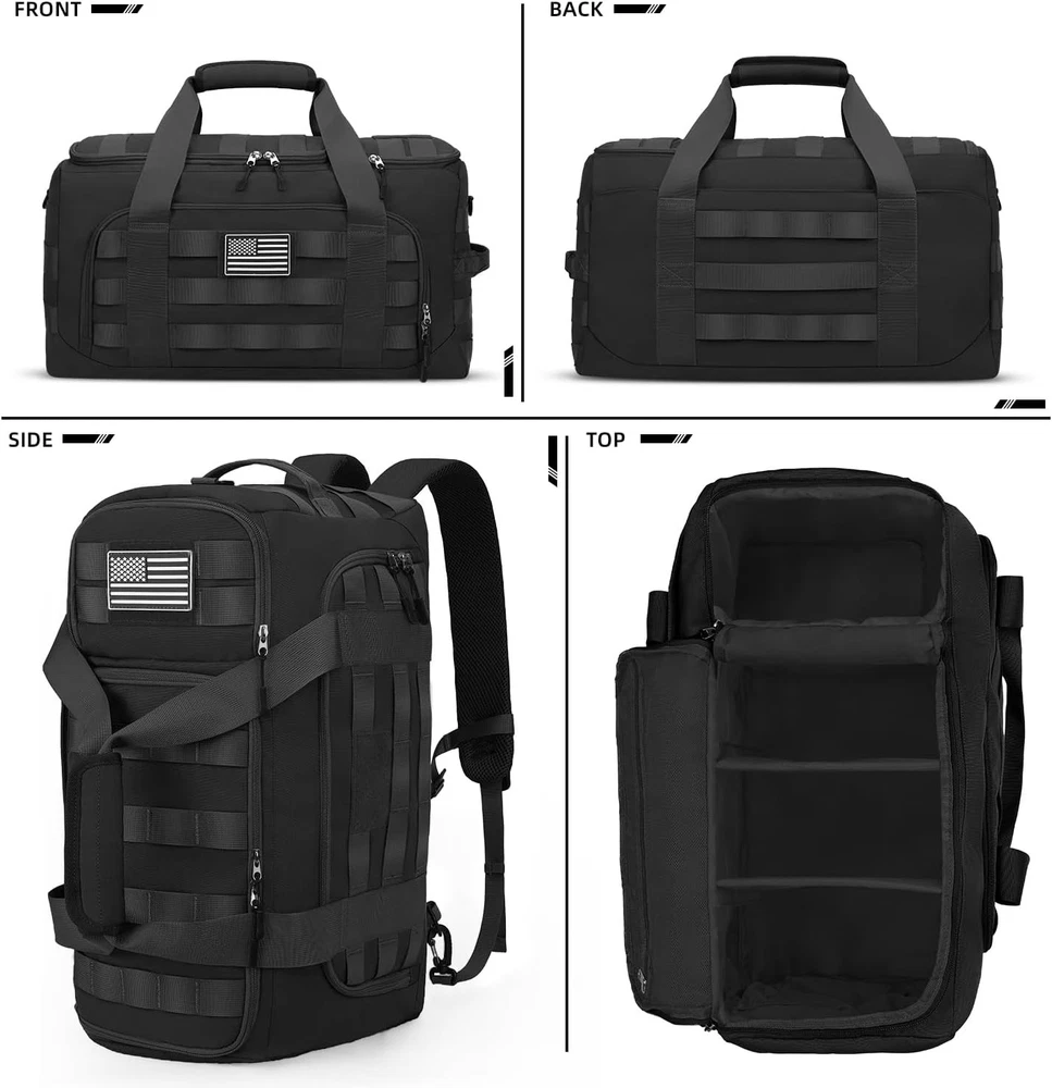 ZOMFELT Tactical Gym Bags for Men, 40L Travel Duffle Bag with LARGE, Black Product Details Product Dimensions: 21 x 9 x 11.5 inches Item Weight: 2 pounds Department: Unisex Manufacturer: ZOMFELT Item model number: YDB024 3-in-1 Versatile Design: Convertible into a duffel bag, shoulder bag, or travel backpack—perfect for gym, travel, and tactical use. Effortlessly switch styles for workouts, trips or missions—ergonomic, rugged & versatile for any lifestyle. Customizable Organization: 2 removable dividers let you create 2-3 compartments for gym gear, travel essentials, and tactical items. The innovative vertical shoe compartment design of this gym bag saves space in the main compartment and enables effortless shoe storage Military-Grade Durability: Crafted from 900D water-resistant nylon with reinforced stitching and heavy-duty zippers, this duffle backpack tackles rugged outdoor adventures fearlessly—rain, rough trails, or heavy loads Comfort & Travel-Friendly: This carry on bag meets most airline carry-on limits (Size: 21” x 11.5” x 9”) and features a luggage sleeve for stacking on rolling bags. The adjustable shoulder strap and padded handles make it comfortable for airport transit or hiking trails Tactical Expandability: Equipped with a full MOLLE webbing system, this tactical bag effortlessly attaches extra pouches, tools, or gear—perfect for tactical operators and outdoor adventurers craving customizable, mission-ready versatility
