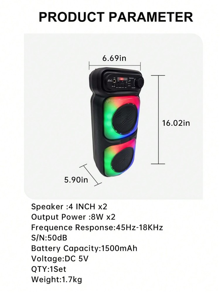 Power:OthersSpeaker Battery Average Playtime:5 to 8HInterface:USBPower Supply:Battery Powered(Rechargeable Battery)Wireless Version:OthersColor:BlackConnectivity:WirelessCertification:FCCPlug Type:USBModel:SpeakerBrand:ZQS4273MType:Wireless SpeakersBatteries Included:YesUPC:Does not applygtin13:Does not applyMaterial:ABS