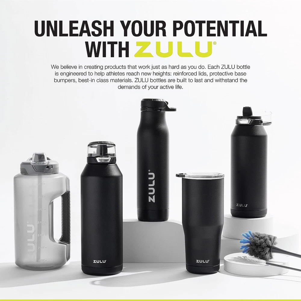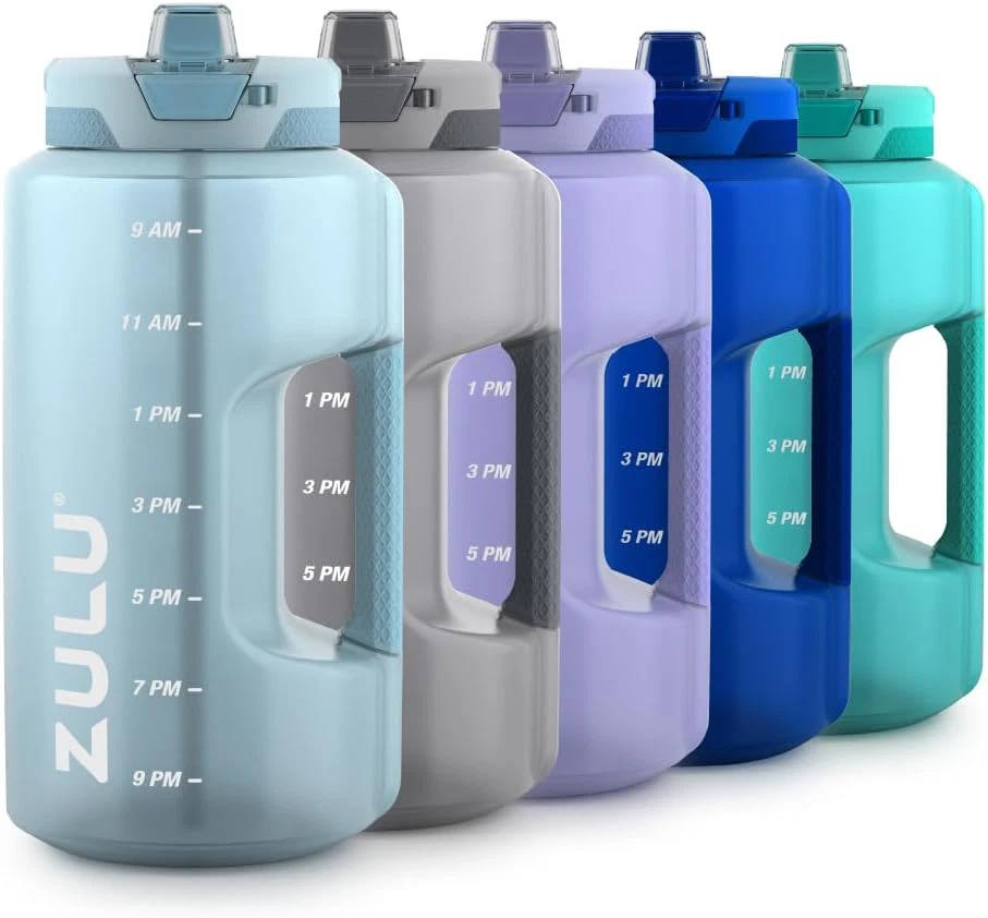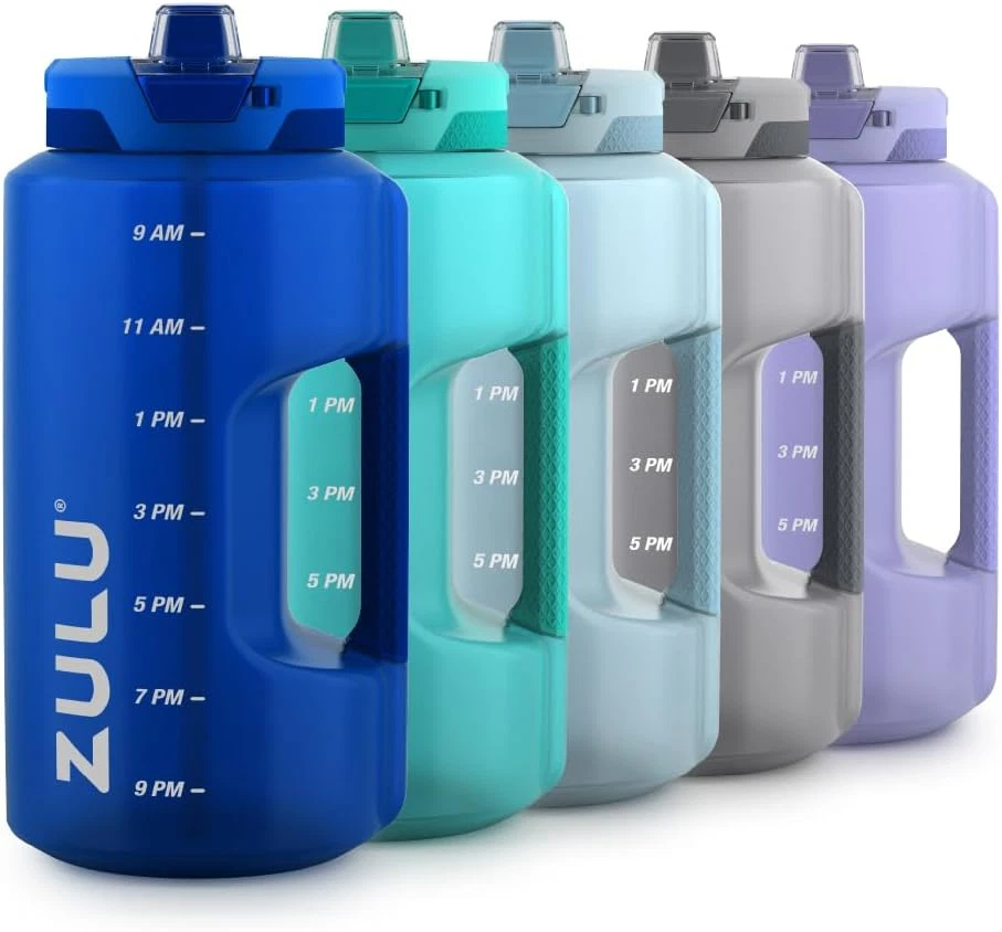 LARGE CAPACITY: ZULU Goals 64oz BPA-free water bottle with straw will ensure you're hydrated all day long. Make refills a thing of the past. MOTIVATIONAL TIME TRACKING: Time markers help you stay on track throughout the day. Great for measuring your daily water intake and tracking your progress. TRAVEL FRIENDLY: Soft-touch handle on the side or integrated easy grip at the top for maximum comfort on the go. The lightweight body makes Goals perfect for the gym, recreation, hiking, and sports. EASY TO CLEAN: All parts are top rack dishwasher safe. Wide-mouth opening and removable straw allow for ice and easy cleaning. ONE TOUCH FLIP LID: Easy open lid keeps the drink surface covered and plastic straw makes drinking easy. The locking lid ensures no spills while on the go and wide mouth accommodates ice and easy cleaning. From the manufacturer Zulu Goals 64oz Half Gallon Plastic Jug with Time Marker and Handle The ZULU Goals Half Gallon Plastic Jug helps you reach your hydration goals. Its motivational time markings help track liquid intake throughout the day to ensure you drink enough water. Flip open a one-touch lid that keeps the straw clean and makes drinking easy and comfortable. Its large 64oz lets you drink all day with fewer fill-ups and a portable handle allows for easy on-the-go use. LARGE 64oz CAPACITY ZULU Goals half gallon BPA-free water bottle with straw will ensure you're hydrated all day long. Make refills a thing of the past. It also features time markers help you stay on track throughout the day. Great for measuring your daily water intake and tracking your progress. LEAK PROOF Easy open lid keeps the drink surface covered and plastic straw makes drinking easy. The locking lid ensures no spills while on the go and wide mouth accommodates ice and easy cleaning. TRAVEL FRIENDLY Soft-touch handle on the side or integrated easy grip at the top for maximum comfort on the go. The lightweight body makes Goals perfect for the gym, recreation, hiking, and sports. EASY TO CLEAN All parts are top rack dishwasher safe. Wide-mouth opening and removable straw allow for ice and easy cleaning.