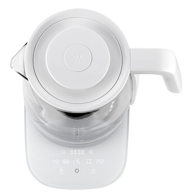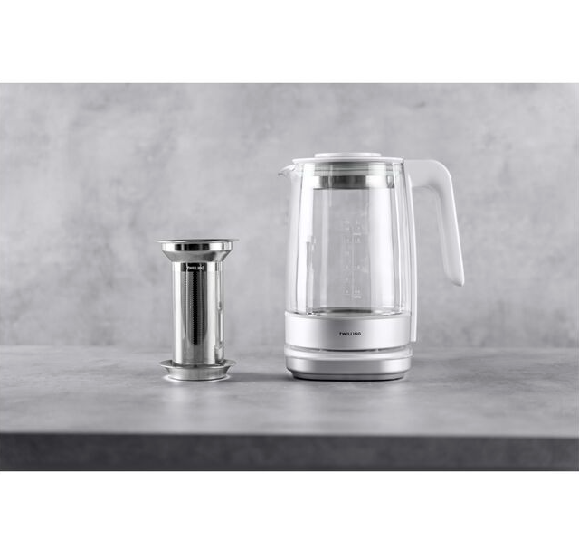 ZWILLING Enfinigy 1.7 L, Glass Kettle - Silver Pour yourself the perfect cup with our electric kettles. This beautiful, durable borosilicate glass kettle is a powerful 1500-watts and offers a generous maximum capacity of 1.7 liters. It features precise temperature control, 6 pre-set temperature programs, a 30-minute keep-warm function and a handy tea steeping timer. The stainless-steel steeper can be inserted to prepare your favorite tea directly in the kettle. When removed it can be placed on the included drip tray to avoid messes. The docking base boasts a handy cord storage for a clean, minimal design that keeps your countertop looking as sleek as the appliances on it. Durable borosilicate glass body Double-sided measuring line, max capacity 1.7 liters Stainless-steel steeper to prepare your favorite tea directly in the kettle 6 pre-set temperature control options along with a tea timer, that measures 0 - 10 minutes, and a 30-minute keep-warm function Developed by ZWILLING in Germany, designed in Milan, Italy by Matteo Thun & Antonio Rodriguez Docking base with touch control and a hidden display when powered off Integrated cord winder for convenient storage The longest warranties in the industry