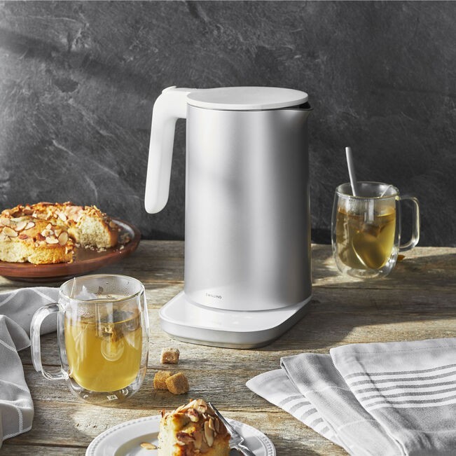 ZWILLING Enfinigy Tea Set - Silver, 9-pc The Enfinigy Kettle Pro Set in silver features everything you need to pour the perfect cup of your favorite beverage. With the Kettle Pro you can achieve the ideal water temperature for coffee, tea, baby bottles, and more at just the touch of a button. After you’ve poured your cup, the Sorrento Coffee Glass Mugs maintain their toasty temperature while remaining cool to the touch on the outside. And the ultra-absorbent ZWILLING Care Towels keep your kitchen clean when tea-time is over. They mop up spills and help you dry freshly washed dishes in no time. The Cool Touch Kettle features 6 pre-set program settings on the 360° docking base so you can choose your temperature with just one touch. Additional features include precise temperature control +/- 4°F. and a 30-minute keep-warm function. And while it stays nice and hot on the inside because of the double-walled insulation, it’s always cool to the touch on the outside. Mouth-blown by skilled artisans, Sorrento’s innovative double-wall design maintains your beverage's ideal temperature, without messy condensation or the need for a coaster. Exceptionally durable due to their high quality, sturdy borosilicate glass construction, these lightweight glasses are perfect for outdoor dining, dinner parties, and everyday use. The set also includes ZWILLING Care Kitchen Towels, a kitchen staple that gives back. Proudly made in India from 100% cotton, these highly absorbent towels ensure a speedy cleanup. Quick-drying and lint-free, the towels are ideal for wiping countertops and handling hot pans. Plus, they feature a convenient hanging loop for storing. By purchasing our kitchen towels, you support the ZWILLING Care foundation’s work in providing vocational training to women, young people with disabilities, and others who may be at a disadvantage in society. Set includes 1 Kettle Pro, 2 Sorrento coffee glass mugs, 4 grey kitchen towels Kettle available in black or silver Kettle Pro features 6 pre-set program settings for the ideal temperature selection for coffee, tea, baby food, and more Keep-warm function holds water at the desired temperature for up to 30 minutes Double-walled body keeps water hot longer while the outside remains cool to the touch Integrated cord winder for convenient storage Double wall glasses maintain perfect temperature of beverages. Keep hot drinks hot while remaining cool to touch and cold drinks stay cool for longer with no messy condensation Glasses constructed of high-quality, durable borosilicate glass that is mouth blown by skilled artisans Glasses are microwave, freezer, and dishwasher safe, towels are machine washable Kitchen towels made in India as part of the ZWILLING Care foundation charitable work