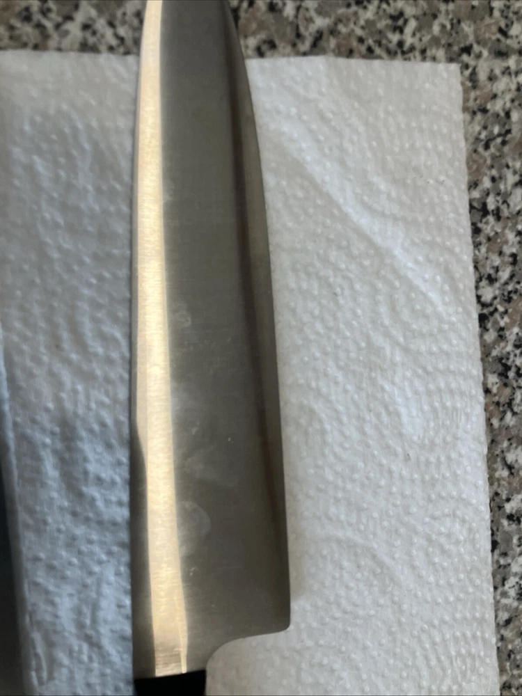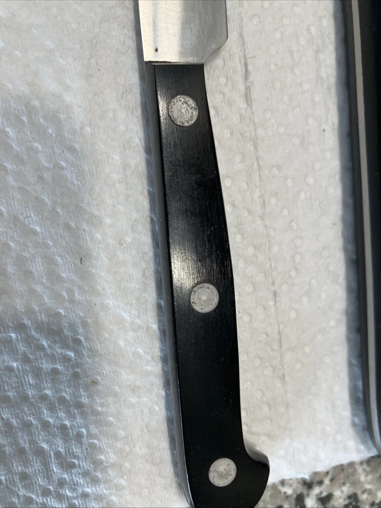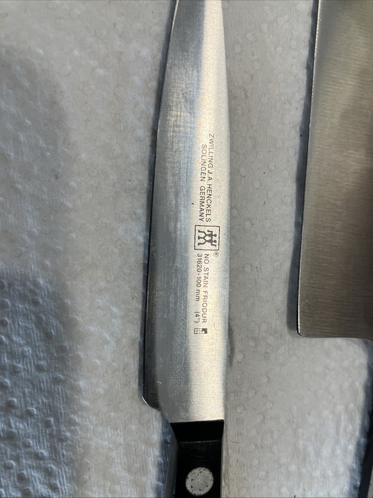 This is a set of 2 knives from ZWILLING J.A. HENCKELS, made in Solingen, Germany. The set includes a 8" Chef's Knife and a 4" Paring & Peeling Knife. Both knives are made of stainless steel with a hollow blade edge. The knives are identified by model numbers 31625-200mm and 31620-100mm. Very clean items looks like new.