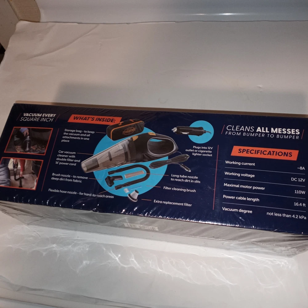 This corded 12V car vacuum cleaner is the perfect solution for keeping your car clean and tidy. With its compact and portable design, you can easily use it anywhere you go. The Zabba THIS WORX model comes with a filter, nozzle, and upholstery brush, making it a complete cleaning package. The vacuum cleaner is designed with a 12V power source and is bagless, making it easy to dispose of the dirt and dust. The corded design ensures that you have continuous power throughout your cleaning process. The vacuum cleaner is available in a sleek black color, making it a stylish addition to your cleaning arsenal. Brand new.