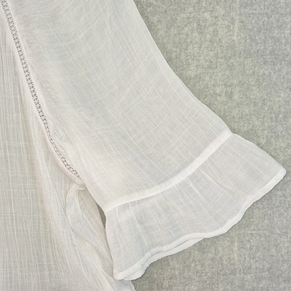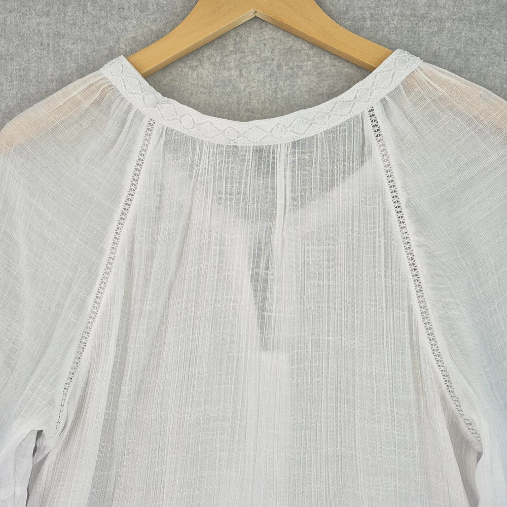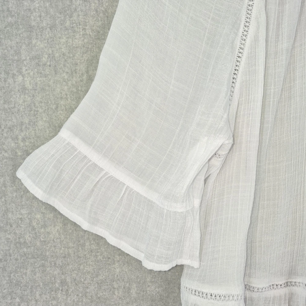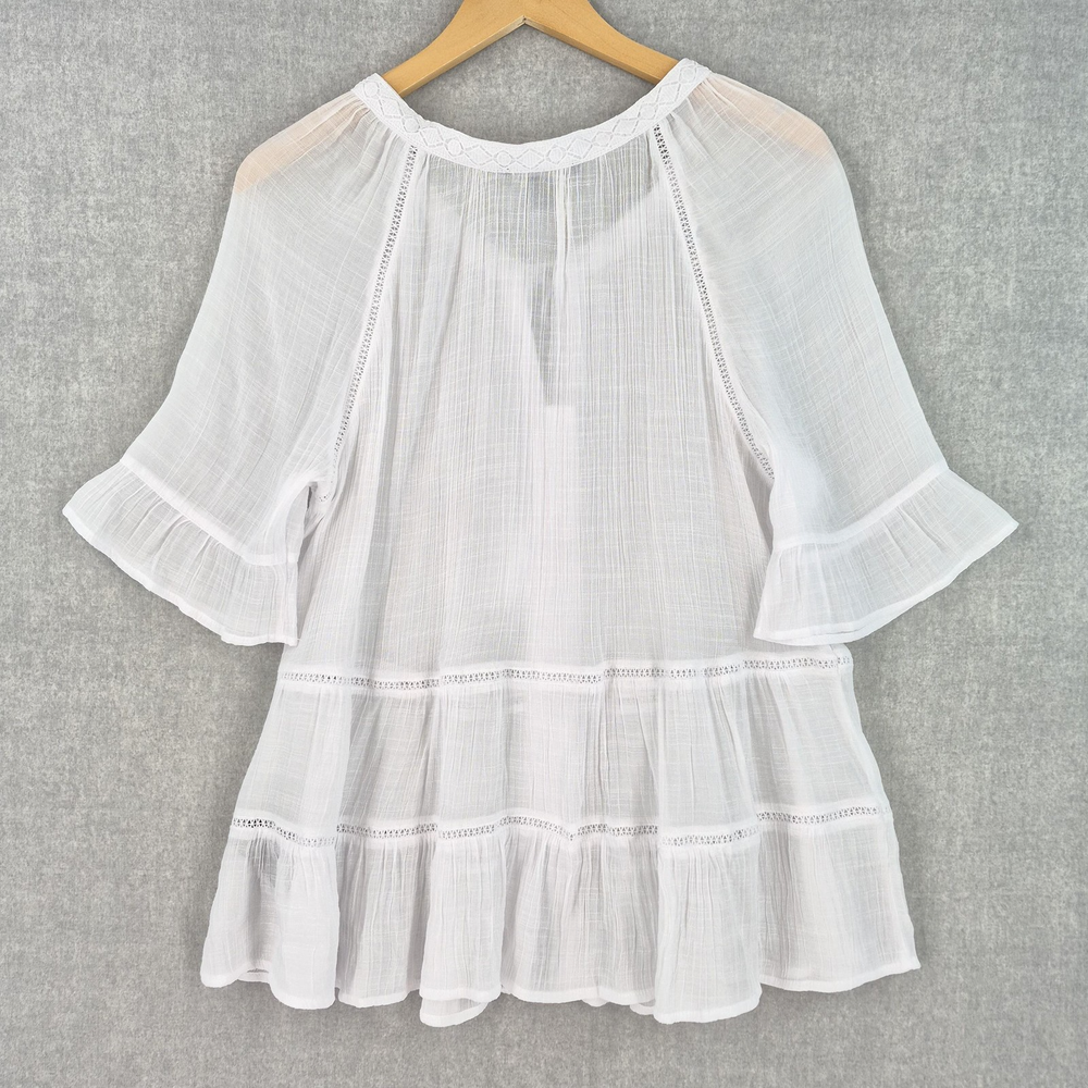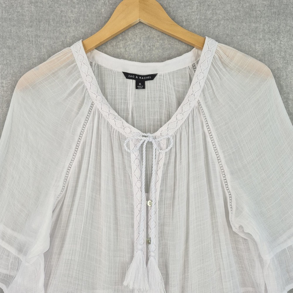 Welcome to Aspen Crossing, offering many styles that reflect the natural beauty of our American West. Whether your style is Western Bohemian or Quiet Luxury, you’ve come to the right place! Zac & Rachel Blouse Womens XL White Crochet Lace Crinkle Gauze Sheer Boho Peasant Flowy Ruffle Tiered Tassel Brand: Zac & Rachel. Item: Womens short sleeve tiered boho tunic blouse. Gender/Size: Womens XL, as indicated on the interior size label marked XL. Please refer to the photo measurements and compare them with one of your own garments to ensure a correct fit. This garment length is measured from the top of the shoulder to the hem, and chest from underarm to underarm. Color: White solid tone in a semi-sheer finish. Material: Body fabric is 65% polyester and 35% rayon in a lightweight woven construction; trim is 100% polyester. Country of origin: Made in China. Style/Model identifiers: Zac & Rachel logo neck label; interior size tag marked XL; RN 103715. Features: Round neckline with embroidered lace trim, front keyhole opening with braided tie and tassel detail, partial button front placket, short flutter sleeves with tiered ruffle cuffs, lace inset trim along the front and back seams, tiered ruffle hem, relaxed fit, and unlined semi-sheer fabric ideal for layering with casual or beach-inspired outfits in warmer seasons. Care: Turn garment inside out, hand wash cold, use only non-chlorine bleach when needed, lay flat to dry, and cool iron if needed (per interior care label instructions). Notes: Color may vary slightly in photos due to lighting and monitor settings; measurements are shown in photos for reference, so compare to a similar garment for best fit.