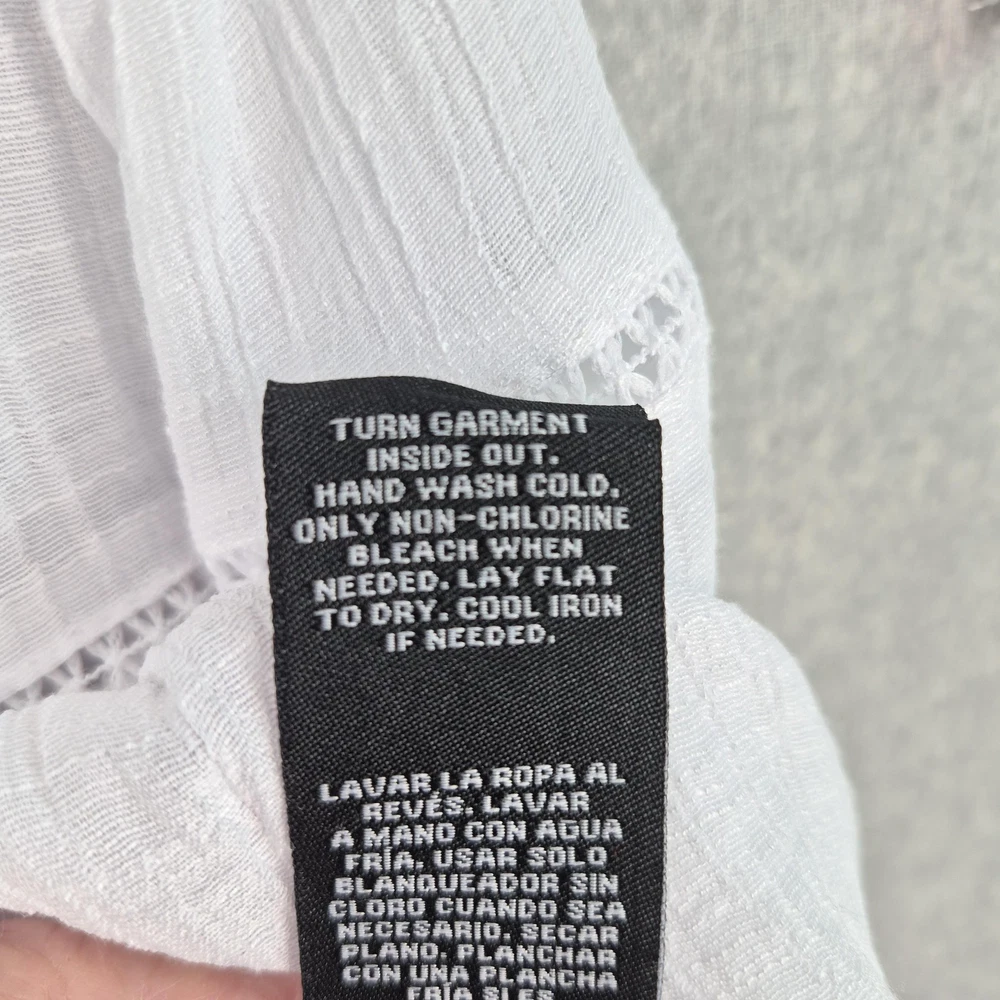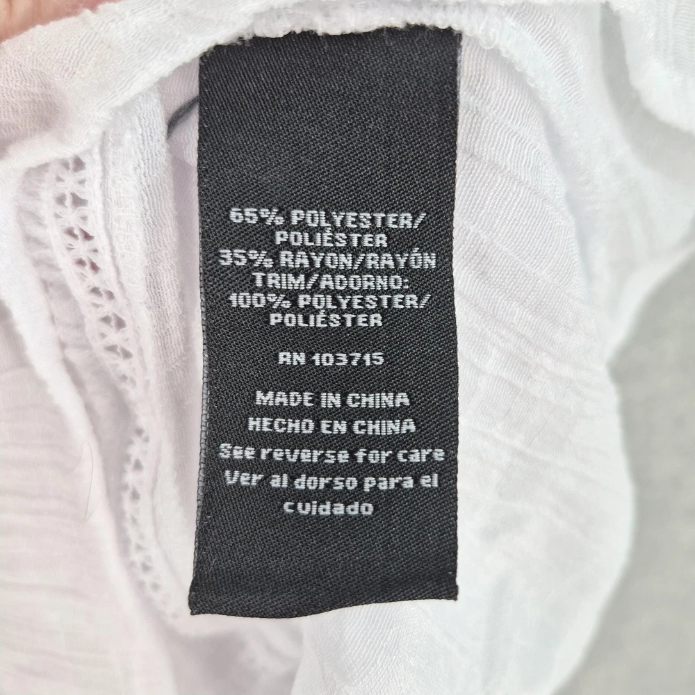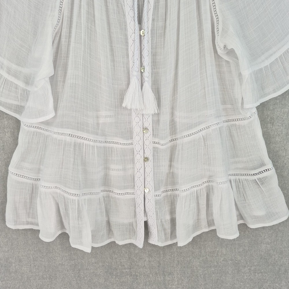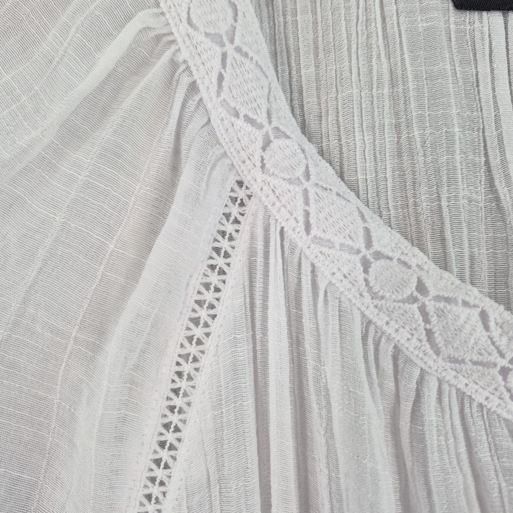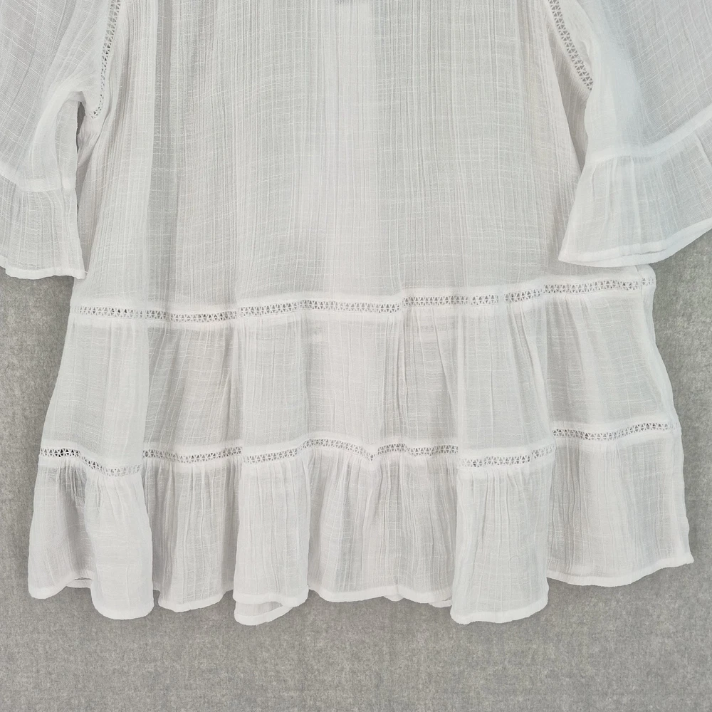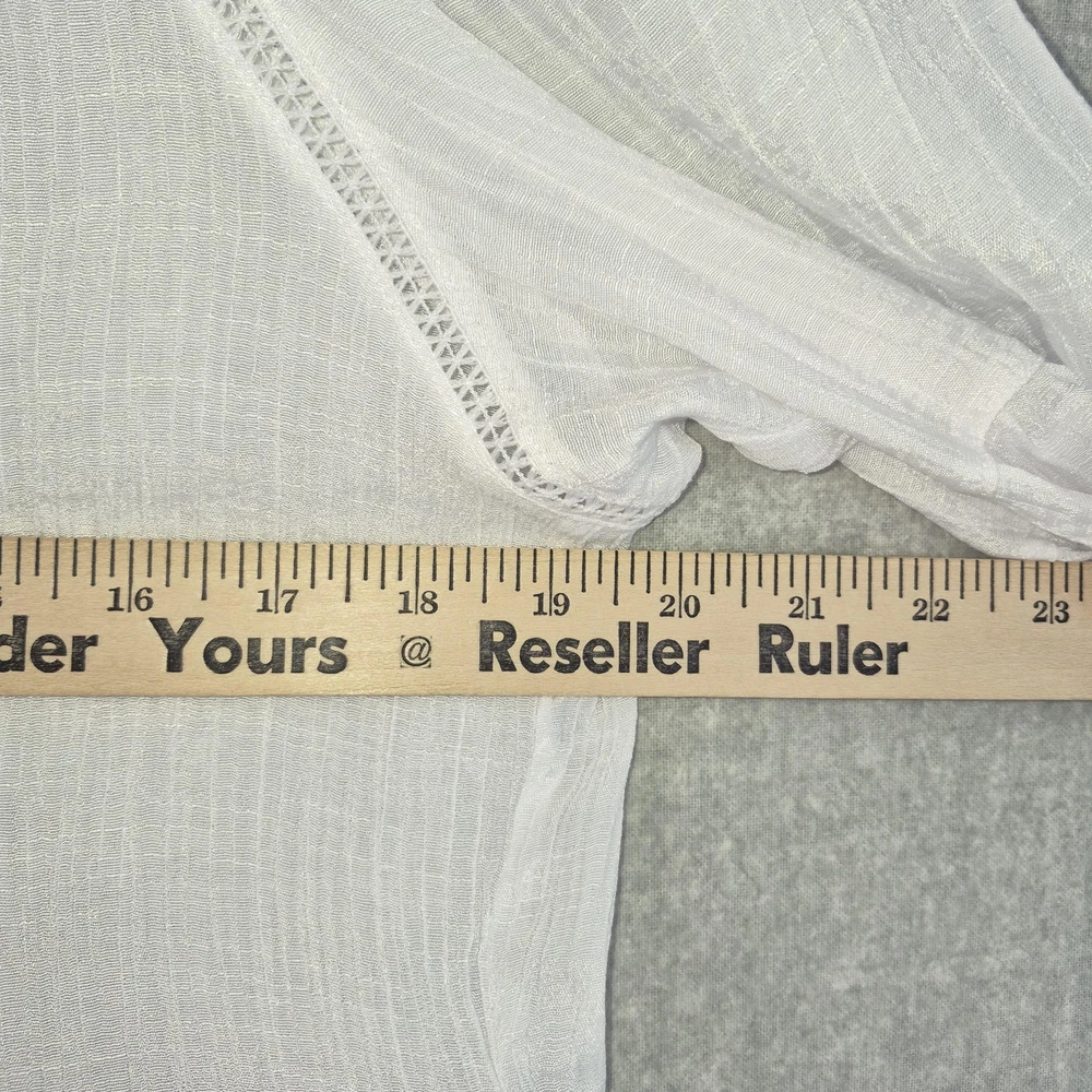 Welcome to Aspen Crossing, offering many styles that reflect the natural beauty of our American West. Whether your style is Western Bohemian or Quiet Luxury, you’ve come to the right place! Zac & Rachel Blouse Womens XL White Crochet Lace Crinkle Gauze Sheer Boho Peasant Flowy Ruffle Tiered Tassel Brand: Zac & Rachel. Item: Womens short sleeve tiered boho tunic blouse. Gender/Size: Womens XL, as indicated on the interior size label marked XL. Please refer to the photo measurements and compare them with one of your own garments to ensure a correct fit. This garment length is measured from the top of the shoulder to the hem, and chest from underarm to underarm. Color: White solid tone in a semi-sheer finish. Material: Body fabric is 65% polyester and 35% rayon in a lightweight woven construction; trim is 100% polyester. Country of origin: Made in China. Style/Model identifiers: Zac & Rachel logo neck label; interior size tag marked XL; RN 103715. Features: Round neckline with embroidered lace trim, front keyhole opening with braided tie and tassel detail, partial button front placket, short flutter sleeves with tiered ruffle cuffs, lace inset trim along the front and back seams, tiered ruffle hem, relaxed fit, and unlined semi-sheer fabric ideal for layering with casual or beach-inspired outfits in warmer seasons. Care: Turn garment inside out, hand wash cold, use only non-chlorine bleach when needed, lay flat to dry, and cool iron if needed (per interior care label instructions). Notes: Color may vary slightly in photos due to lighting and monitor settings; measurements are shown in photos for reference, so compare to a similar garment for best fit.
