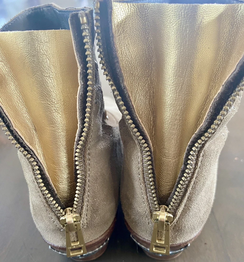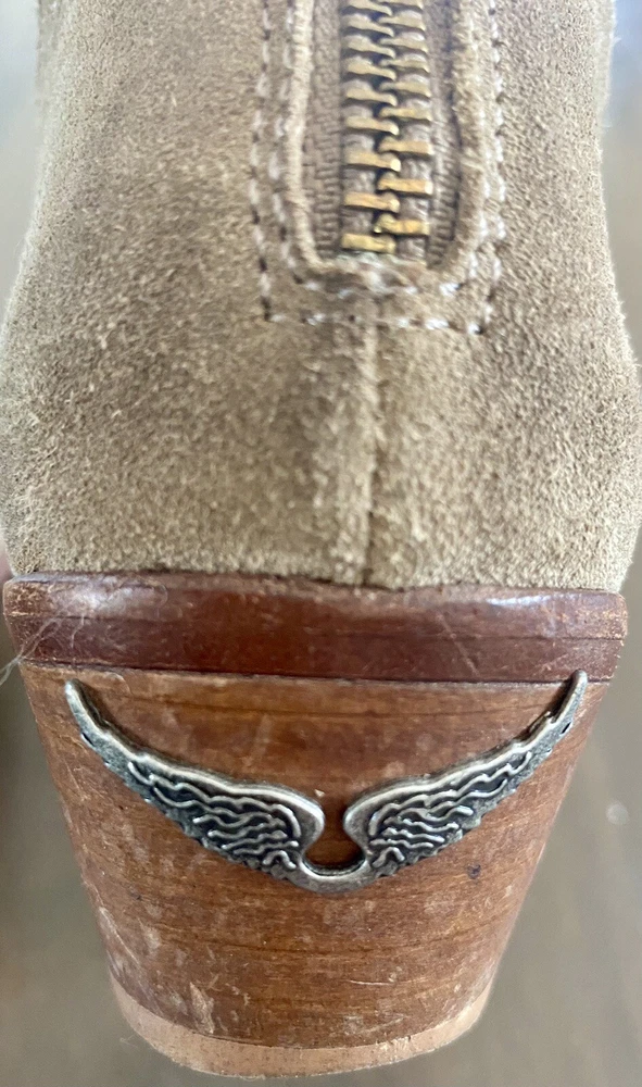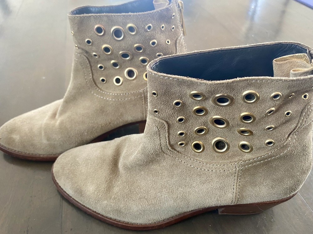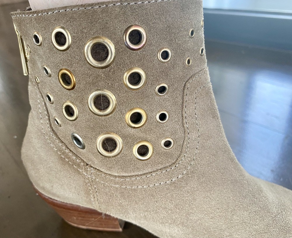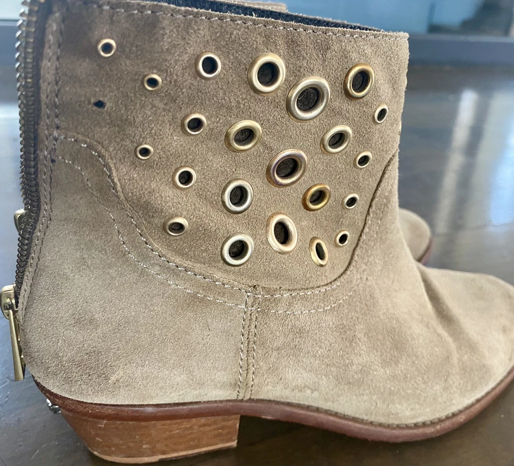 Elevate your shoe game with these stunning Zadig & Voltaire booties in tan suede. The ankle-length boots feature a solid pattern with an almond toe shape and a low block heel, making them perfect for travel, parties, or casual wear. The studded gold-tone rivet accents add a touch of glamour to the overall design, while the zip closure ensures easy wear. These booties come in US shoe size 8 or EU shoe size 38 and are made with high-quality materials, including suede and rivet accents. The motorcycle theme adds a touch of edginess to the style, making them a versatile addition to any wardrobe. Whether you're dressing up or down, these Zadig & Voltaire booties are sure to turn heads. One small rivet is missing near ankle. Suede shows some wear. Comfortable, cute booties that pair great with skinny jeans, skirts, and shorts.