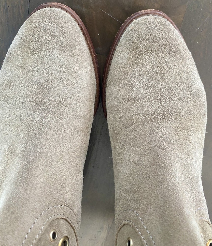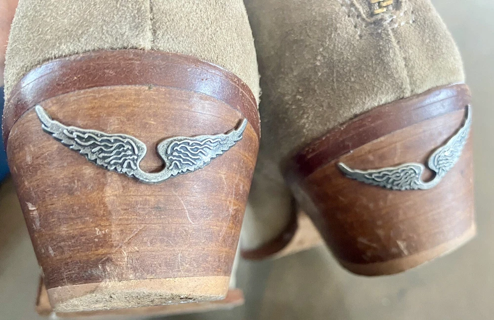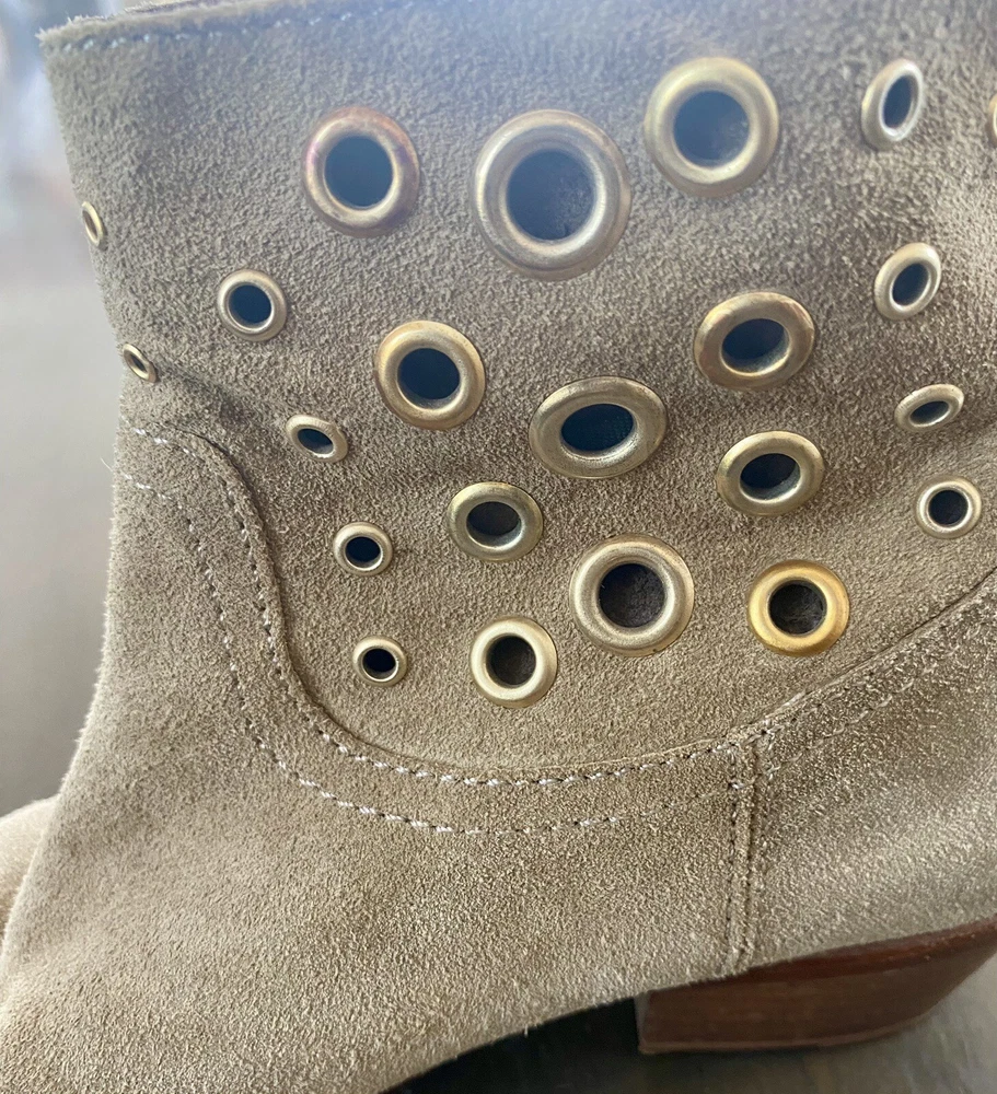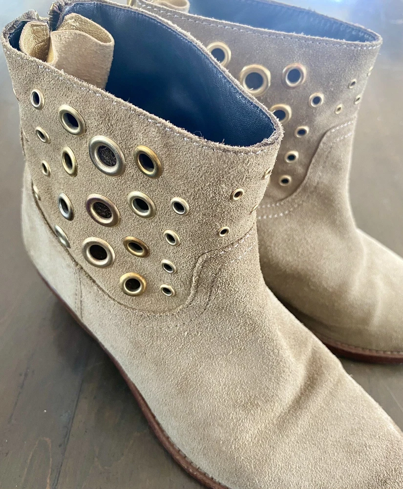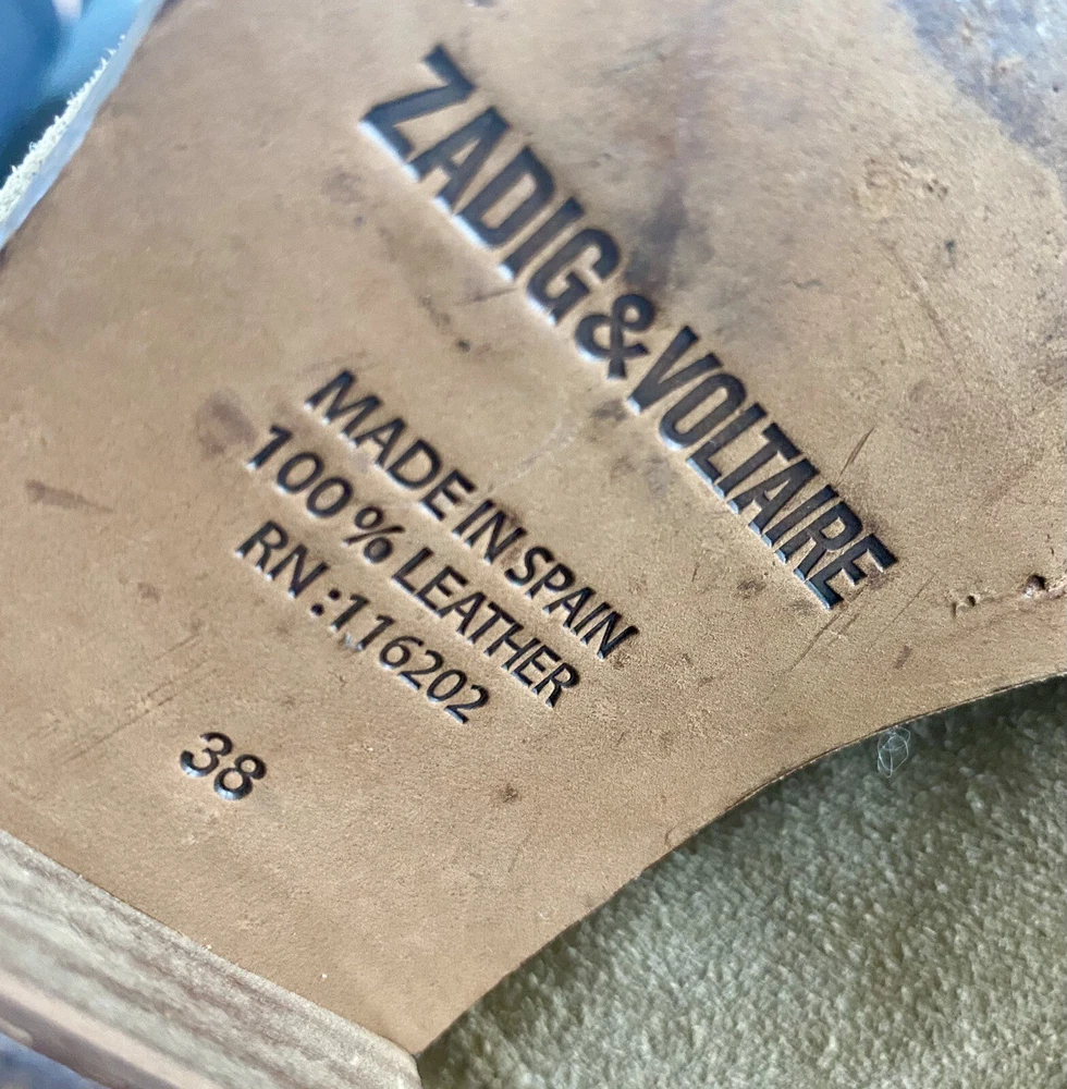 Elevate your shoe game with these stunning Zadig & Voltaire booties in tan suede. The ankle-length boots feature a solid pattern with an almond toe shape and a low block heel, making them perfect for travel, parties, or casual wear. The studded gold-tone rivet accents add a touch of glamour to the overall design, while the zip closure ensures easy wear. These booties come in US shoe size 8 or EU shoe size 38 and are made with high-quality materials, including suede and rivet accents. The motorcycle theme adds a touch of edginess to the style, making them a versatile addition to any wardrobe. Whether you're dressing up or down, these Zadig & Voltaire booties are sure to turn heads. One small rivet is missing near ankle. Suede shows some wear. Comfortable, cute booties that pair great with skinny jeans, skirts, and shorts.