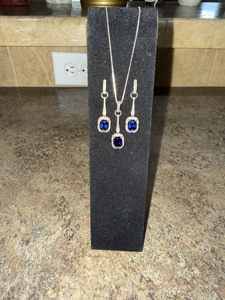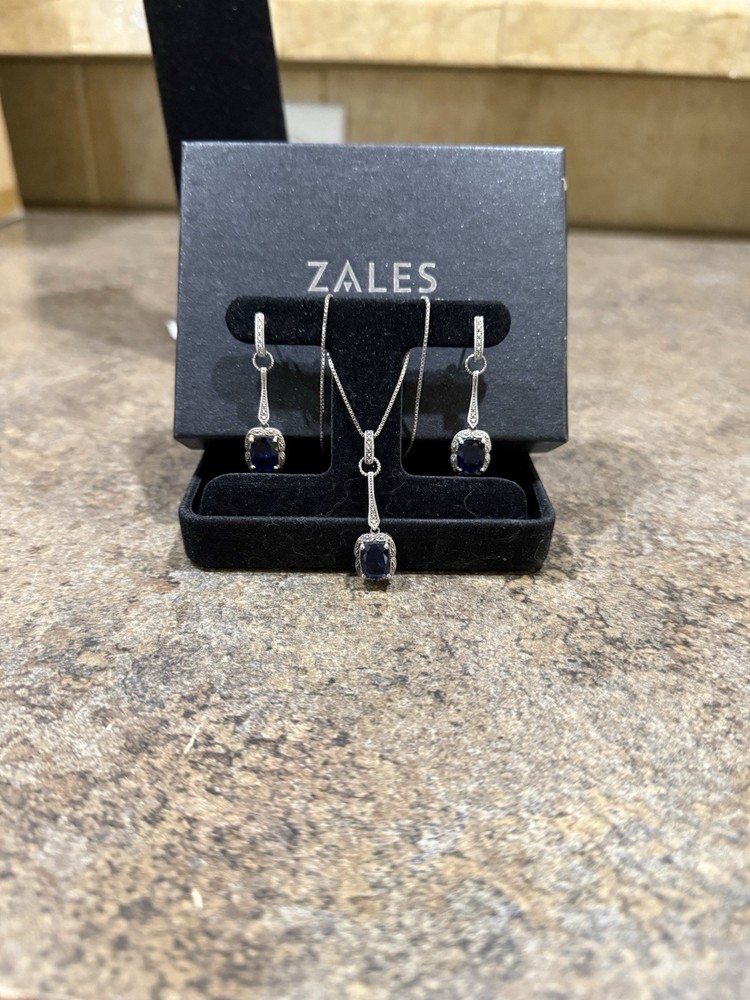 The Zales Sterling Silver Sapphire Necklace and Earrings Set is a stunning piece of fine jewelry featuring radiant cut blue sapphire stones. The set includes a necklace and earrings, all crafted with 925 sterling silver. The intricate design and high-quality materials make it a beautiful and luxurious addition to any jewelry collection. With a brand like Zales, you can trust in the quality and craftsmanship of this jewelry set. Perfect for a special occasion or as a gift for a loved one who appreciates elegant and timeless pieces.
