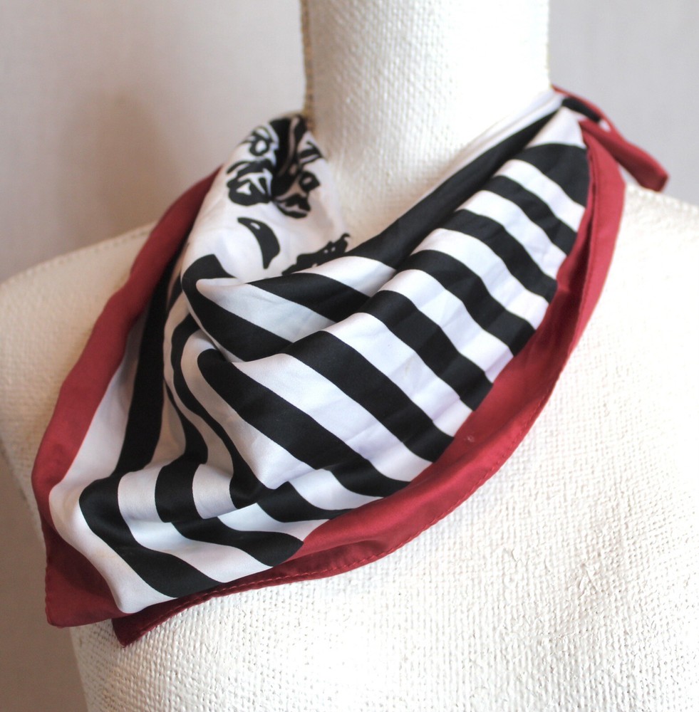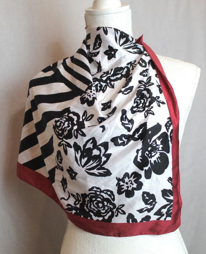 Zara Hand-Rolled Striped Floral Scarf 20x20 Red White Black