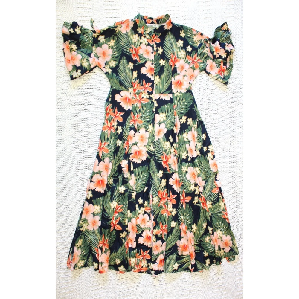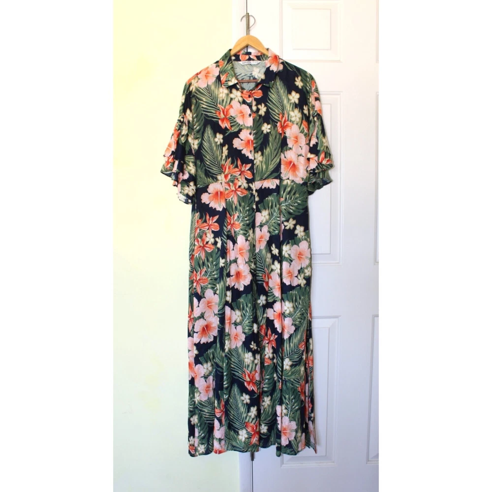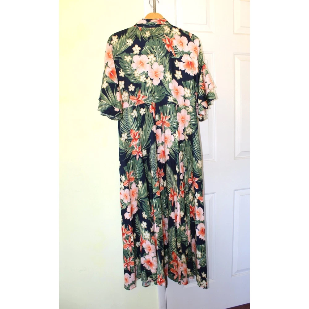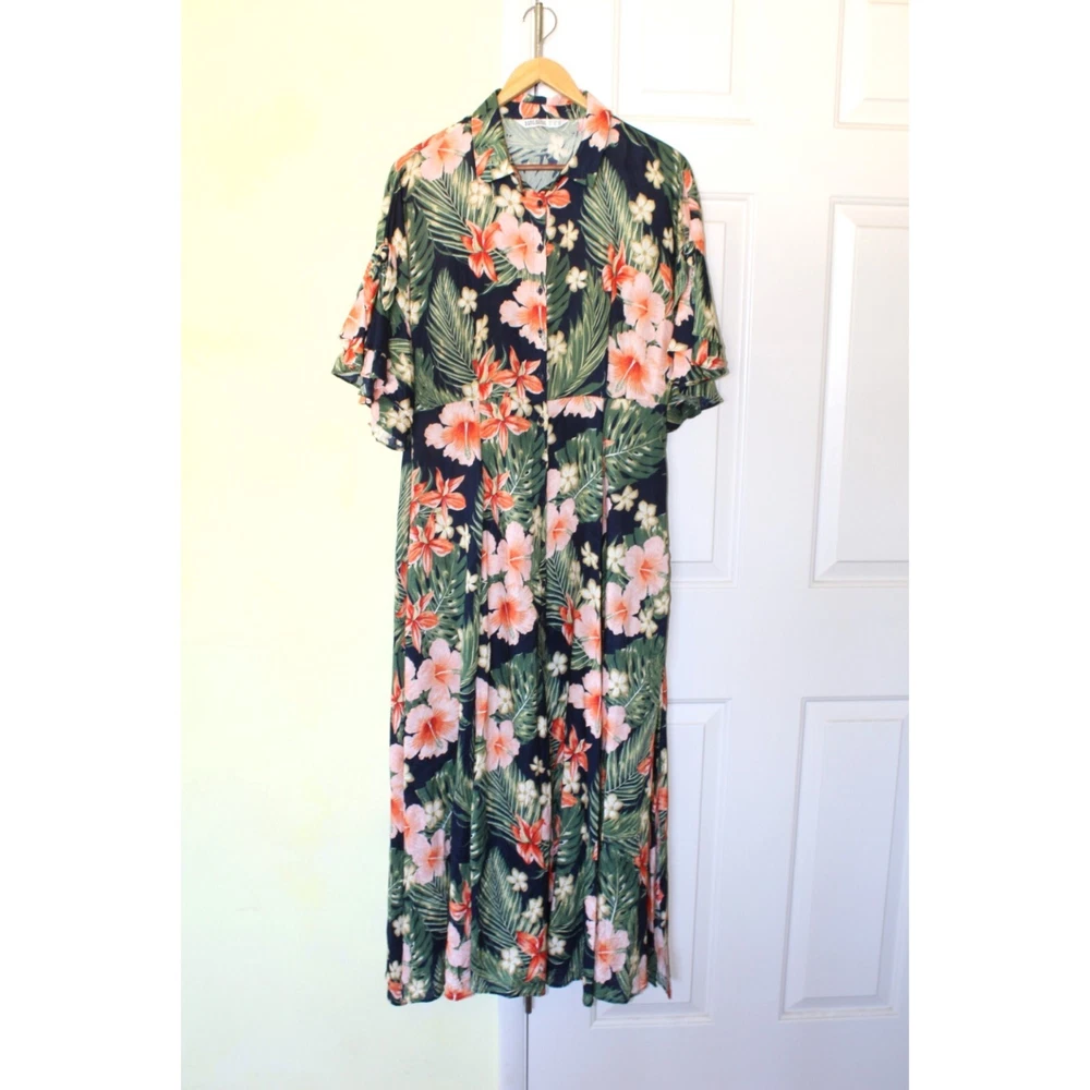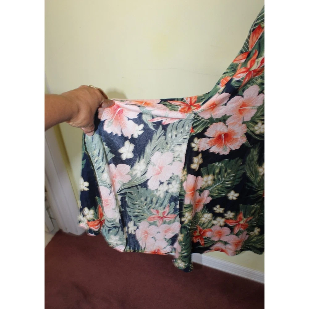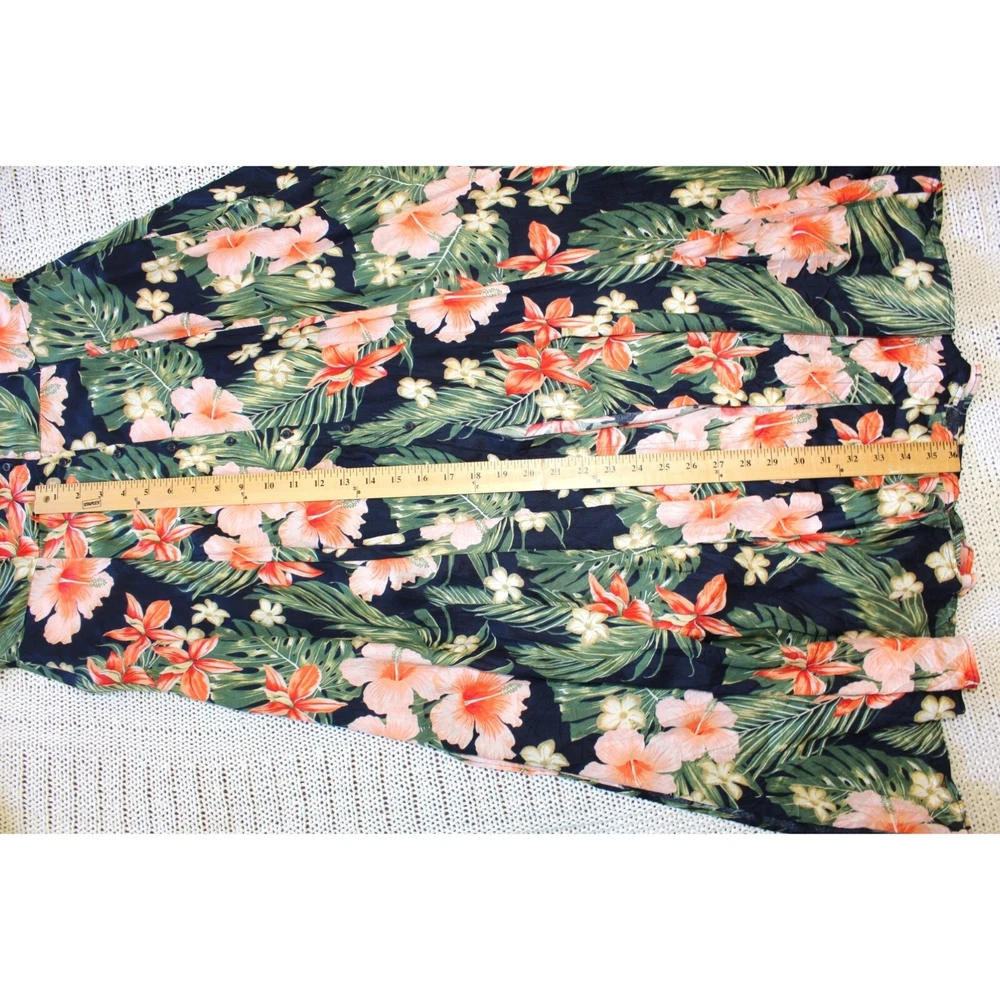 Excellent pre owned condition. Please look pictures for measurements. 100% Viscose Size: XL in US Button front Orange green and Black Hibiscus Flower