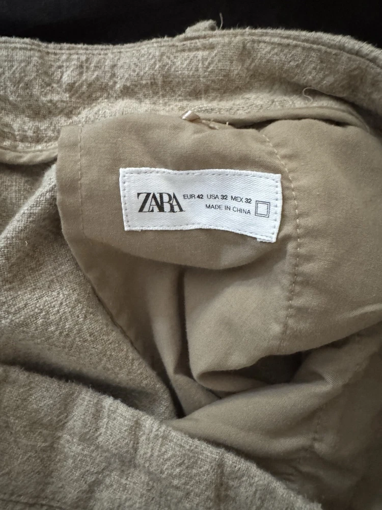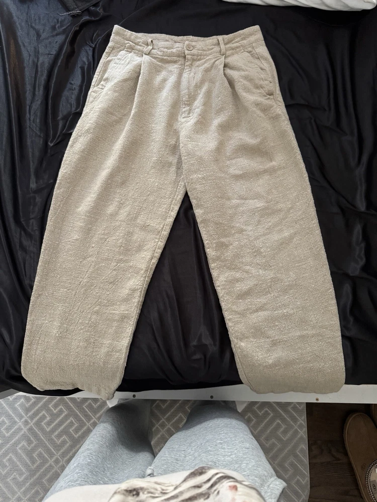 These Zara Pants are designed for men in a size 31 with a classic fit. Made from a blend of linen and cotton, they feature a beige color and a straight leg style. The pants have a flat front with a zip and button closure, ideal for casual occasions with a coastal or beach theme. They are ankle-length with a mid-rise and breathable fabric, perfect for wear in winter, fall, or spring. Easy to care for with machine washable instructions, these pants offer comfort and style for a minimal yet sophisticated look.