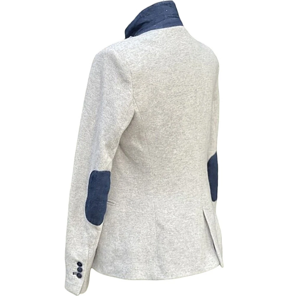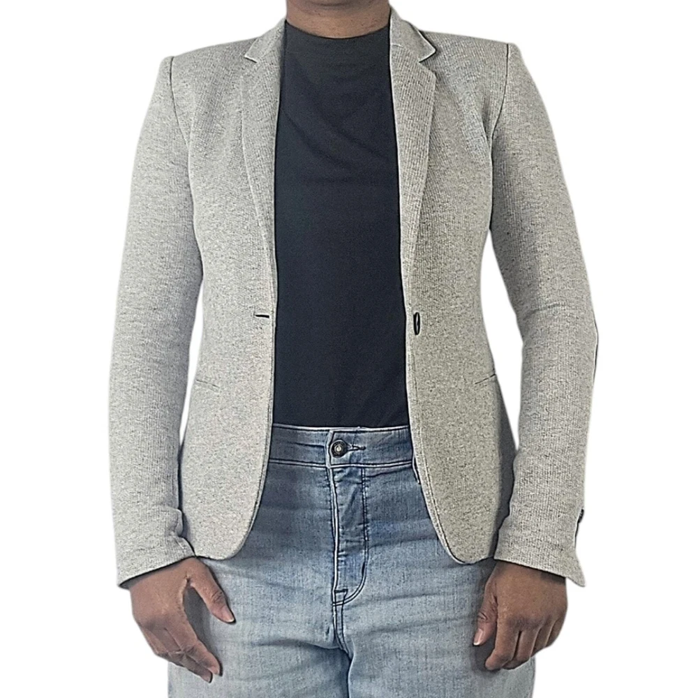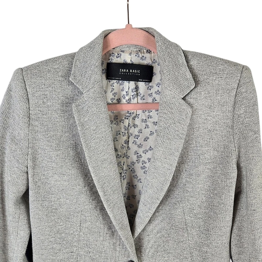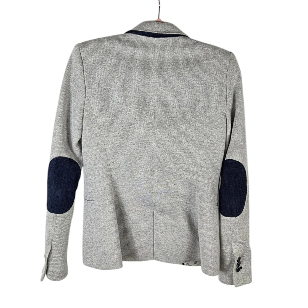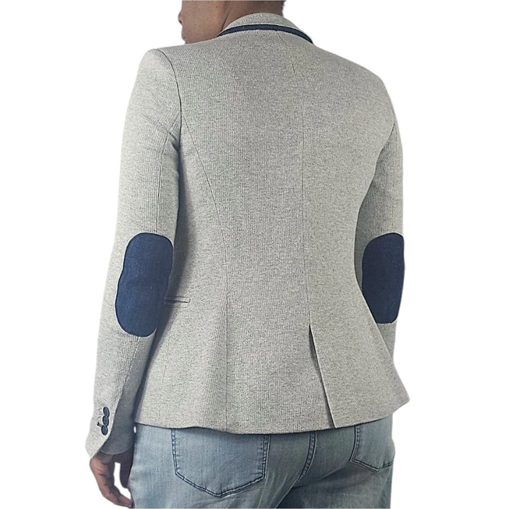 Zara Single Buttoned Denim Elbow Patch Grey Blazer. Size S. Single button, lapel collar, two welted front pockets, denim elbow patches, as well as denim on back collar, buttoned cuffs, and fully lined blue geometric pattern. Measurements are approximate. Blazer in good preowned condition. chest 17" sleeve 24" length 23" material 60% cotton 40% polyester lining:100% acetate stretch No N1145 11/12