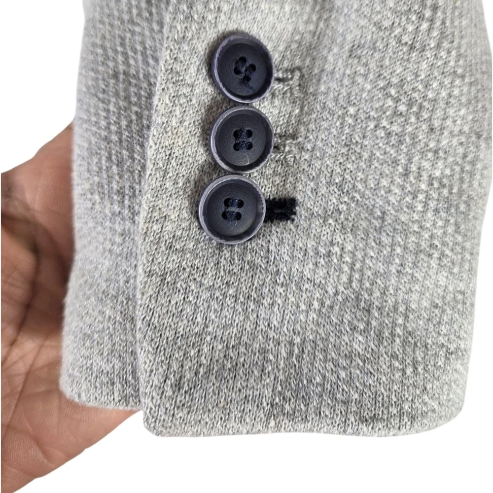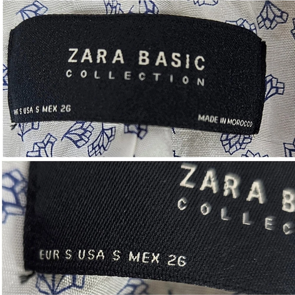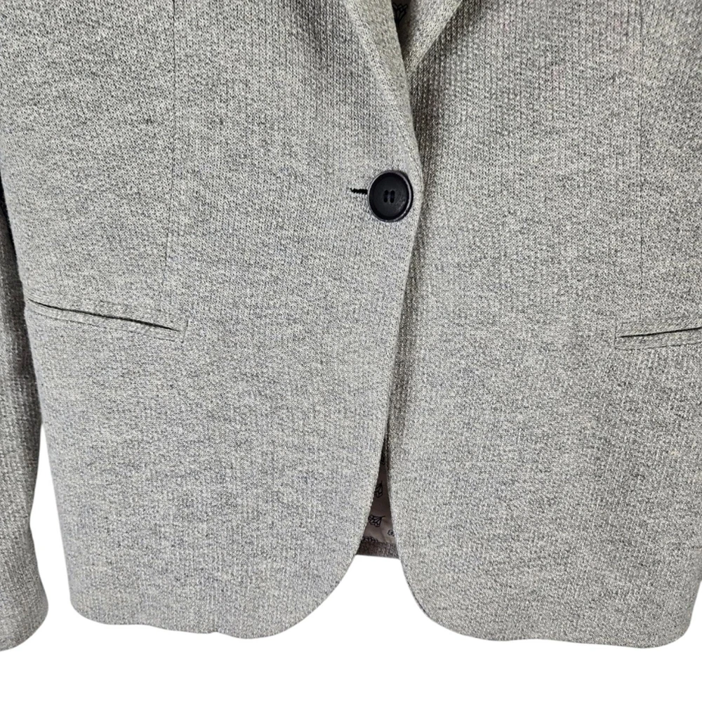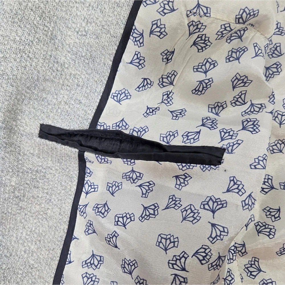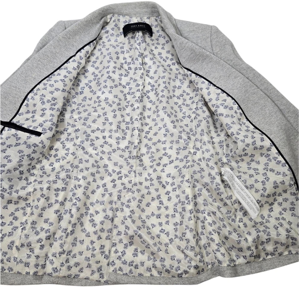 Zara Single Buttoned Denim Elbow Patch Grey Blazer. Size S. Single button, lapel collar, two welted front pockets, denim elbow patches, as well as denim on back collar, buttoned cuffs, and fully lined blue geometric pattern. Measurements are approximate. Blazer in good preowned condition. chest 17" sleeve 24" length 23" material 60% cotton 40% polyester lining:100% acetate stretch No N1145 11/12