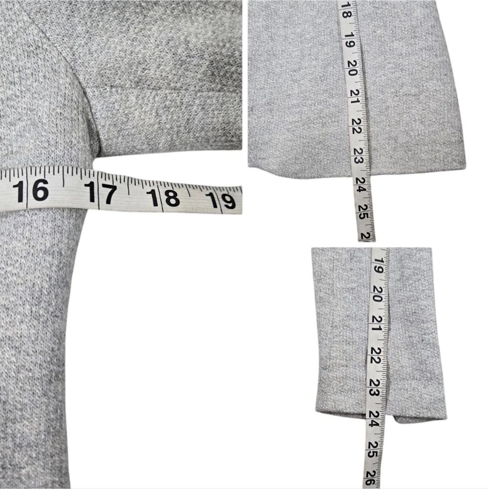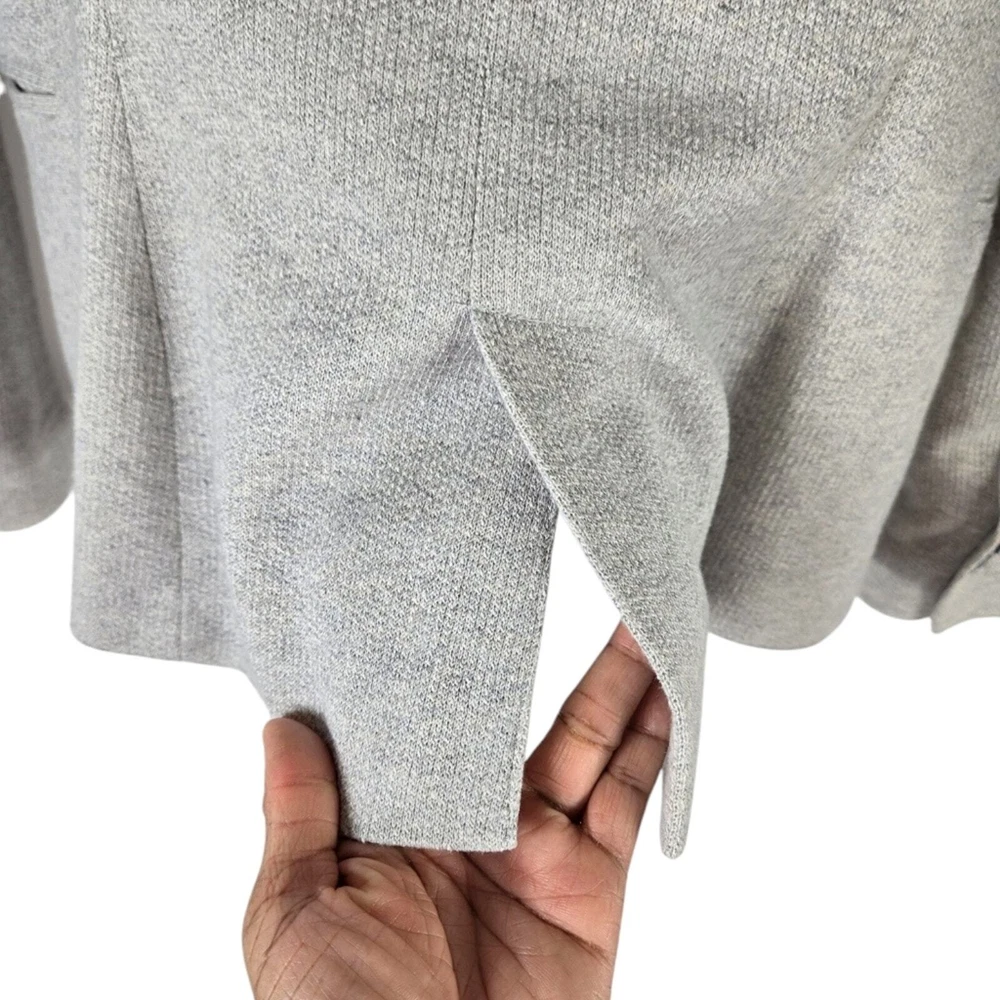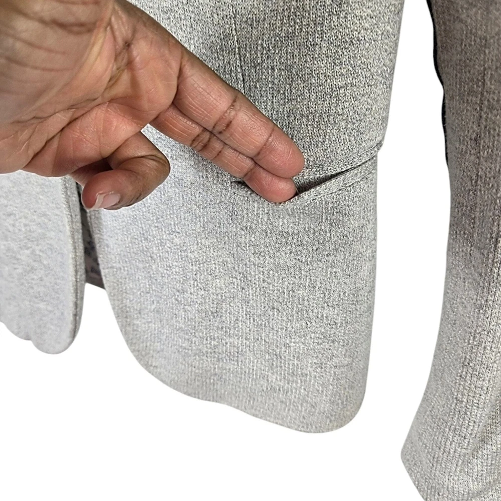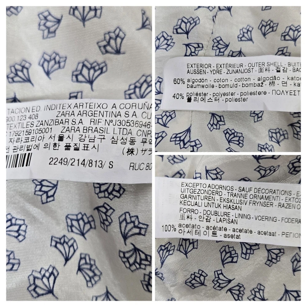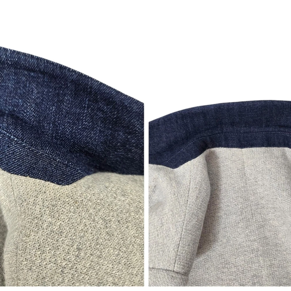 Zara Single Buttoned Denim Elbow Patch Grey Blazer. Size S. Single button, lapel collar, two welted front pockets, denim elbow patches, as well as denim on back collar, buttoned cuffs, and fully lined blue geometric pattern. Measurements are approximate. Blazer in good preowned condition. chest 17" sleeve 24" length 23" material 60% cotton 40% polyester lining:100% acetate stretch No N1145 11/12