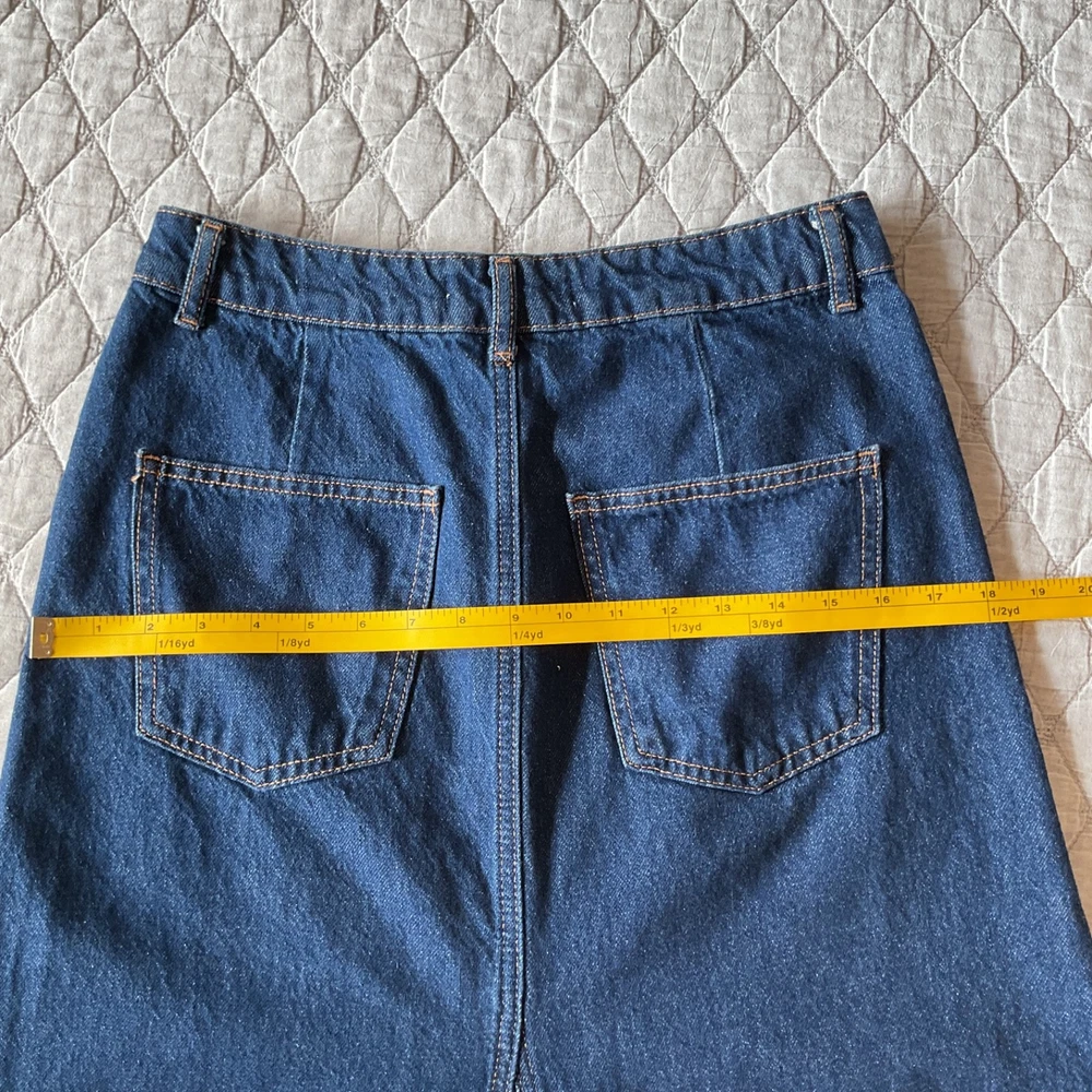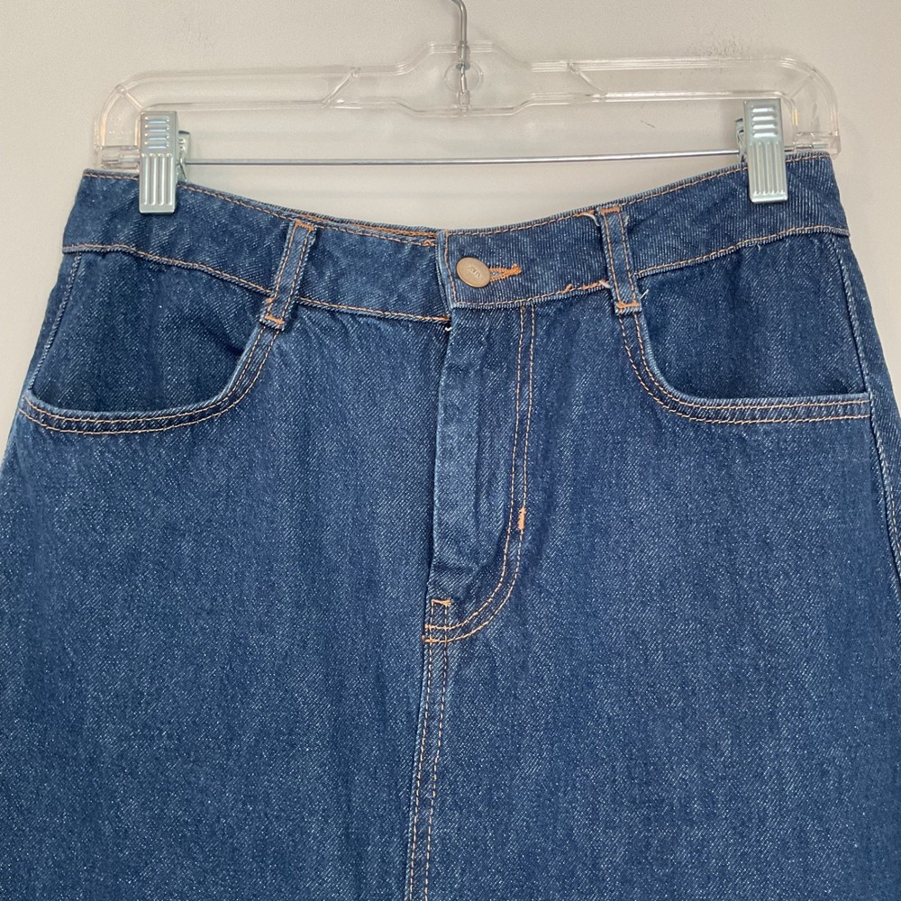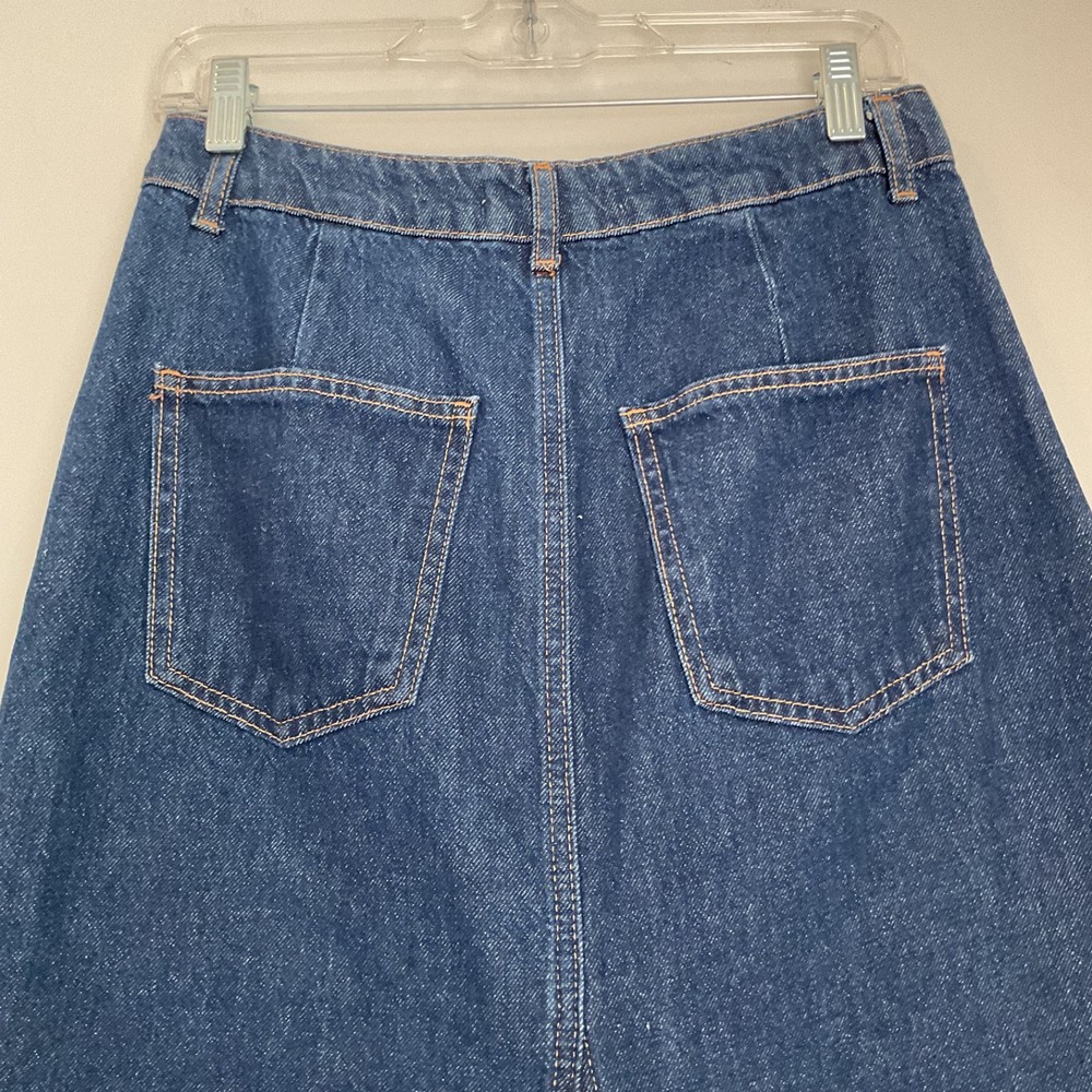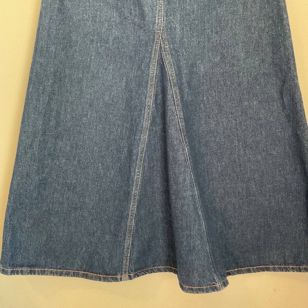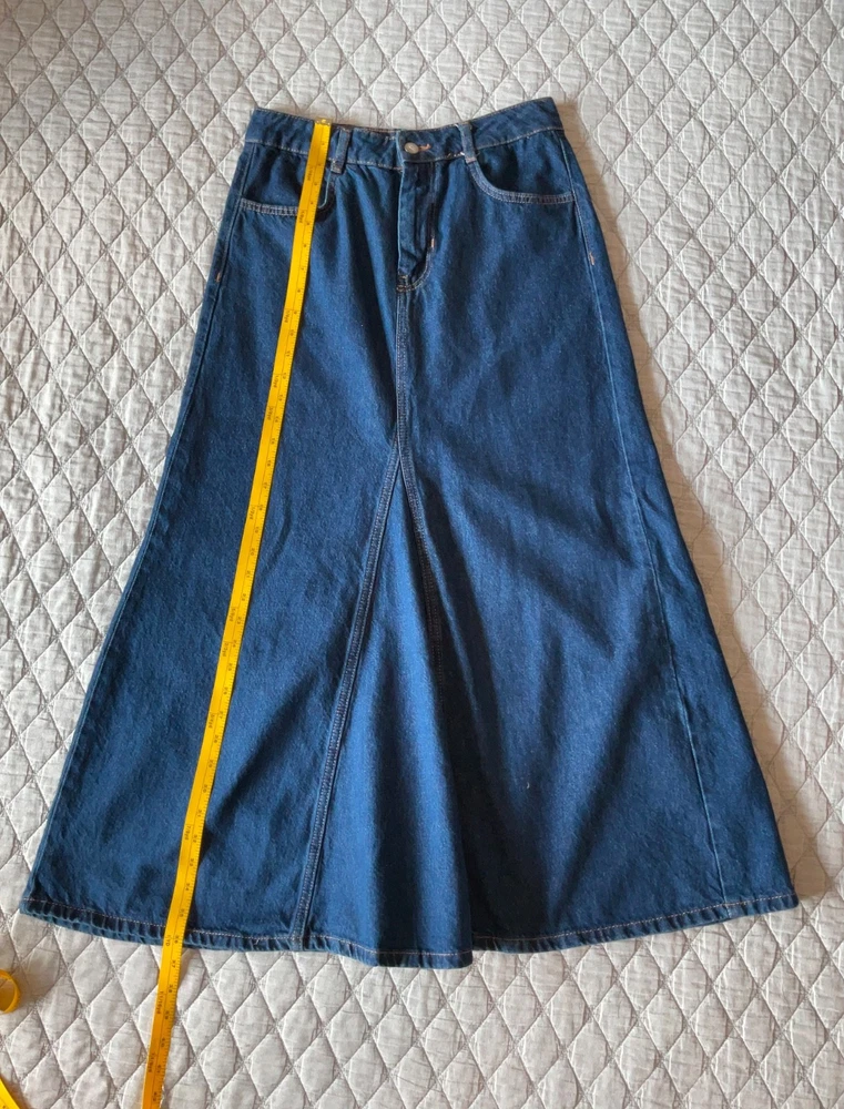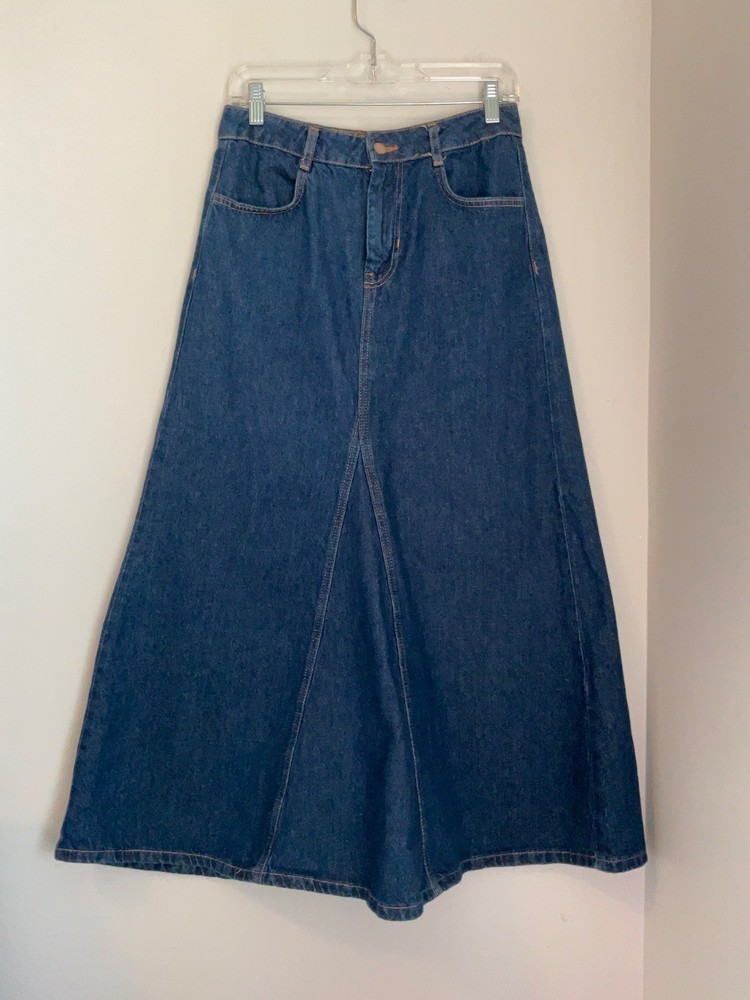 The Zara Denim Maxi Skirt in women's size S is a stylish and versatile addition to any wardrobe. This A-line long skirt features a solid blue color with a high rise and zip closure, perfect for casual occasions or travel. Made of denim fabric and accented with buttons and zippers, this skirt offers a trendy 90s Y2K vibe with a vintage twist. Perfect for all seasons, this skirt is lined for added comfort and quality, making it a must-have for fashion-forward women looking for a unique and chic alternative to traditional denim pieces. Measurements Waist : 13.5”(26-27) Hip: 18” (36) Length : 36” Condition : Good