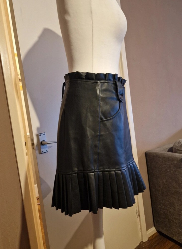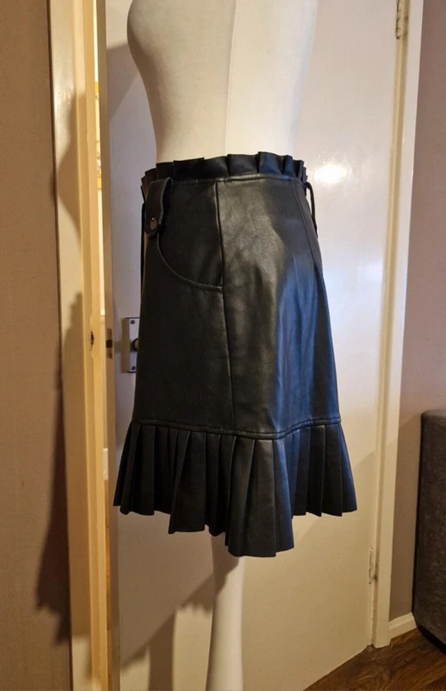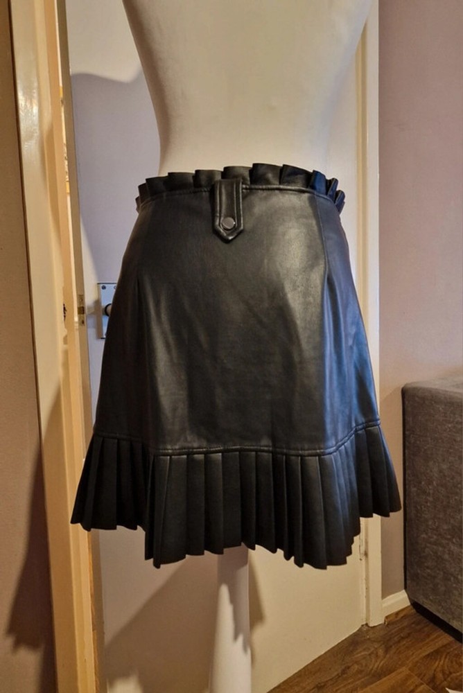Zara faux leather pleated skirt - Size medium. Worn once, immaculate condition. Ruffle pleated detailing on the hem and waist. Chrome studded belt loops. Zip fastening with pockets.