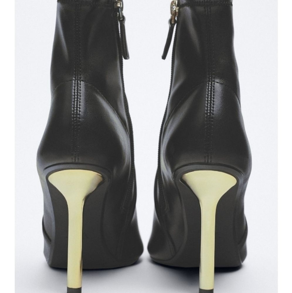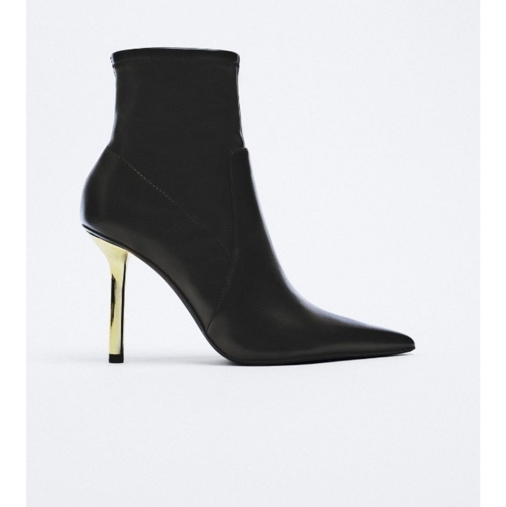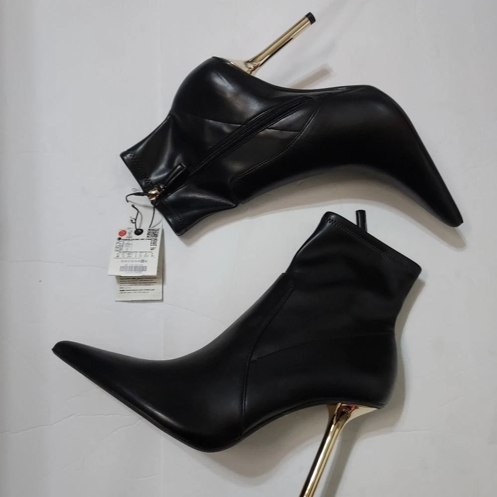 heeled ankle boots, metallic stiletto heels, pointed toe, side zipper, stretchy shaft, pointed toe