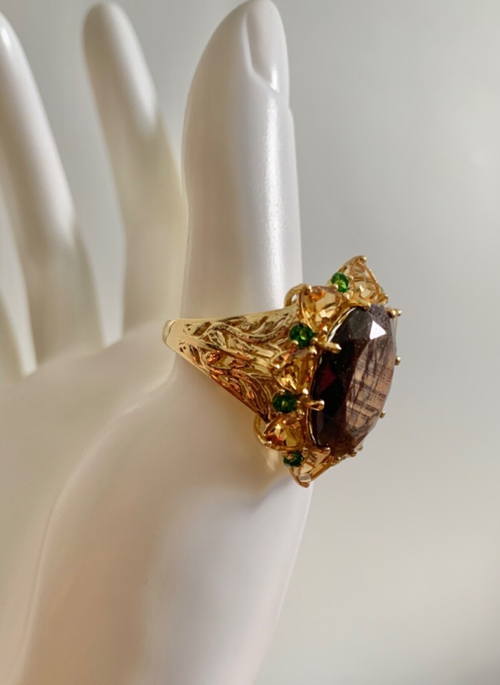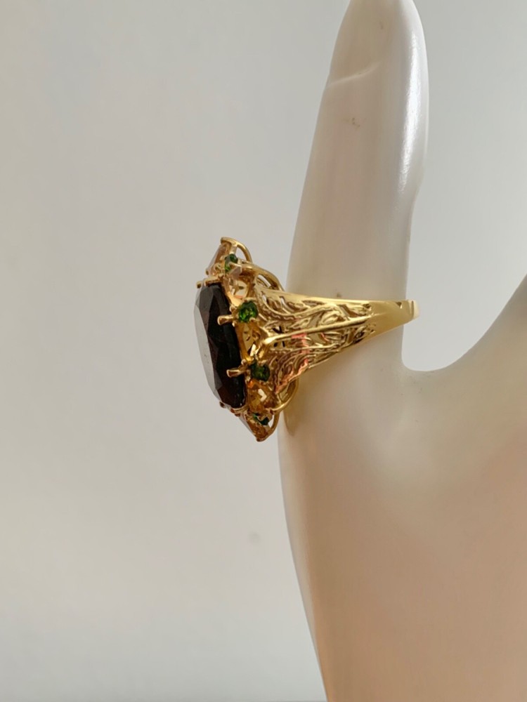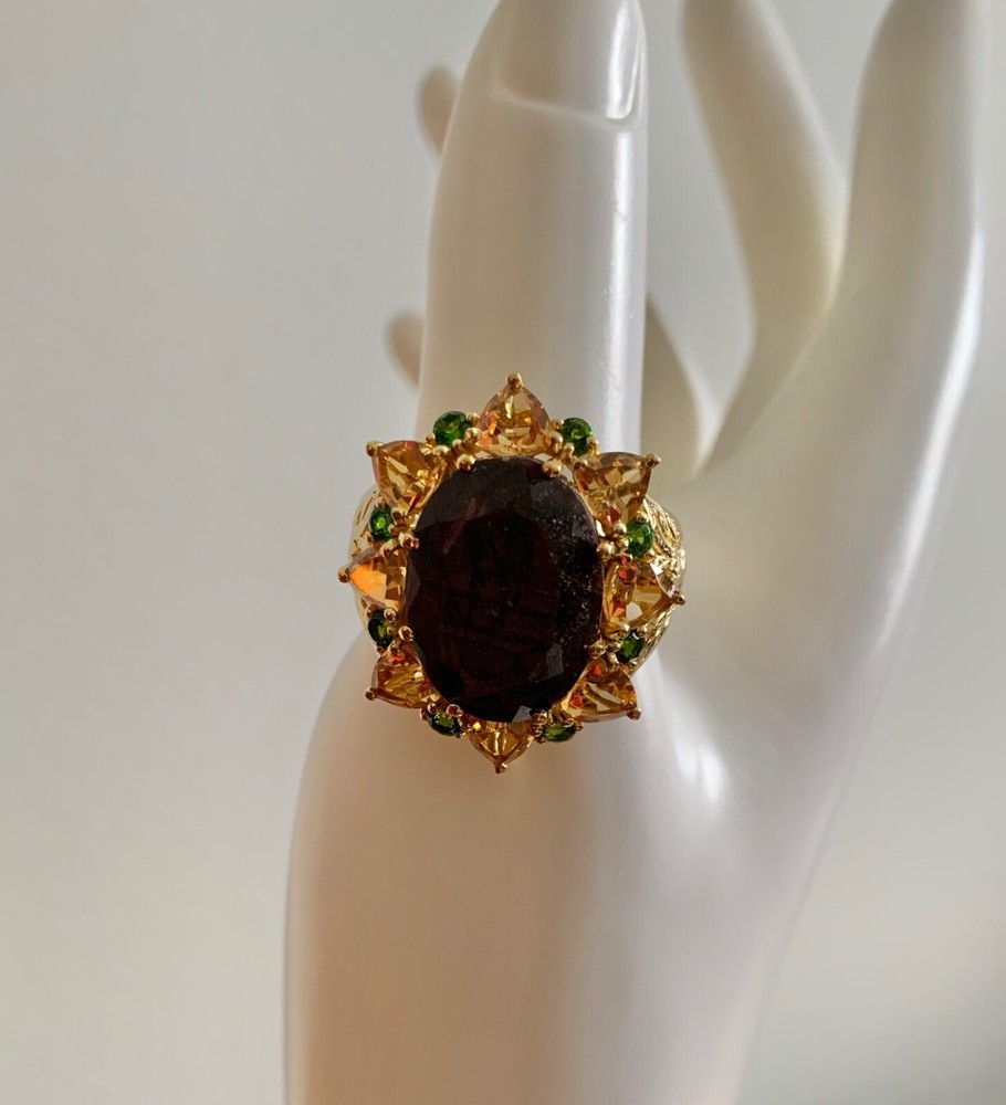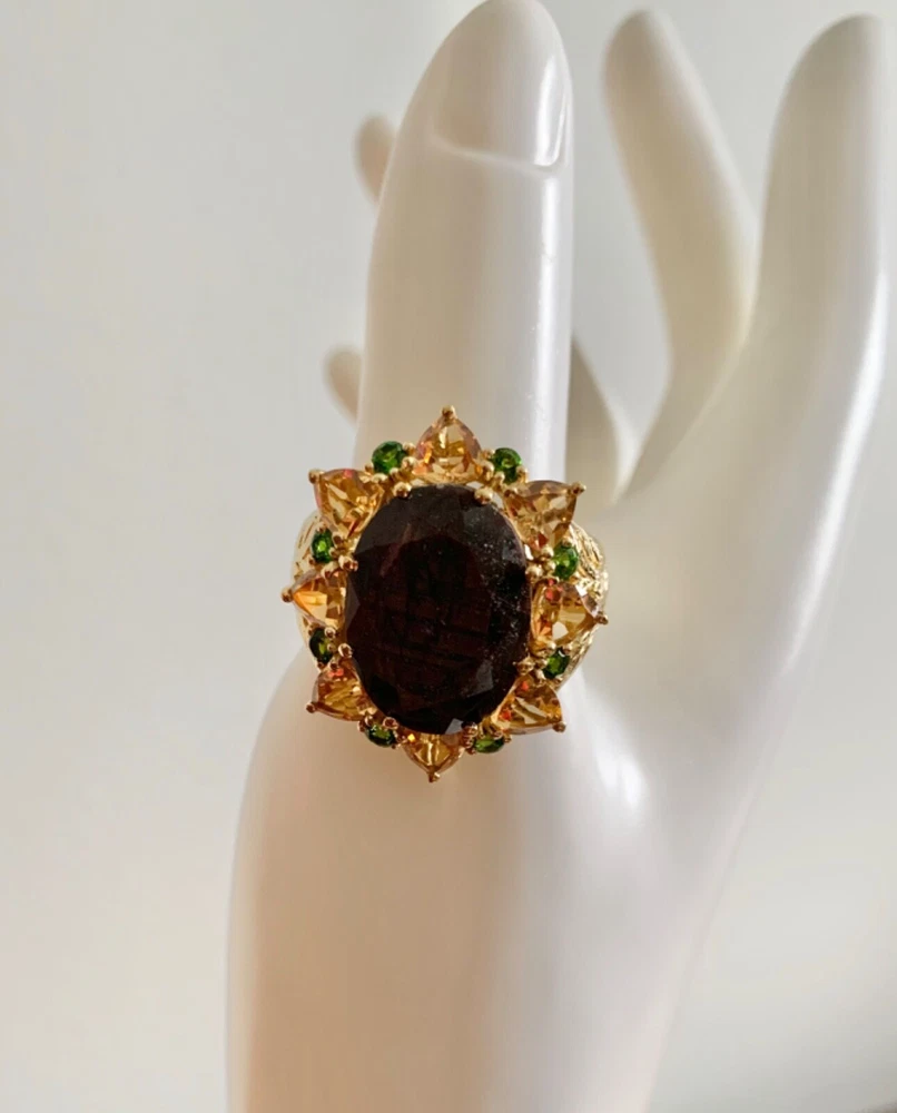 Elevate your jewelry collection with the Zawadi Chocolate Sapphire, MultiGemstone (Citrine and Chrome Diopside) Floral Ring, a size 10 piece that boasts a rich blend of natural beauty and sterling craftsmanship. The oval-shaped, chocolate sapphire centerpiece is complemented by an array of gemstones, creating a floral motif that exudes sophistication and charm. Crafted by D'Joy, this ring features an 18K vermeil yellow gold plating over 925 sterling silver, ensuring a lustrous finish that enhances its elegant design. The brown hues of the main stone harmonize with the multifaceted brilliance of the secondary gemstones, making this piece a versatile accessory for both casual and formal occasions.