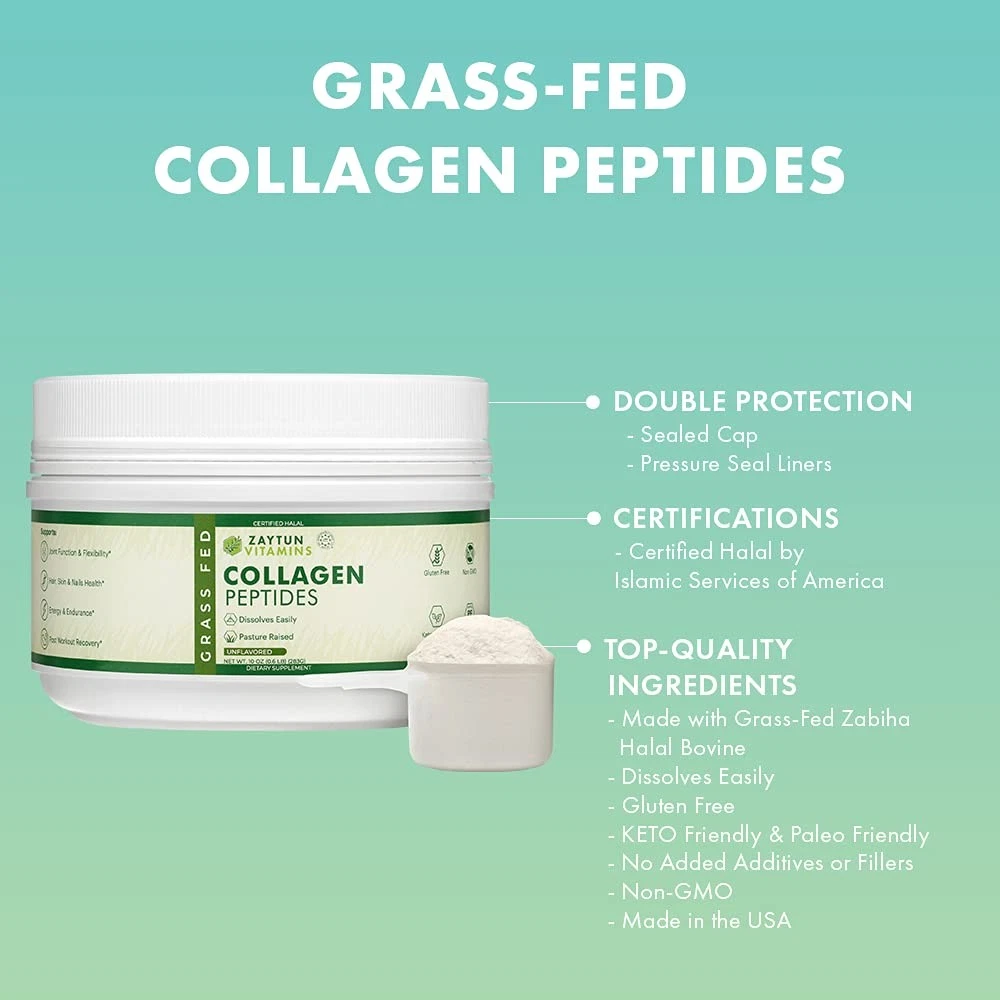 Incorporating halal collagen peptides into your body is as easy as taking a sip of your favorite beverage. You might have already heard that hydrolyzed collagen is great for skincare- but, did you know that it’s a completely natural substance found in your skin, hair, muscles, and joints? A young, healthy body with luminous skin, shiny hair, and flexible joints is rich in natural collagen peptides. However, as you age, those precious collagen stores deplete, and you lose that source of energy and endurance, while your joint, skin, and hair health begin to suffer. Revive natural collagen to help you recover faster from physical activity, give energy and to your movement, and enhance your skin, nails, and hair’s natural beauty with this halal vitamin formula collagen powder from . This unflavored, odorless, easy-dissolve collagen powder is a great collagen peptide source that fits into any diet and lifestyle. Deliver pure, potent hydrolyzed collagen and see, and feel, the results. Say goodbye to those collagen powder brands that are stuffed with non-effective filler ingredients and unnecessary additives with this natural halal collagen powder solution. Zaytun’s safe and healthy formula is produced in facilities inspected by the FDA, and sourced from grass-fed and pasture-raised, preservative-free, pork-free sources. If you need a keto-friendly collagen powder, or a gluten-free, paleo alternative collagen peptide, look no further for the easiest collagen peptide to incorporate in your daily life. Promote joint health, muscle health, beautiful hair, skin, and nails, and even a healthy gut, in just minutes. Simply mix, stir, or shake one scoop of this collagen powder into any liquid, hot or cold. Unlike other collagen powder brands that advertise their collagen peptides as tasteless and odorless but still have a weird funky aftertaste, this formula is truly undetectable even when dissolved in water. POTENT HYDROLYZED COLLAGEN: grass-fed collagen powder has more servings per its container than competing brands, containing only essential amino acids to help support joint, gut, muscle, hair, skin and nails health. SUPPORTS JOINTS HEALTH: Retain or regain a wider range of flexibility in your muscles and joints and infuse natural energy and endurance with our halal collagen containing pure hydrolyzed collagen, a great halal collagen for any aging person. SUPPORTS SKIN AND NAILS: Collagen is a natural essential vitamin if you want to retain youth and vitality in your skin, hair, nails, joints, muscles, and gut. After you reach a certain age, the collagen that your body naturally contains starts depleting, and your skin loses its fullness and elasticity. This collagen peptide powder incorporates natural essential amino acids into any diet with ease. NO FILLERS, ADDITIVES, JUST HYDROLYZED COLLAGEN: Pasture-raised, grass-fed sources are responsible for the essential amino acids that make collagen peptides give that immediate natural glow and healthy feeling from within. Our hydrolyzed collagen peptide formula is designed to only deliver pure results, with no fillers, additives, or preservatives, unlike other collagen powders. 100% HALAL CERTIFIED: halal collagen powder is manufactured in USA and certified Halal by the Islamic Services of America (ISA) and produced in GMP certified facility.