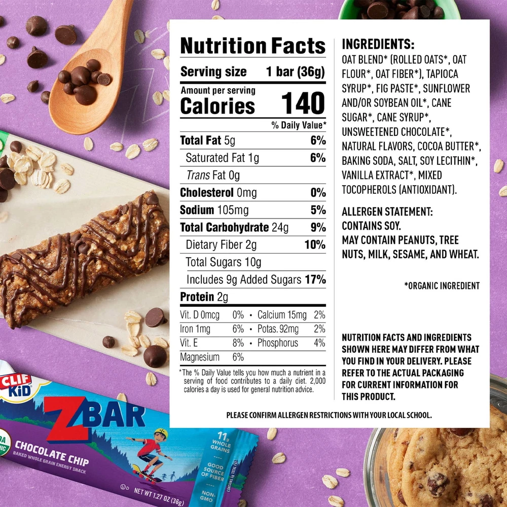 Crafted specially for kids, Clif Kid Zbar snack bars are lunchbox-ready with a chewy, soft-baked texture. Made with wholesome, plant-based ingredients like organic rolled oats, each bar has 10-12g of whole grains. Zbar is USDA Organic and non-GMO with no high fructose corn syrup, artificial flavors, or synthetic preservatives. DELICIOUS TASTE: All the thick, chewy, goodness of a chocolate chip cookie – gone nutritious! (packaging may vary) SOFT-BAKED & WHOLE GRAIN: Zbar is an organic, soft & chewy snack bar with 10-12g whole grains per bar, and it is also a good source of fiber ORGANIC & NON-GMO: Clif Kid cares about the planet just as much as your kids - that is why Zbar is certified USDA Organic, Non-GMO, and Climate Neutral Certified GO-TO FOR PARENTS: Zbar is lunchbox ready, free from ingredients that parents are looking to avoid, such as high fructose corn syrup, artificial flavors, and synthetic preservatives DESIGNED TO NOURISH: Zbar is made with a blend of carbohydrates, fiber, protein, and fat to keep kids satisfied at snack time and give them energy to keep zipping and zooming throughout the day Our mission at Mondelēz International is to create more moments of joy and build the best snacking company in the world by growing our people, growing our business and growing our impact on the world around us