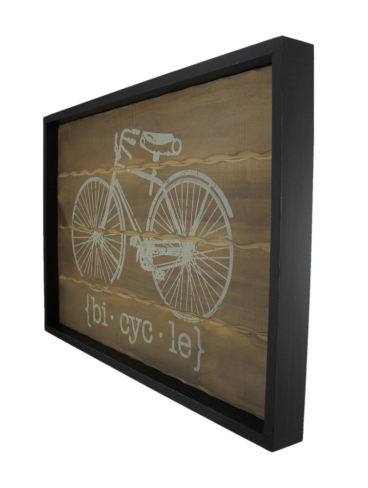 This beautiful wooden piece of wall art features a retro style bicycle in white paint against a natural wood background. The wall hanging measures 24 inches long, 15 3/4 inches high and 1 3/4 inches deep. It has an aged, distressed finish and a dark espresso frame. It hangs easily on your wall and makes a great gift. Our eBay Store About Us Add to Favorite Sellers Distressed Finish Retro Bicycle Wooden Wall Hanging 24 Inches Long, 15 3/4 Inches Tall, 1 3/4 Inches Deep Made of Wood Distressed Finish Hangs Easily On Your Wall Makes A Great Gift Item Description: This beautiful wooden piece of wall art features a retro style bicycle in white paint against a natural wood background. The wall hanging measures 24 inches long, 15 3/4 inches high and 1 3/4 inches deep. It has an aged, distressed finish and a dark espresso frame. It hangs easily on your wall and makes a great gift. Special notes for our International customers: Import duties, taxes, and any other customs charges are not included in the item price or shipping charges. These charges are the buyer's responsibility. These charges are normally collected by the delivering freight (shipping) company or when you pick the item up - please do not mistake them for additional shipping charges. We do not mark merchandise values below value or mark items as gifts, US and International government regulations prohibit such behavior.