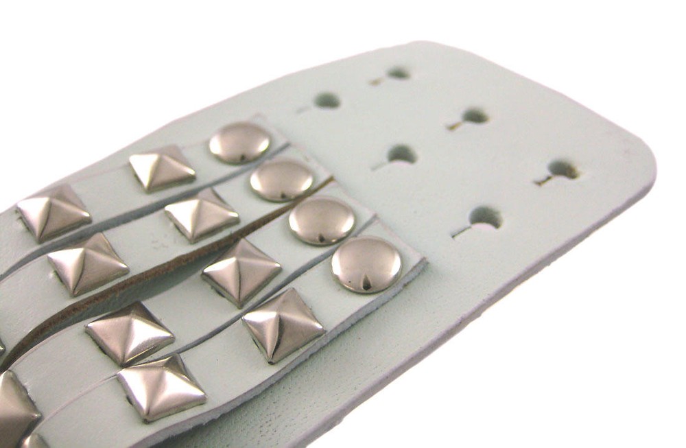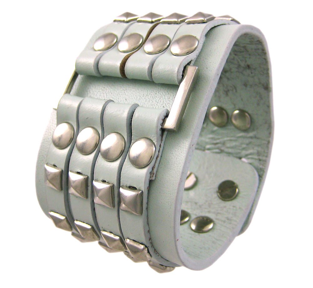 This wristband is a total standout! The gray leather looks sleek, and the chrome pyramid studs add serious edge. It’s well-made, fits comfortably, and the triple tab closure keeps it secure. Perfect for anyone who loves bold, rocker-inspired accessories. Definitely a great gift—stylish and unique!