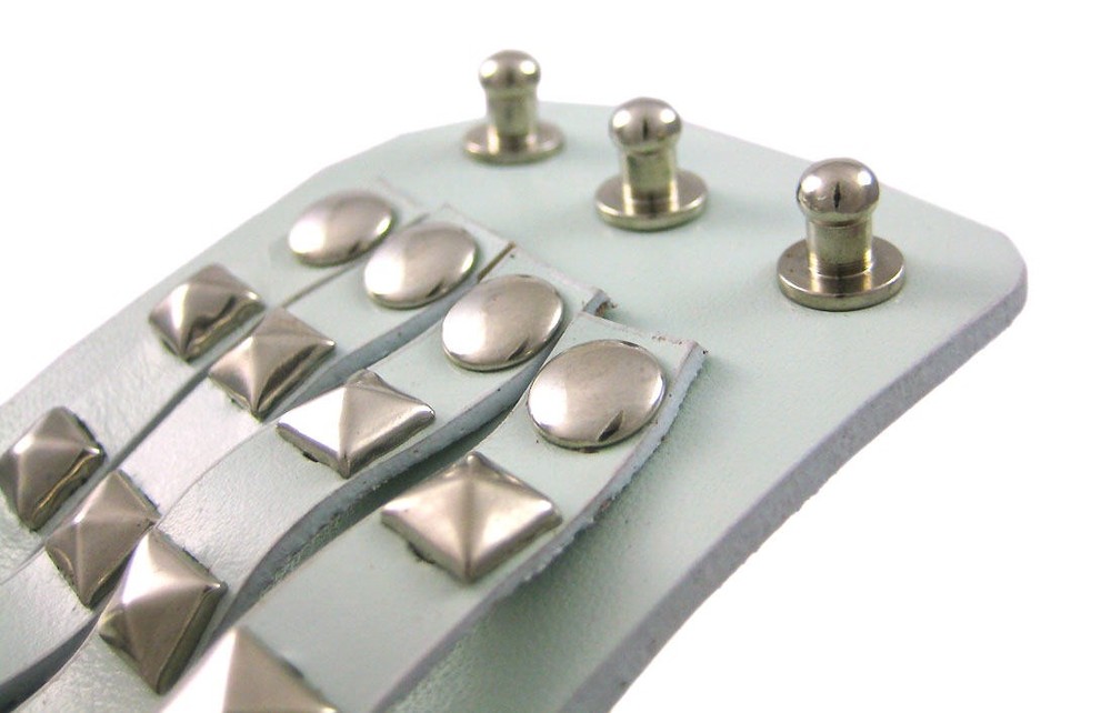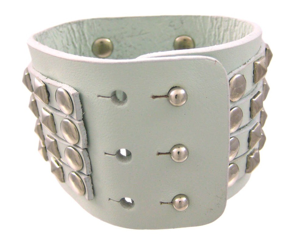 This wristband is seriously cool—the gray leather looks sleek, and the chrome pyramid studs add just the right amount of edge. The gauntlet style fits snugly but comfortably, and the triple tab closure keeps it secure. Perfect for anyone who loves bold accessories—great quality and stylish detail!