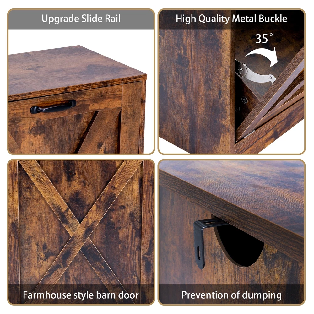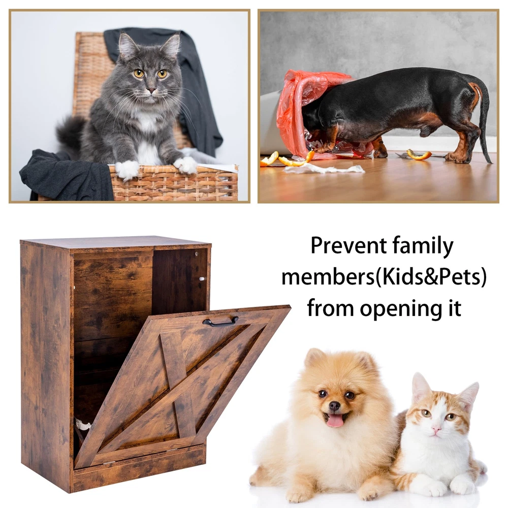 【SPACE SAVING】: The pull-out cabinet add hidden storage space for trash can. The top of the cabinet also provides additional display space to hold coffee machines, microwaves, cooking utensils, bathroom toiletries and some other decorations. 【SIZE& KEEP CLEAN】: 22.1"L x 13.8"W x 31.1"H (NOT include trash can). It's an exact match to a 13-gallon trash can. It's great for keeping the kitchen nice and the floor clean. This trash can cabinet will prevent odors and your pet will never knock over the trash can again. 【DURABLE & STABLE】: The wooden trash cabinet uses a vintage barn door design with rust-proof hinges and iron handles. Its stability is ensured by its strong wooden structure. 【MULTIFUNCTIONAL FURNITURE】: Wooden tilt out trash cabinet can be used not only as kitchen trash cans and recycling bins, but also as 13-gallon laundry baskets, storage baskets for clothes and toys, and storage cabinets for pet food. In addition, it is a good choice to use as a side cabinet, elegant porch cabinet. 【INSTALLATION & ATTENTION】: Provide detailed instructions to help you install the trash cabinet. If you have any questions about the product, please feel free to contact us, your satisfaction is our top priority.