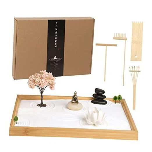 Return Policy Fast Delivery Trusted seller Zen Garden Kit for Office Desk, Japanese Meditation Decor Sand Art with Tray/Buddha Statue/Handmade Ceramic Lotus Incense Holder/Zen Accessories, Spiritual Gift for Women Men Yoga Mind Relaxation Product Description Less Is More - With the purpose of “move the viewer from a cluttered mind to a state of focused mind”, our zen garden kit is designed with the vital elements of large-scale zen gardens. The miniature dry garden comes with a 13x8.6” bamboo tray, buddha statue, lotus incense holder, sand, rocks, cherry tree, mini plants and 4 miniature zen tools. Create your own meditative place to rest the mind! Smooth Mind, Bring Calm - Combing and arranging a zen garden is a very calming and relaxing activity! Japanese zen gardens create a sense of peace, harmony and tranquility. Often taking a moment to meditate is impractical in an office setting, but this mini desktop zen garden makes it happen. Definitely help bring harmony between our busy daily lives and nature! Valuable Zen Accessories - Compared with other resin statue, our Buddha statue is made of pure copper, lightweight, corrosion-resistant and long-lasting. Handmade ceramic lotus works with as an incense holder, fragrance diffuser (just spray perfume on it) and tabletop decor. 4 different zen tools allows you to design freely. Add Peaceful Aura To Your Decor - Japanese gardens are havens of beauty, tranquility and cultural landscapes, and places for natural healing. It is great for office workspace, offering you a relaxing break from computer work. Also a meditative decor for living room, bedroom, study room or guest room. Ideal Spiritual Gift - Looking for a special, mindful gift? Try our Japanese zen garden, allowing to connect with nature and cultural art. A fascinating gift to help combat stress and anxiety during hectic moments. Nice companion for work, yoga, fitness and relaxation. Shipping Returns Payment Shipping Shipping is FREE to all addresses other than APO/PO boxes in the lower 48 states. All our stock ships from US-based warehouses. Shipped via USPS or UPS (depending on location and package weight) Unless stated otherwise, all orders will ship within 24-72 hours of your payment being processed. Check our feedback to see the great reviews of FAST shipping we offer. Returns Seller does not accept returns Payment We currently accept payment via eBay managed payments only. Once payment is cleared, we will dispatch your shipment within 1-3 business days. Please refer to the "Shipping" tab for more information regarding shipping speed to your destination.