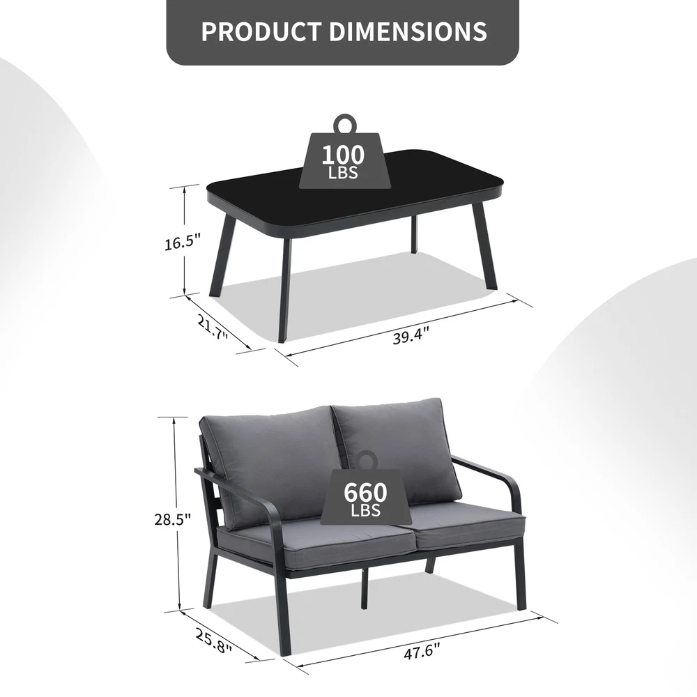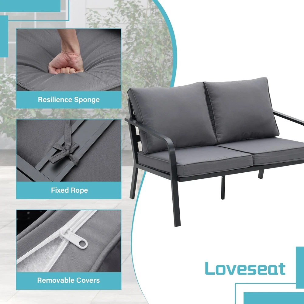 Create a relaxing outdoor space with this 2/4 Pieces Outdoor Sectional Sofa Sets. Spend your leisure time in comfort with this stylish and durable outdoor furniture set.Features: Excellent All-Aluminum Frame: Zenova 4 piece modern patio furniture set is made of a powder-coated aluminum frame that is both solid and durable while being lightweight for easy handling and storage. The surface of aluminum will naturally form an oxide layer and can protect itself from rusting, fading, and corroding in all kinds of weather. Ergonomic for Everyone: The carefully calculated seat depth accommodates the widest range of heights, alleviating pressure points and preventing perpetual slouching.The cushions gently form to your body for tailored support. Comfortable Cushions: Zenova patio Free Shipping Over $49.99* Details Zenova 4 Piece Aluminum Patio furniture Set Outdoor Sectional Sofa with Coffee Product Description: Create a relaxing outdoor space with this 2/4 Pieces Outdoor Sectional Sofa Sets. Spend your leisure time in comfort with this stylish and durable outdoor furniture set. Features: Excellent All-Aluminum Frame: Zenova 4 piece modern patio furniture set is made of a powder-coated aluminum frame that is both solid and durable while being lightweight for easy handling and storage. The surface of aluminum will naturally form an oxide layer and can protect itself from rusting, fading, and corroding in all kinds of weather. Ergonomic for Everyone: The carefully calculated seat depth accommodates the widest range of heights, alleviating pressure points and preventing perpetual slouching.The cushions gently form to your body for tailored support. Comfortable Cushions: Zenova patio conversation set with high-quality sponge filled seat and back cushions give you extra comfort, enjoy your leisure time whatever sitting or lying ,suitable for entertaining your neighbors or friends and family. And the machine-washable covers can be removed for easy cleaning and maintenance. Moreover, there are 2 straps under each cushion, which can be easily tied to the frame to prevent movement Non-Slip Foot Pads: Featuring non-slip foot pads, Zenova patio chairs ensure a secure grip on various types of surfaces, providing enhanced stability. Additionally, the non-slip plastic foot pads also protect your floors from scratches or damage caused by friction. Easy assembly: This outdoor patio furniture set comes with all hardware & necessary tools. Follow the instruction, you can easily and quickly assemble the outdoor sofa set. NOTEplease try to line the hole together in all side, do not over tight one hole, then try to tight it slowly in each side, do not tighten the screws until you align all the holes of the patio sofa. Additional Details: ColorGrey Limit Weight:100-600 lbs Frame MaterialAluminum , Black Powder Coated Cushion Fabric160g/ polyester fabric and 22D sponge Armrest3.15'' W Cushion Thickness3.15 Love-seat Dimension47.6"L x 25.8"W x 28.5"H Coffee Table Dimension39.4"L x 21.7"W x 16.5"H