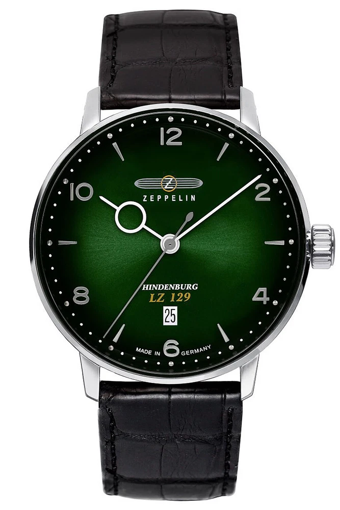 Zeppelin Men's Watch LZ129 Hindenburg Leather Strap Black / Green 8048-4 The description of this item has been automatically translated. If you have any questions, please feel free to contact us. Zeppelin Men's watch LZ129 Hindenburg leather strap black / green 8048-4 classic men's wristwatch from the LZ 129 Hindenburg series, Made in Germany, precise Swiss Made quartz movement ETA F06.111, date display, dark green dial, raised silver-colored numbers and indexes, black hour and minute hands, central second hand, polished stainless steel case, decorated case back, fluted crown, domed K1 mineral glass, black leather strap with crocodile embossing, polished stainless steel pin buckle, water resistant up to 5 bar, diameter (without crown) 40 mm, height 10 mm Features of the Zeppelin watch: Department: Men Strap width: 20 mm Strap color: Black Case thickness: 10 mm Case color: silver Case shape: Round Case size: 40 mm Case material: stainless steel Country and region of manufacture: Germany Maximum wrist circumference: 20.1-21 cm Product type: Men's watches Series: LZ129 Hindenburg Movement: Quartz Closure: pin buckle Water resistance: 5 bar Dial color: Green Special features: Date display Mineral glass Swiss movement You can find the large selection of Zeppelin watches in the uhrcenter eBay Shop: Zeppelin Watches at uhrcenter Information according to ElektroG You are legally obliged to return old electrical appliances. Old electrical appliances must not be disposed of in household waste, but must be collected separately. For this reason, electrical appliances are marked with the crossed-out garbage can. The substances contained in old electrical appliances can be reused. Please separate batteries, accumulators and lamps that are not enclosed in the old electrical device before handing it in. We are legally obliged to take back old electrical devices free of charge. You can return your old electrical appliance to us free of charge when you purchase a comparable new electrical appliance. When we deliver the new electrical appliance, we will collect the old appliance free of charge. This free collection is limited to waste equipment in the categories of heat exchangers, screens, monitors and equipment containing screens with a surface area of more than 100 square centimetres, and large appliances. Regardless of whether you purchase a new electrical appliance, you can return an old appliance that is no larger than 25 cm in any dimension to us free of charge. If you would like to return an old electrical device to us, please request a shipping label using the contact details provided in the seller's imprint. Please note that you are responsible for deleting personal data from the devices to be disposed of. Note according to the Battery Act Since our shipments may contain batteries and rechargeable batteries, we are obliged under the Battery Act (BattG) to inform you of the following: Batteries and rechargeable batteries must not be disposed of in household waste; you are legally obliged to return used batteries and rechargeable batteries. Used batteries may contain harmful substances that can harm the environment or your health if not stored or disposed of properly. However, batteries also contain important raw materials such as iron, zinc, manganese or nickel and can be recycled. You can either return the batteries to us after use or return them free of charge to a nearby retailer or municipal collection point or to our shipping warehouse. The sale in sales outlets is limited to the quantities usual for end users and to those used batteries that the distributor has or has had in its range as new batteries. The symbol with the crossed-out garbage can means that you must not dispose of batteries in household waste. Under this symbol you will also find the following symbols with the following meaning: Pb: Battery contains lead Cd: Battery contains cadmium Hg: Battery contains mercury uhrcenter Watches & Jewellery Top Brands Zeppelin Men's watch LZ129 Hindenburg leather strap black / green 8048-4 classic men's wristwatch from the LZ 129 Hindenburg series, Made in Germany, precise Swiss Made quartz movement ETA F06.111, date display, dark green dial, raised silver-colored numbers and indexes, black hour and minute hands, central second hand, polished stainless steel case, decorated case back, fluted crown, domed K1 mineral glass, black leather strap with crocodile embossing, polished stainless steel pin buckle, water resistant up to 5 bar, diameter (without crown) 40 mm, height 10 mm Abteilung Herren Armbandbreite 20 mm Armbandfarbe Schwarz Armbandmaterial Leder Anzeigeformat Analog Besonderheiten Datumsanzeige Besonderheiten Mineralglas Besonderheiten Schweizer Uhrwerk Gehäusedicke 10 mm Gehäusegröße 40 mm Gehäusematerial Edelstahl Herstellungsjahr 2020-Heute Herstellungsland und -region Deutschland Marke Zeppelin Maximaler Handgelenkumfang 20,1-21 cm Modell LZ129 Hindenburg Produktart Armbanduhr Stil Lässig Stil Kleid/Formell Uhrenform Rund Uhrengehäuse-Farbe Silber Uhrwerk Quarz Verschluss Dornschließe Wasserdichtigkeit 5 bar Zifferblattfarbe Grün EAN 4041338804843