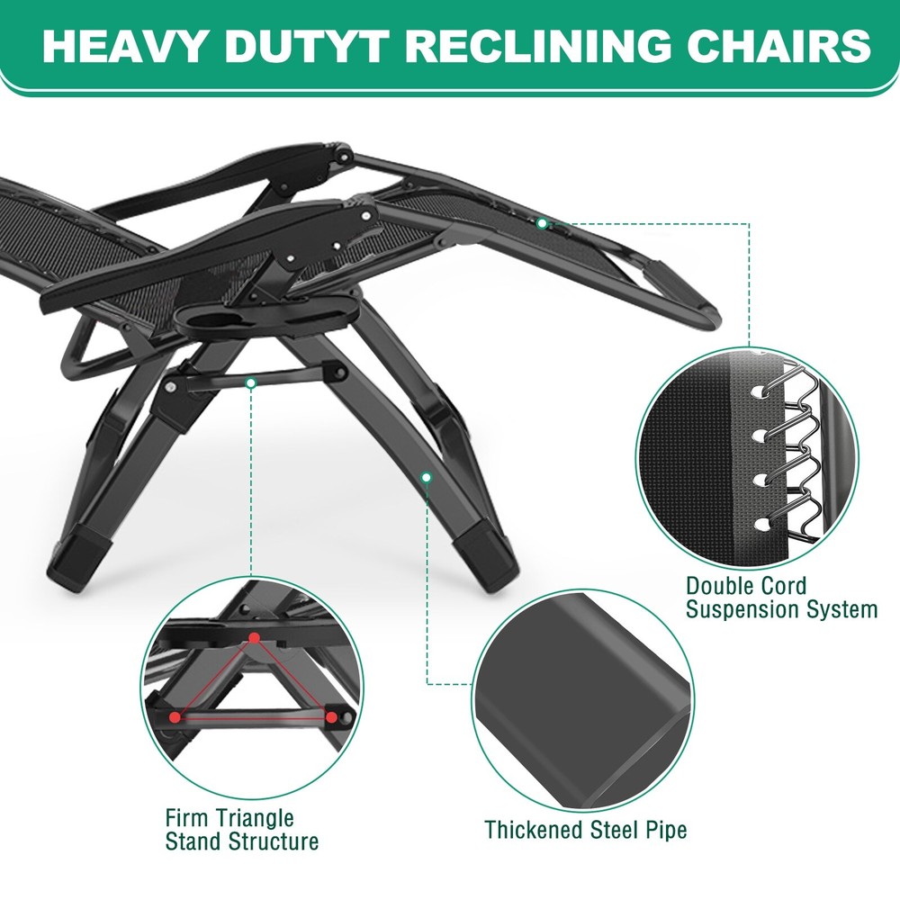 DoCred Zero Gravity Chair, outdoor lounge recliner, indoor folding chair for adults and children. With cup holder, you can store your cups, magazines and other items. Comes with removable cushion to bring you a comfortable experience and with straps to securely fasten the cushion to the chair. The chair can be adjusted up to 170°, you can customize your leisure experience. Suitable for both indoor and outdoor use.Features: Strong weight capacity, up to 440 lbs. Adjustable up to 170° with locking system to easily secure the chair in the desired position. Foldable and lightweight for easy storage and transportation. The cushion is removable to ensure breathability in summer and bring you warmth in winter. Extra large size, giving you enough space to relax. With armrests and footrests Free Shipping Over $49.99* Details Zero Gravity Chair, Reclining Chaise Lounge with Removable Cushion - 26"×28"×45" Product Description: DoCred Zero Gravity Chair, outdoor lounge recliner, indoor folding chair for adults and children. With cup holder, you can store your cups, magazines and other items. Comes with removable cushion to bring you a comfortable experience and with straps to securely fasten the cushion to the chair. The chair can be adjusted up to 170°, you can customize your leisure experience. Suitable for both indoor and outdoor use. Features: Strong weight capacity, up to 440 lbs. Adjustable up to 170° with locking system to easily secure the chair in the desired position. Foldable and lightweight for easy storage and transportation. The cushion is removable to ensure breathability in summer and bring you warmth in winter. Extra large size, giving you enough space to relax. With armrests and footrests for more comfort. Removable headrest with adjustable height. No need to assemble, open and ready to use. Specification: NameZero Gravity Chair, Reclining Chaise Lounge, Folding Chair Frame materialsteel tub ColorGreen Outer frame size26" x 28" x 45" Folded size26" x 37.4" Seat width20" Weight Capacity440 lbs Product weight18.7 lbs Cushion IncludedYes Removable CushionYes FoldableYes Usageparty, barbecue, beach, lawn, garden, patio, office, bedroom, etc., both indoor and outdoor. Packing List: 1 x Zero Gravity Chair 1 x Cushion 1 x Cup Holder 1 x Headrest