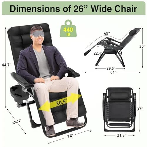 Cushion Style: Boxed Edge or Knife Edge Chair Backrest Width: 26 Inches Brand: Does Not Apply Fill Material: PP Cotton Included Components: 1 x Chair Cushion, 1 x Cup Holder, 1 x Pillow, 1 x Zero Gravity C Surface Recommendation: Hard Floor Finish Type: Brushed Theme: Outdoor Relaxation Style: Modern" or "Contemporary Country of Origin: China Furniture base movement: Glide Product Dimensions: 22"D x 26"W x 45"H MPN: Does Not Apply Color: Deep Black Product Care Instructions: Wipe Clean Furniture Finish: Teslin cloth Type: Does Not Apply Form Factor: Arc-shaped Age Range Description: Unisex Maximum Weight Recommendation: 440 Pounds Shape: Folding Lawn Chair Seat Height: 22.4 Inches Model Name: 15-1556 Room Type: Patio Garden Is Customizable: Yes EAN: Does Not Apply Item Weight: 22.2 pounds Seat Depth: 22 inches Manufacturer: Does Not Apply Indoor Outdoor Usage: Outdoor Unit Count: 1.0 Count Recommended Uses For Product: Office, Relaxing, Camping Back Style: Solid Back Pattern: Solid Special Feature: Ergonomic, Space Saving, Cup Holders, Foldable, Cushion Availabil UPC: 765142631153 Included Throw Pillow Quantity: 1 Is Foldable: Yes Item Width: 1 Number of Cup Holders: 1 Tilting: No gtin13: Does Not Apply Item model number: 15-1556 Item Length: 1 Item Height: 1
