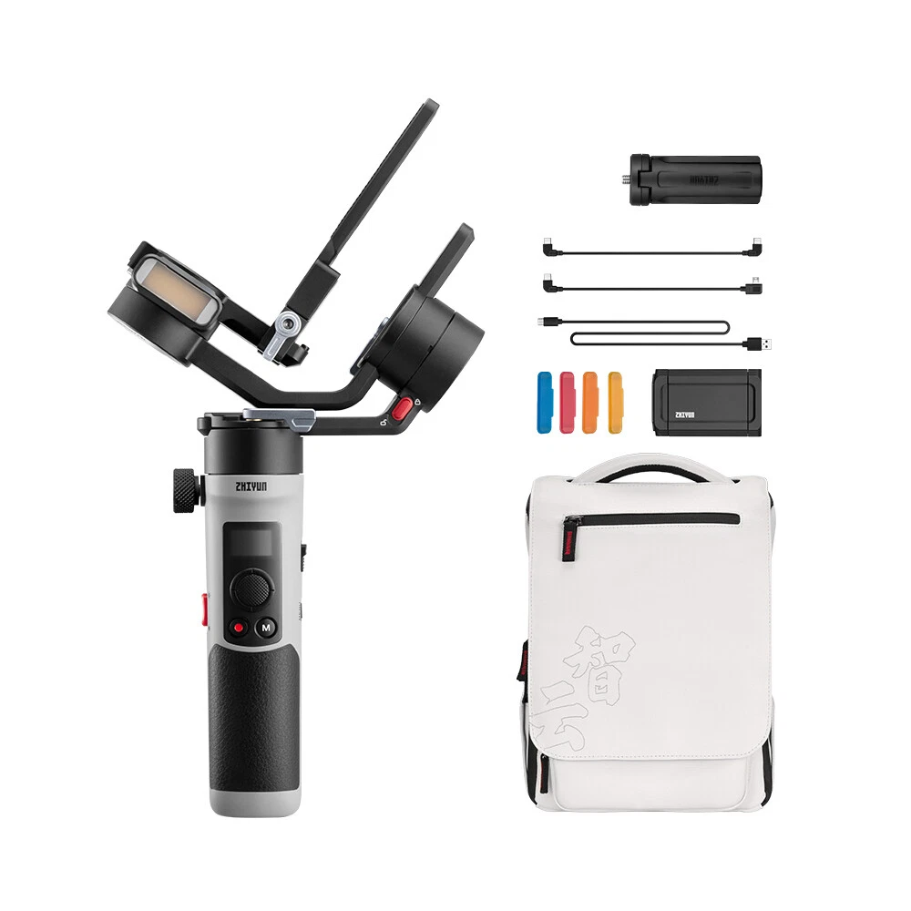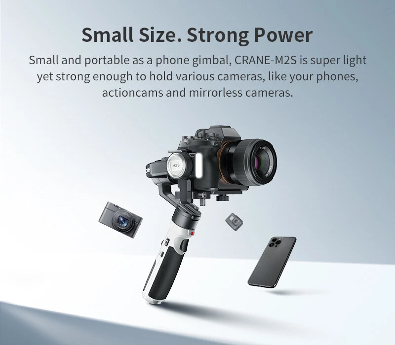 Product Description CRANE-M2S helps you explore more possibilities in filming with its brand new compact design, enhanced compatibility, and the newly-added fill light. Take it and embark on your next journey of creation. ZHIYUN CRANE-M2S Camera Compatible List V1.0 CRANE-M2S Camera Compatible Camera Panasonic DC-G100 Lumix G 25mm f/1.4; 25mm f/1.7; MACRO ;30mm f/2.8 ASPH MEGA OIS. X Vario 12-35mm f/2.8ⅡASPH POWER OIS LEICA DG SUMMILUX 15mm f/1.7 ASPH; Vario-Elmarit 8-18mm f/2.8-4.0 ASPH ; 12-32 0.2m/0.66ft DMC-GH4/GH5/GH5S LEICA DG SUMMILUX 15mm f/1.7 ASPH; 12-32 0.2m/0.66ft.DMC-/LX100M2/LX10/ZS110 (comes with the lens) Sigma FP 45mm F2.8 --- --- --- --- --- --- --- --- --- ZHIYUN CRANE-M2S Control List *Supports Video Filming(Save/Playback)/Camera Charging/Camera Charging(Camera Powered On) SONY FX3/a7R4/a7S3/a7C/ZV-E10aDSC-RX100M7; NIKON Zfc ; FUJIFILM X-T3/X-T4 *Supports Video Filming Save/Camera Charging/Camera Charging(Camera Powered On) SONY a7R3/a7R2/a7M3/a7M2/a7S2/a6600/a6500/a6400/a6300/a6100/ZV-1/DSC-RX100M6/DSC-RX100M5A/DSC-RX100M5/DSC-HX90/ZFC *Supports Video Filming(Save/Playback) CANON M50/M50 MarkⅡ/EOS M6 MarkⅡ/EOS R/EOS RP/EOS 200DⅡ/G7 X Mark III; PANASONIC GH5/GH5S; SIGMA fp *Supports Camera Charging —— PANASONIC DC-G100/DMC-ZS110/DMC-LX10/LX100M2; FUJIFILM X-A7 *Supports Video Filming( Save/Playback)/Camera Charging —— NIKON Z5/Z6/Z6Ⅱ/Z7/Z7Ⅱ/Z50 Next-level Quick Release CRANE-M2S comes with the newest quick release plate that's only seen on Zhiyun flagship gimbals. It features V-shape design and dual safety locks which ensure utmost safety and efficiency. You could also choose to upgrade to a universal balance-free quick realease plate for run-and-gun scenarios. Feel Just Right in Hand Handy and intuitive, the ergonomic product design guarantees a comfortable user experience. The built-in 0.66-inch display screen gets you well informed of the status and parameters of your camera and gimbal. Small size Small and portable as a phone gimbal. The 549g/1.12lb lightweight body, stronger motors, and extended axes make it a must-have for run-and-gun filmmakers. Power Up Fast Supports PD Fast Charge protocol. Charging time can be minimized to 1hr 41min. Runtime up to 10hrs. *Supports a maximum of 12W PD fast charge. The data is gathered from internal experiments of ZHIYUN laboratories. Please refer to actual use. Extra Bright in Tiny Light The integrated fill light adopts outstanding Lumen Amplifier technology to offer 1000 lumens of brightness in a 2.8c㎡ light source. The adjustable 5-level light and 4-color filters give you unlimited possibilities of creation in various filmmaking environments. CRI: 90+ Color Temperature Level: 5500K Strong Power CRANE-M2S is super light yet strong enough to hold various cameras, like your phones, action cams and mirrorless cameras. Stay Handy. Get Ready Packing List CRANE-M2S Stabilizer Mini Tripod Fill Light Filters EPP Carrying Case Type-C to Multi Sony Shutter Release Type-C Micro Camera Charging Cable Type-C to Type-C Camera Charging Cable TECH SPECIFICATION Operation Voltage: 9.6V - 12.6V Charging Current: 135mA - 4000mA Battery Capacity: 1150mAh Battery Runtime: 10H35min Charging Time: 1H41min Operation Frequency: 2.4GHz Display Screen Size: 0.66inch Tilt Mechanical Range 320 Roll Mechanical Range 320 Pan Mechanical Range 360 Controllable Tilt Angle -60 ~ +160 Controllable Roll Angle -30 ~ +30 Controllable Pan Angle 360 (Unlimited Rotation)