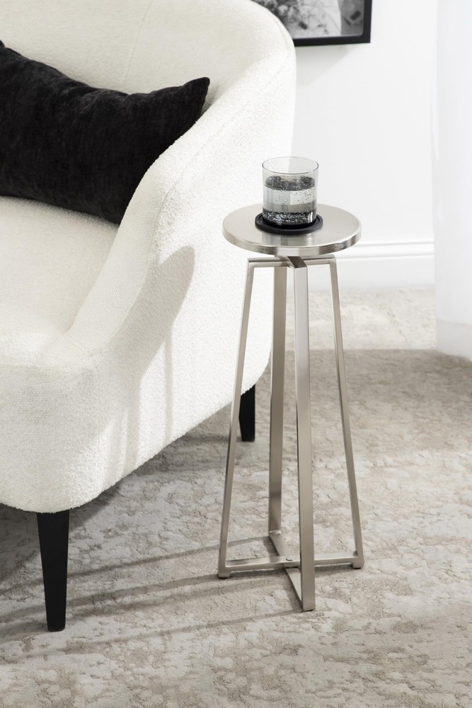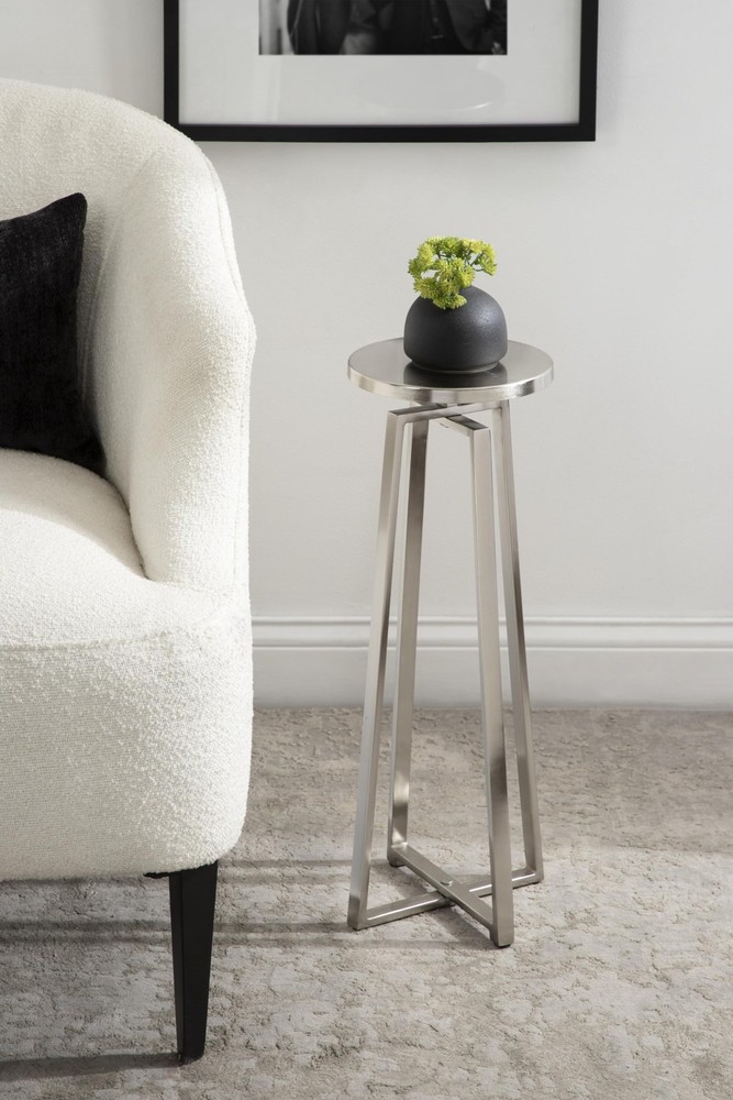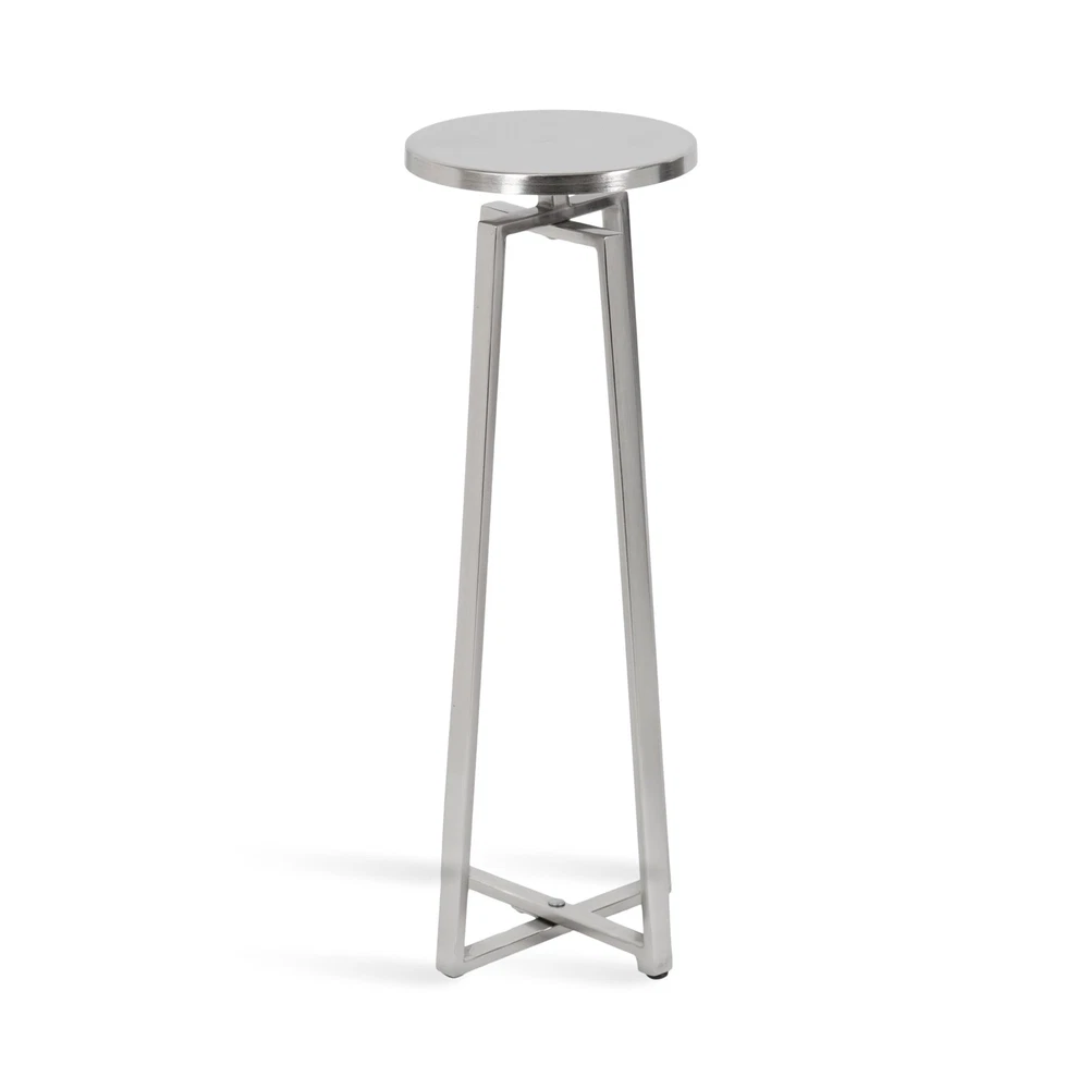 Modern Drink Table: The Zia cocktail table brings clean, modern design to its X-shaped metal frame and pedestal-like round tabletop, showcasing an elegant yet timeless design Quality Material: The Zia drink table is handcrafted in India from rich iron, providing a distinct brushed metal finish Versatile Table Decor: Use this multifunctional drink table as a display for plants, photos, or candles, or to hold a drink in a living room, bedroom, or bathroom Easy Assembly: The no-hassle assembly process for this drink table takes a matter of minutes with the three-step instructions Compact Size: The tabletop's diameter is 8 inches while the overall height is 23 inches, making this martini table the perfect element next to a chair or beside a bathtub