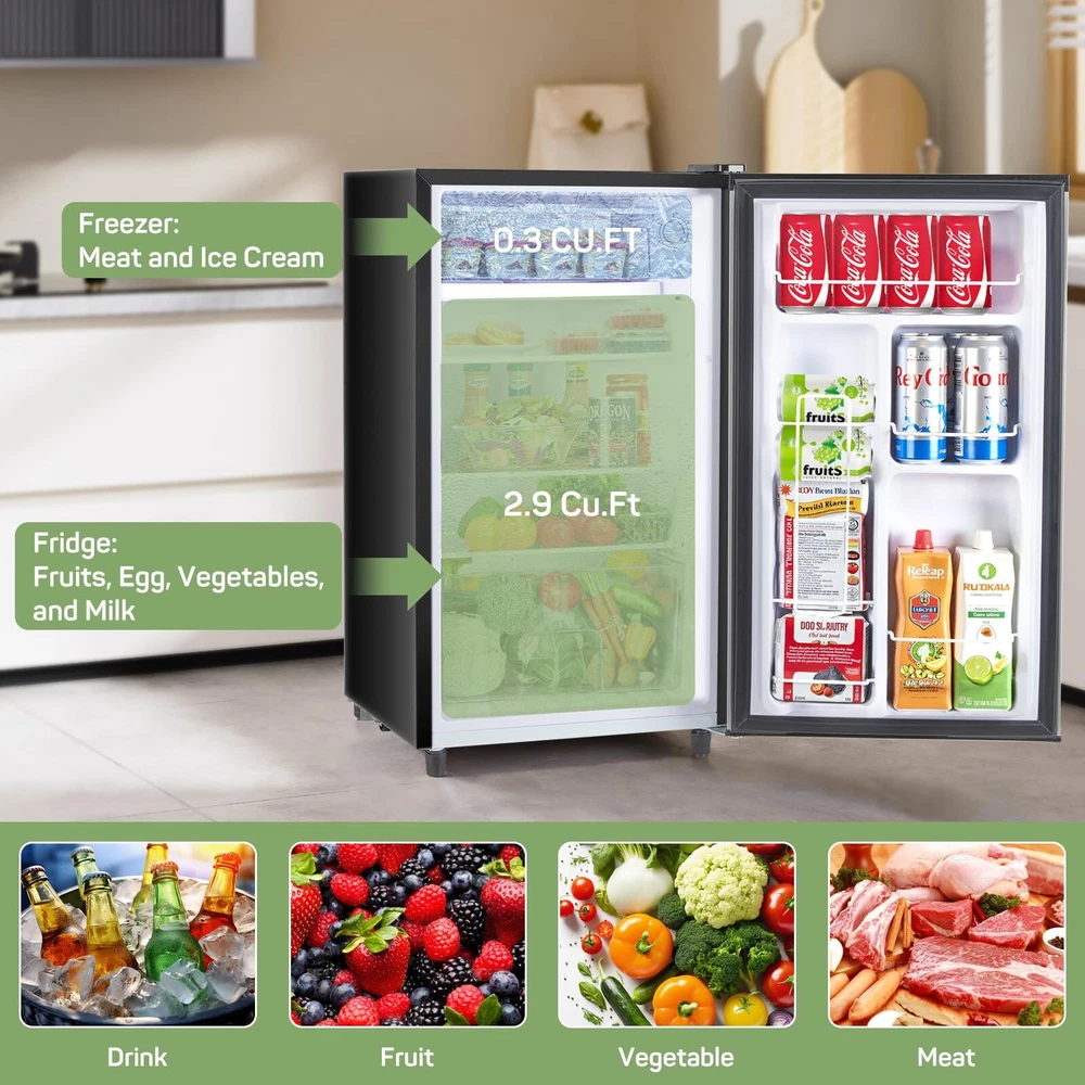 Mini Fridge for Bedroom, 3.2 Cu.Ft Small Refrigerator with Freezer for Dorm Office, Compact Single Door Adjustable Thermostat Low Noise, 17.5"D x 17.7"W x 31.5"H Compact Design: This mini fridge measures 17.5’’ x 17.7’’ x 31.5’’ and has 3.2 Cu.ft(90.6 L) capacity including freezer. With its compact footprint, it optimizes storage capacity while minimizing the space it occupies. Ideal for dorms, offices, bedrooms, RVs, and garages, this refrigerator is designed to provide convenience without compromising on space. 5 Temperature Settings: The Zibbizo fridge features five temperature settings for superior cooling performance. The temperature settings range from 1 (highest) to 5 (lowest), with 3 being the optimal temperature. The total capacity is 3.2 Cu.ft, including a 2.9 Cu.ft refrigeration area (33.8℉~44℉) and a 0.3 Cu.ft freezer area (23℉~35℉). Whether you need to chill beverages, store snacks, or keep fruits fresh, the 5 adjustable settings offer versatility for different items. Energy-efficient & Quiet: The energy cost is estimated to be as low as 0.41 kWh per day, helping you save on energy bills. This fridge operates at an average of 38 dB, bringing you a quiet and energy-efficient life. Enjoy the perfect blend of energy savings and tranquility, making it an ideal choice for bedrooms, studies, and quiet spaces. Crisper Drawer & Adjustable Shelves: Features a crisper drawer, 2 adjustable shelves, and door compartments. The storage space is adjustable to practical uses with removable shelves. This clever design can optimize storage space and effortlessly accommodate foods and beverages of various sizes and shapes. Accessories & Services: 1 single door mini fridge, 2 removable shelves, 1 crisper drawer, 1 user manual. If you have any questions, please get in touch with us, and we will reply in time