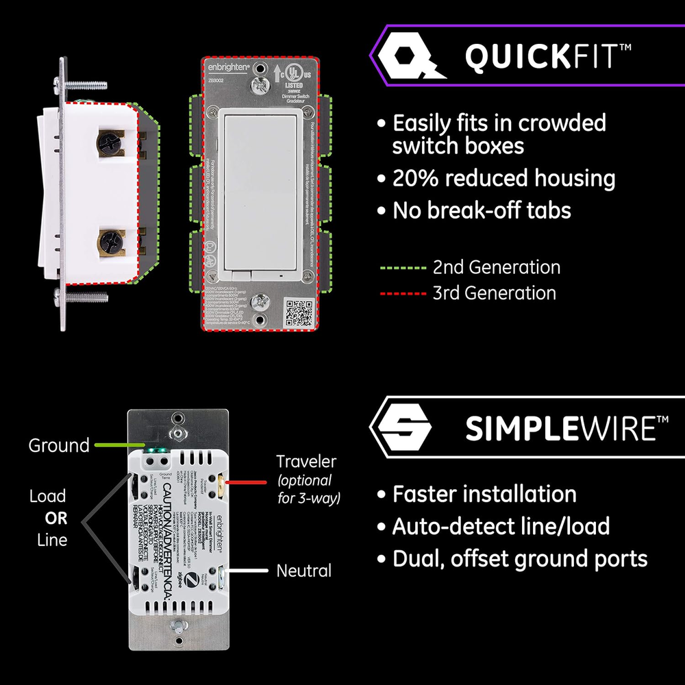 Light Flickering? – The 52327 Direct Lighting Bypass (Search for ASIN: B08ZJQV7W2) is designed for Jasco, Enbrighten, UltraPro, Z-Wave smart dimmers but may improve performance of other Z-Wave or Zigbee dimmers to prevent light flickering. Revolutionary, patent-pending design – QuickFit and SimpleWire technologies offer groundbreaking home automation features. Unique advancements make the smart controls easier to install and more reliable than ever. QuickFit - Improved components reduced the housing depth by up to 20% compared to previous Zigbee models and eliminated the need for break-off tabs. QuickFit enhancements are the ideal smart solution for older-style switch boxes SimpleWire - Auto-detecting line/load terminals support fast installation by identifying line and load wires and configuring the dimmer accordingly. Dual ground ports, which are offset to avoid switch box mounting screws Voice control - Pair directly with 1st and 2nd generation Echo Plus, Echo Show 10, or Echo Studio immediately out of the package for easy voice command of connected devices. No additional equipment is required for use with these Echo models. Energy monitoring – Stay informed of energy use when paired with a compatible hub. Energy-monitoring readings and functions vary based on hub capabilities. Enbrighten Zigbee Smart Light Dimmer with QuickFit and SimpleWire, Pairs Directly with Echo 4th Gen/Echo Show 10 (All)/Echo Studio/Echo Plus (All)/Eero Pro 6, White & Light Almond, 43082