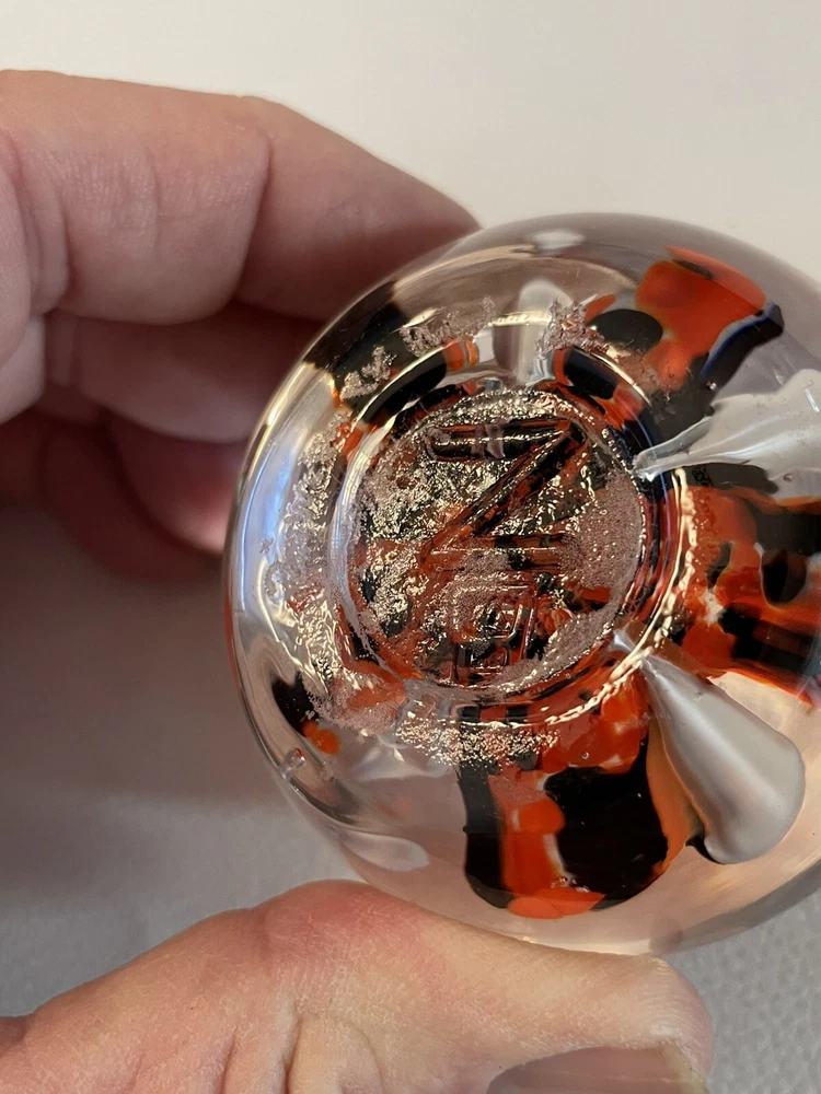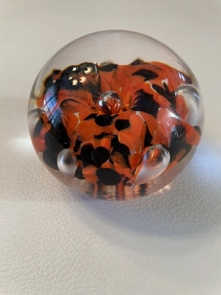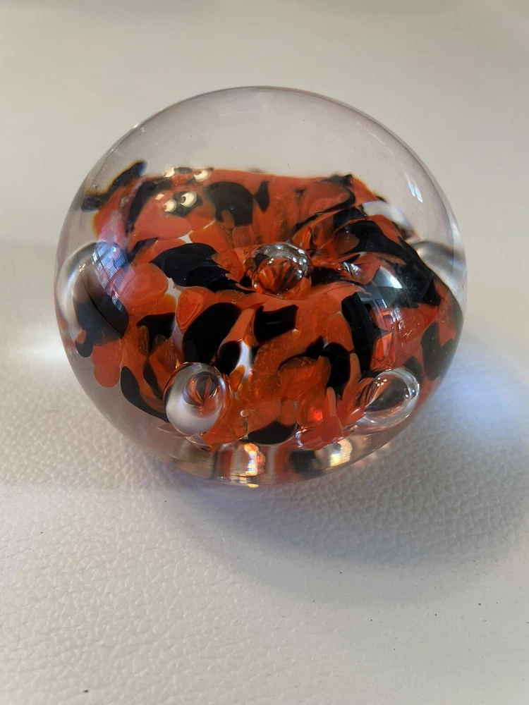The Zimmerman signed art glass desk paperweight features a striking design of orange and black floral. Z embossed on bottoms of paperweight. Engraved Zimmerman but 1st name and year are hard to determine. 2 surface scratches slight 1/4 - one pen point size. One small air bubble.