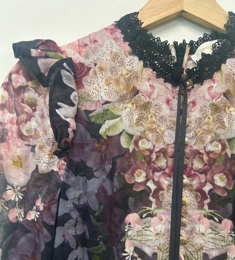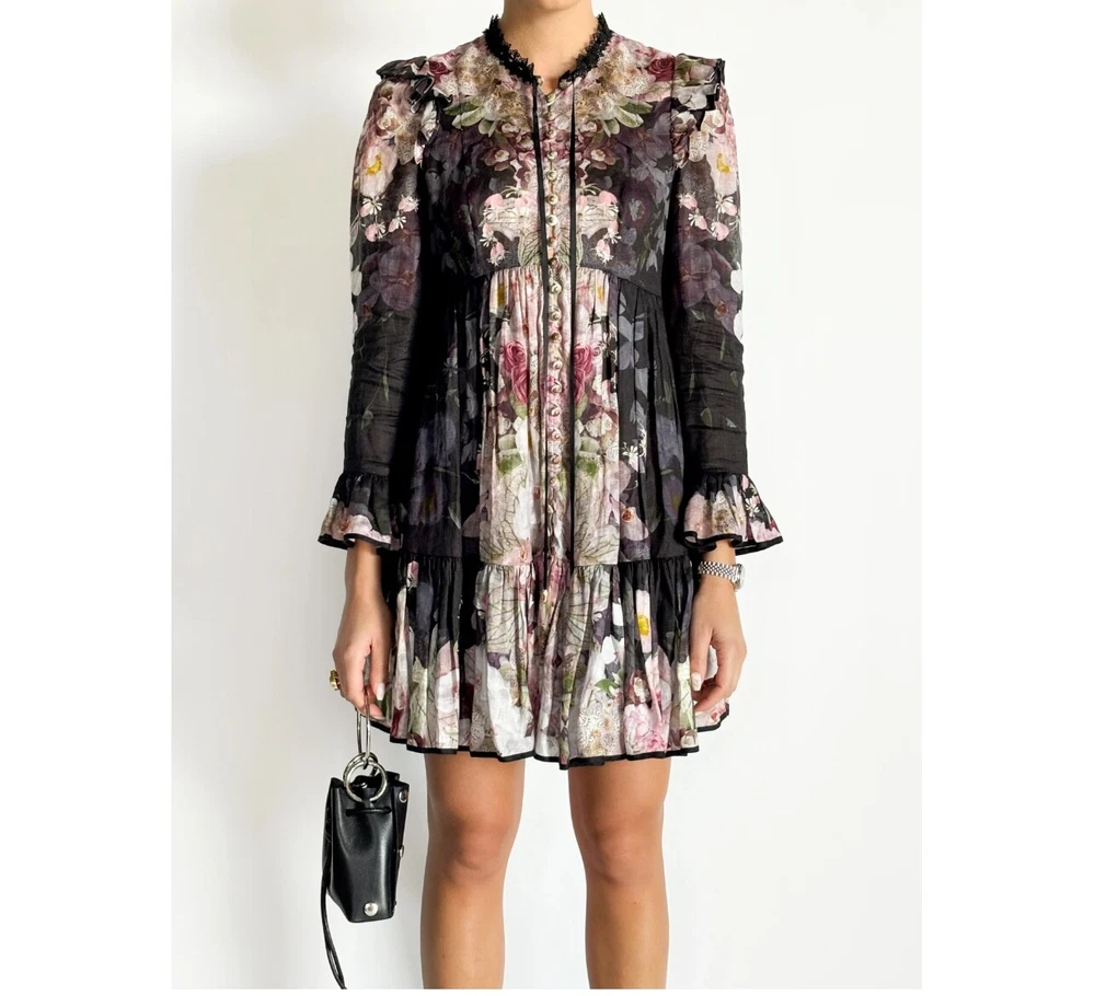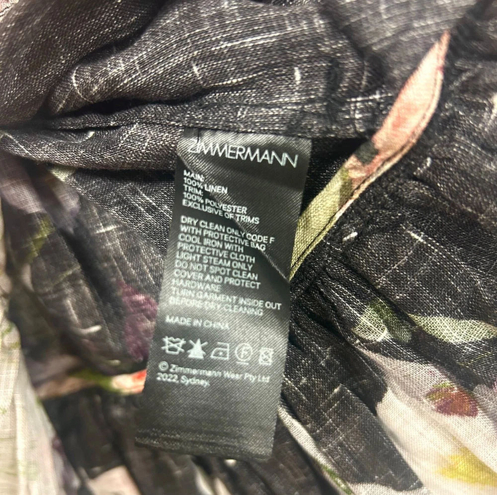 Zimmermann Black & Pink Floral Tie Neck Dancer Mini Linen Dress Size OP The Dancer Tie Neck Mini in Black Garden Floral A linen mini dress in a black with pink and cream garden motif, featuring an empire waist, straight sleeves with fluted cuffs, frills at collar shoulders and hem. Also features an adjustable velvet lace neck tie and a dropped hem 100% Linen Size OP Pls refer to brands offical website for more details on their sizing Fitted bodice Relaxed skirt with frill hem Frills throughout Flower studded button and loop closure down centre front Fabric covered buttons Black lace semi high neckline Velvet adjustable neck tie (can be tied in pussy bow) Contrast stitching throughout Pockets either side Fully lined Excellent condition If you have any questions or require more details, photos ect pls don’t hesitate to msg me Pls check out my other listings - am open to reasonable offers (no low balls pls) and happy to combine postage #designer #australian #alemais shona joy alice mccall acler aje spell