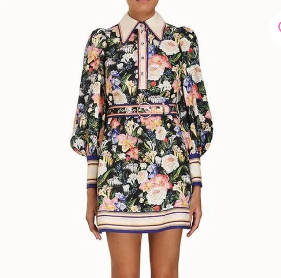 Zimmermann Coaster Long Sleeve Tunic Dress The Coaster Long Sleeve Tunic in Mayflower Black Print from the Spring 2023 Collection, Wonderland. A mini dress featuring a classic collar, blouson sleeves and a placement print throughout Size 2 (Aus/UK 12, US 8) Linen mini dress Floral tropical style print Contrast collar, hem and cuffs Elongated zip cuffs Removable self covered belt with gold circle buckle Excellent condition If you have any questions or require more details, photos ect pls don’t hesitate to msg me Having a MASSIVE clear out ATM so take a sec to check out my other listings - am open to reasonable offers (no low balls pls) and happy to combine postage #designer #australian #alemais shona joy alice mccall acler aje spell