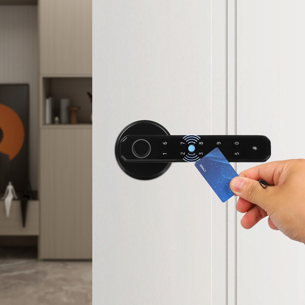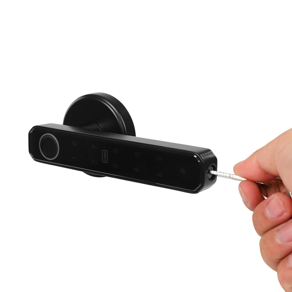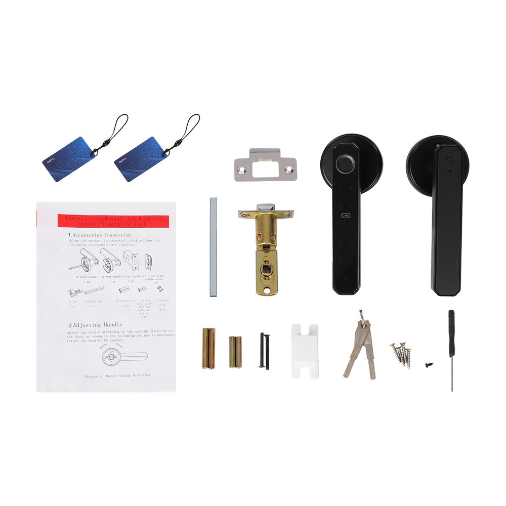 Zinc Alloy Finger Print Lock, Bedroom Door Lock Keypad Door Lock W/ Handle Description The smart lock can bring a lot of convenience to our life, protect our privacy, and also be the witness of our life. The door lock is made of solid and durable zinc alloy and can be used for a long time. The timeless black look can match many different colors and styles of doors. A variety of powerful functions and high work efficiency can enable you to enter a warm room in a short time, which is a good helper for your life. Key Features High-end Material: The door lock is made of zinc alloy, which is durable, and resistant to rust and corrosion, so it can be used for a long time. Exquisite Workmanship: The door lock is painted to make the surface smoother and the color brighter. It can attract more people’s attention to a certain extent. Multiple Unlocking Methods: There are multiple unlocking methods for this door lock: fingerprint, password, key, and mobile phone. You can choose freely according to your needs. Considerate Design: The product is suitable for left and right handed doors so you can install it directly. In addition, when relatives and friends visit and you are not at home, you can also set a temporary password to prevent them from waiting for a long time. Large Capacity: The door lock can store up to 50 sets of fingerprints and 100 sets of passwords. Such a large capacity allows the door lock to be widely used in a variety of different scenarios. High Efficiency: The door lock adopts semiconductor fingerprint unlocking and AI artificial intelligence algorithm, which can automatically perceive and quickly identify fingerprints, allowing you to open the door within 0.5 seconds, so you don't need to wait for a long time. Good Security Performance: The door lock is designed with an anti-peep touch screen and virtual password, so you can enter a random password before and after the correct password. In addition, when the password is entered incorrectly, the product will have an alarm function, which can better protect your security and privacy. Powerful Functions: The door lock is equipped with a mute mode, and you can adjust the volume to ensure that you will not disturb others when you go home at night. At the same time, if you need to open the door frequently, you can set the always-open model, so you don’t have to press your fingerprint every time. Intelligent Management: You can manage the door lock, such as door lock logs, deleting and adding users, setting volume, alarm functions, etc. This provides you with more convenience. Strong Endurance: The four 2200mAH batteries can be used about 8000-10000 times, and has a low battery warning function to remind you. When powered off, you can also use the charging bank for emergency charging or the mechanical key, so that you can use it without worry. Simple Installation: The package of the door lock includes all the accessories required for installation, and we also provide a detailed manual, so you can install it only according to the steps in the manual. Easy to Clean: The door lock has a smooth surface and a small size, so you can clean it without spending much effort. After a period of use, you only need to use a towel for cleaning. Ideal Gift: The door lock has powerful functions, a beautiful appearance, and high efficiency. It can be used as a gift for a housewarming. You can also give it to friends and family so that they can enjoy more convenience. Quality Service: We stand behind all our guests and look forward to assisting you with your purchase. It is our pleasure to answer your confusion and questions. So please feel free to contact us if you have any problems. Details Round Corners: The corner of the door lock is round. Compared with the traditional square corners, it can better protect your safety and prevent your skin from being scratched. HD Display: When you enter the room, touch the hidden password keyboard, and the digital display will light up. This clear digital display can help you enter the password correctly and quickly. Application This fingerprint lock is designed to fit US standard doors. It is suitable for the door with a thickness of 1-3/8 inches (35mm) to 2-3/16 inches (55mm). This product can be widely used in wooden doors, homes, closets, interior doors, hotels, bedrooms, studies, offices, apartment buildings, etc. How to Add a Fingerprint A: Add users for the first time: 1. Press the setting key and the blue light flashes. 2. Press your finger 5 times until the green light is always on. 3. Successful entry and automatic exit. B: Add users for the second time. 1. Press the setting key. 2. The blue light flashes. 3. Verify the administrator once. (The first three fingerprint users of the door lock are administrators, and the fourth and subsequent fingerprints are ordinary users.) 4. The verification is successful and the blue light is always on. 5. Enter a new fingerprint, press your finger five times, and the green light is always on, indicating success. How to Delete a Fingerprint 1. Press and hold the setting key for 9 seconds. 2. The blue light flashes, and the red light flashes after 9 seconds. 3. Release your hand, and the green light indicates that the factory reset is successful. Specification Color: Black Material: Zinc Alloy Surface Treatment: Painting Style: Modern Shape: Rectangular Control Method: Touch Lock Type: Keypad Lock Capacity: 50 Sets of Fingerprints and 100 Sets of Passwords Power Supply:4 * AAA batteries (Not included ) Capacity of Battery: 2200mAH Service Life of Battery: 8000-10000 Times Charge Port: USB Suitable Door Thickness: 1-3/8 inches (35mm) to 2-3/16 inches (55mm) Net Weight: 0.8kg/1.7lbs Gross Weight: 1kg/2.2lbs Product Size: 15.00cm*6.50cm*6.50cm/5.9*2.5*2.5inch Package Size: 21.8*17.8*7.3cm/8.58*7.01*2.87inch Package Included 2* Door Locks 1* English Manual 2* Keys All Accessories for Installation Notes Please carefully confirm the size of the door before purchase. Please