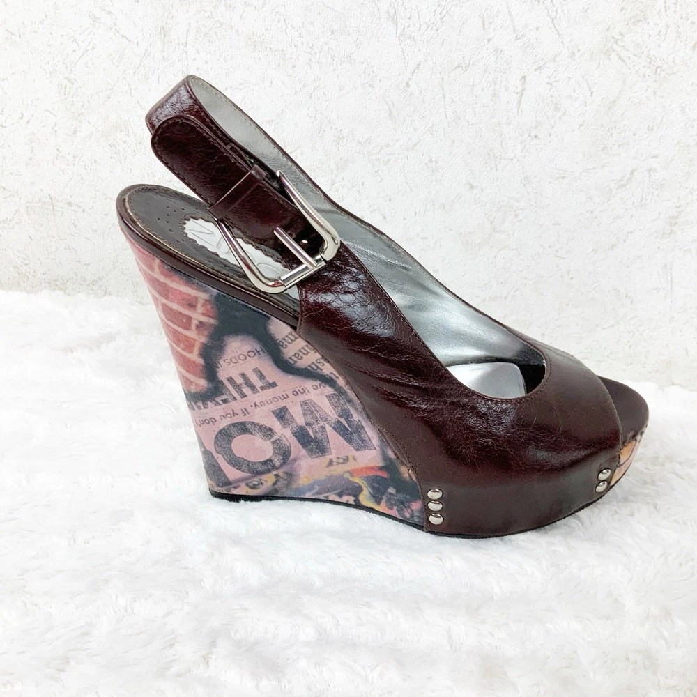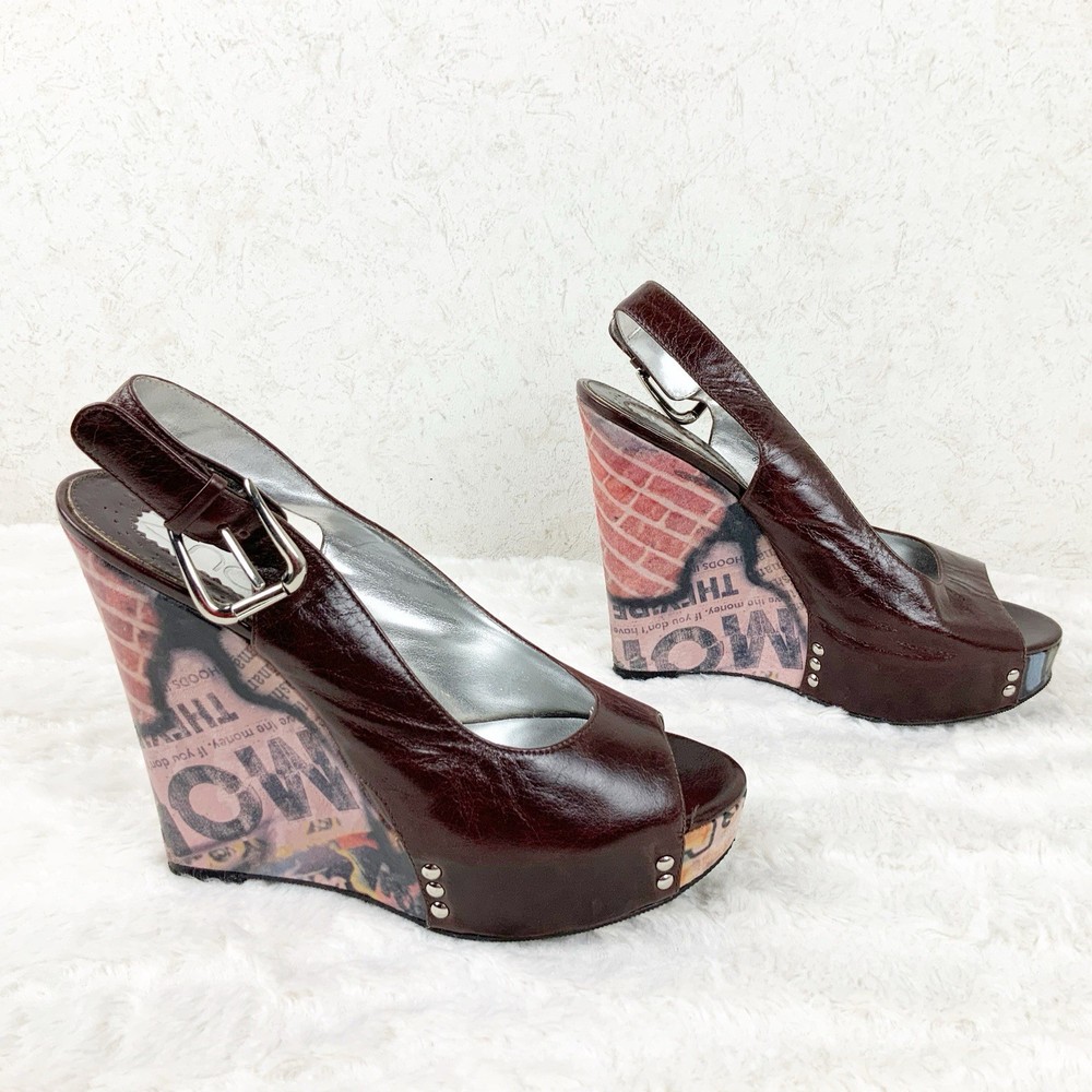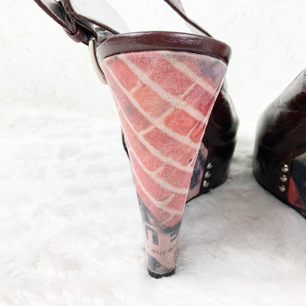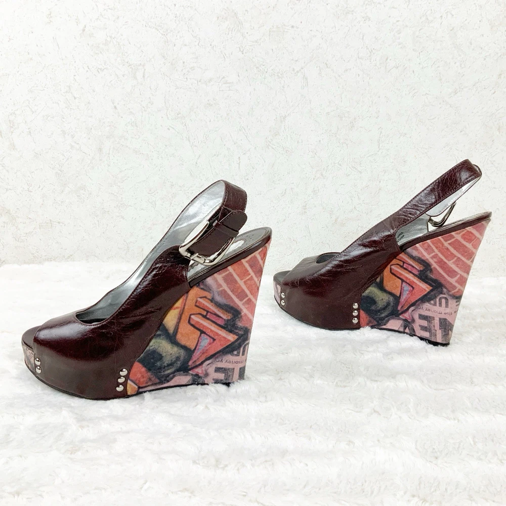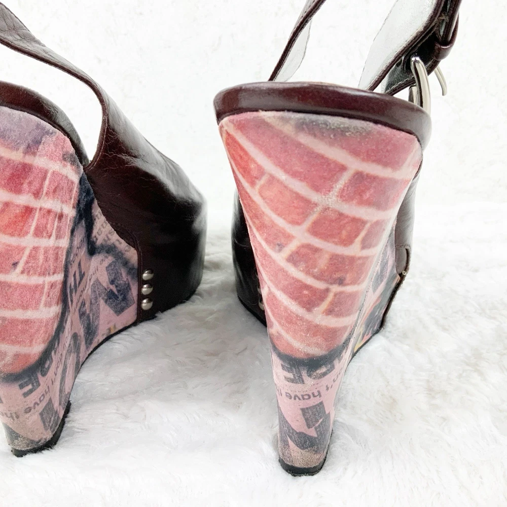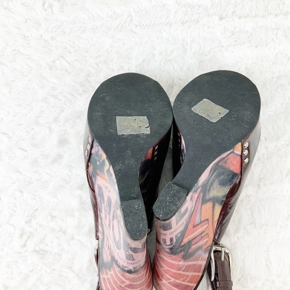 Minor wear & creasing, great condition overall Zinc Slingback peep toe wedges Leather Unique graffiti newspaper art pattern, soft suede like material at the wedge Size 8.5 Buckle strap Stud accents 5.5” heel