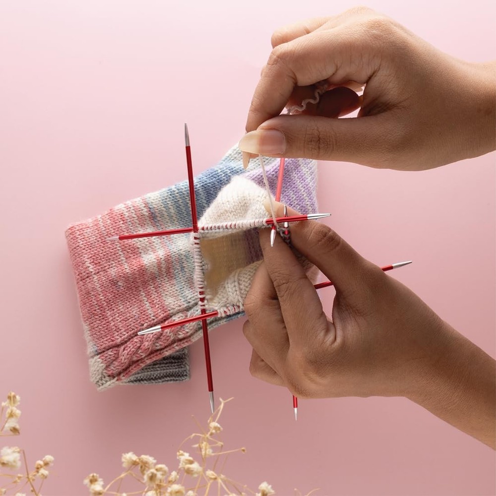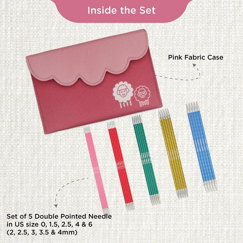 Starter Set Includes: Zing Double Pointed needles are available in 5 popular color-coded sizes, ranging from US size 0 to 6 (2mm to 4mm), perfect for knitting circular items like socks, gloves, mittens, beanies, etc. Superior Grade Lightweight Aluminium: Manufactured from superior grade lightweight aluminium, Zing Double Pointed Needles in this set are feather-light and run effortlessly through all kinds of yarns without causing discomfort or hand fatigue. Smooth Finish: Zing Double Pointed Needles feature a satin-smooth finish and are ideal for hours of pleasurable knitting. The yarn glides effortlessly through the needles without snags or pulls and helps create beautiful knitted projects. Laser-Printed Needle Sizes: Each pair of knitting needles is laser-printed with sizes that remain legible throughout the project. The marking on the needles ensures better readability and needle identification. Aesthetic and User-Friendly Packaging: This set comes in an aesthetically designed fabric case for easy storage and organization of knitting needles and accessories. The bright hue on the case and the adorable sheep motif adds a touch of playfulness to your knitting.