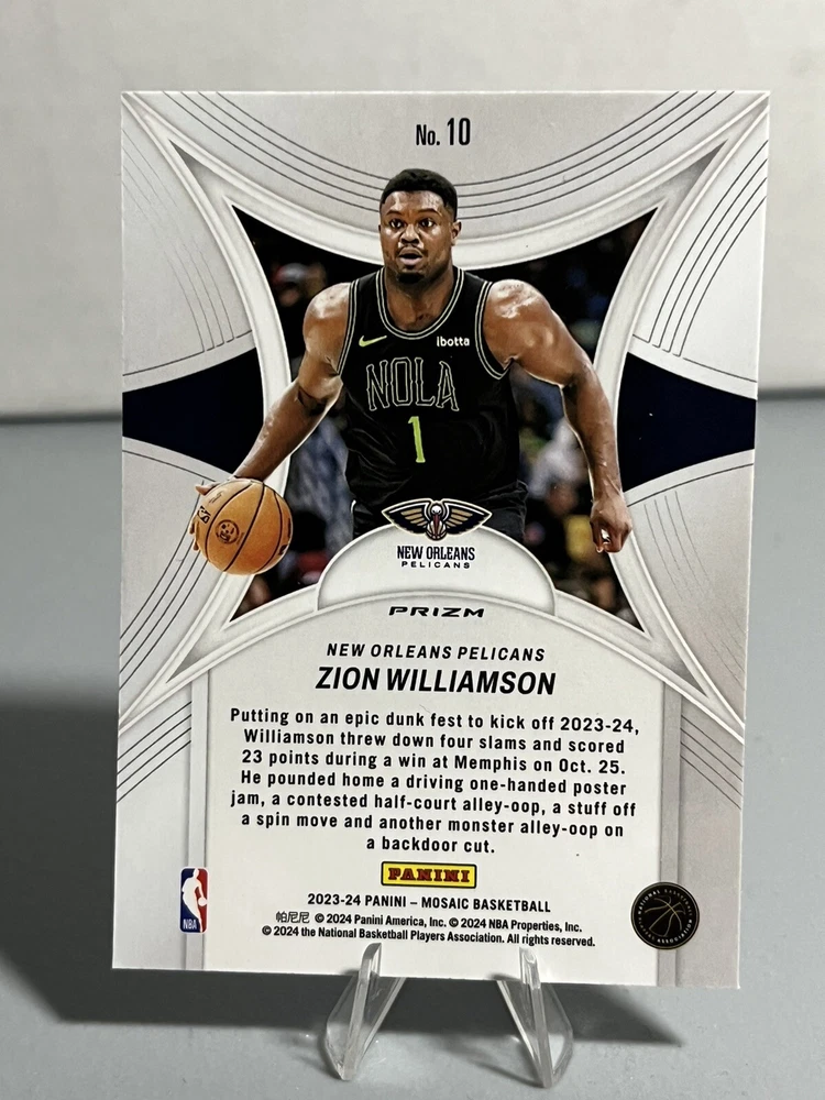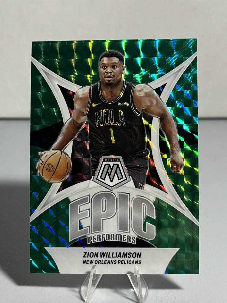 This is an epic sports trading card featuring Zion Williamson, the talented basketball player. The card is from the 2023 Panini Mosaic set and has a green mosaic prizm design, making it a unique and valuable addition to any collection. The card number is 10 and it is a single trading card. The season is 2023-24, and the manufacturer is Panini. This card is perfect for fans of Zion Williamson and sports trading cards alike.