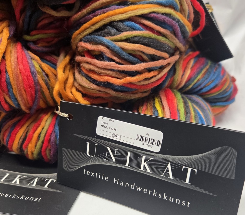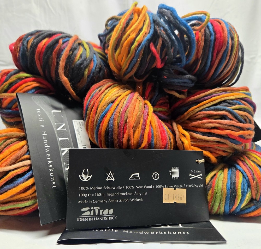 Zitron Unikat Luxury Textile Yarn Bundle - 100% New Merino Wool - 10 Skeins The Zitron Unikat Luxury Textile Yarn Bundle includes 10 skeins of 100% New Merino Wool yarn, perfect for crafting accessories like scarves. This high-quality yarn is sourced from Germany and features a unique self-strpiping style in multi-colors, adding a luxurious touch to any project. Ideal for those looking to create beautiful and intricate pieces with a premium material. YARN DETAILS: Made in Germany Blend: 100% New Merino Wool Weight: 100 grams Yardage: 160 meters/ skein Total Yardage: 1600 meters/ Lot (10 skeins) Color: 1 Dye Lot: 14264 From Smoke, Pet, & Fragrance Free Home. Stored Away From Animals and Elements.