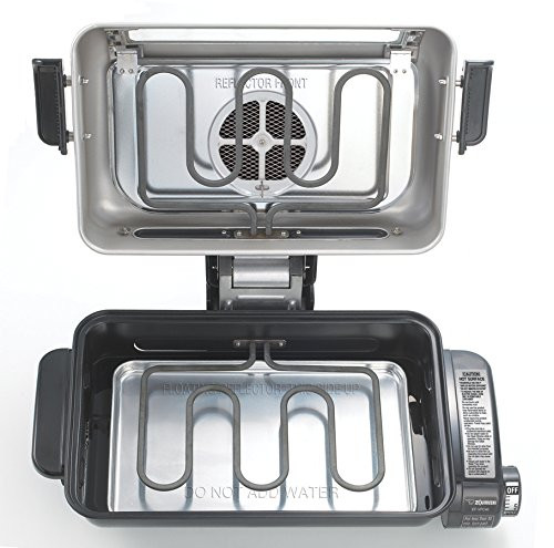 Zojirushi' s fish roaster has a platinum catalytic filter on lid that reduces up to 90% of smoke and odor components. Platinum is a very efficient catalyst in chemical reactions. By infusing platinum particles in the filter, it allows the filter to chemically decompose odor components into carbon dioxide and water more efficiently. Smoke is also chemically decomposed in a similar way. A catalytic filter itself does not change or easily deteriorate and does not have to be replaced, as opposed to other filters. The roaster also has top and bottom heat reflectors that work in tandem to enhance crispiness. Top and bottom heating elements allow even cooking without flipping foods. The extra wide roasting rack accommodates large fish and meats. Countertop fish roaster Extra wide roasting rack Platinum catalytic filter reduces smoke and odor Top and bottom reflectors enhance crispiness Stainless steel roasting rack directs excess oil and fat away from food