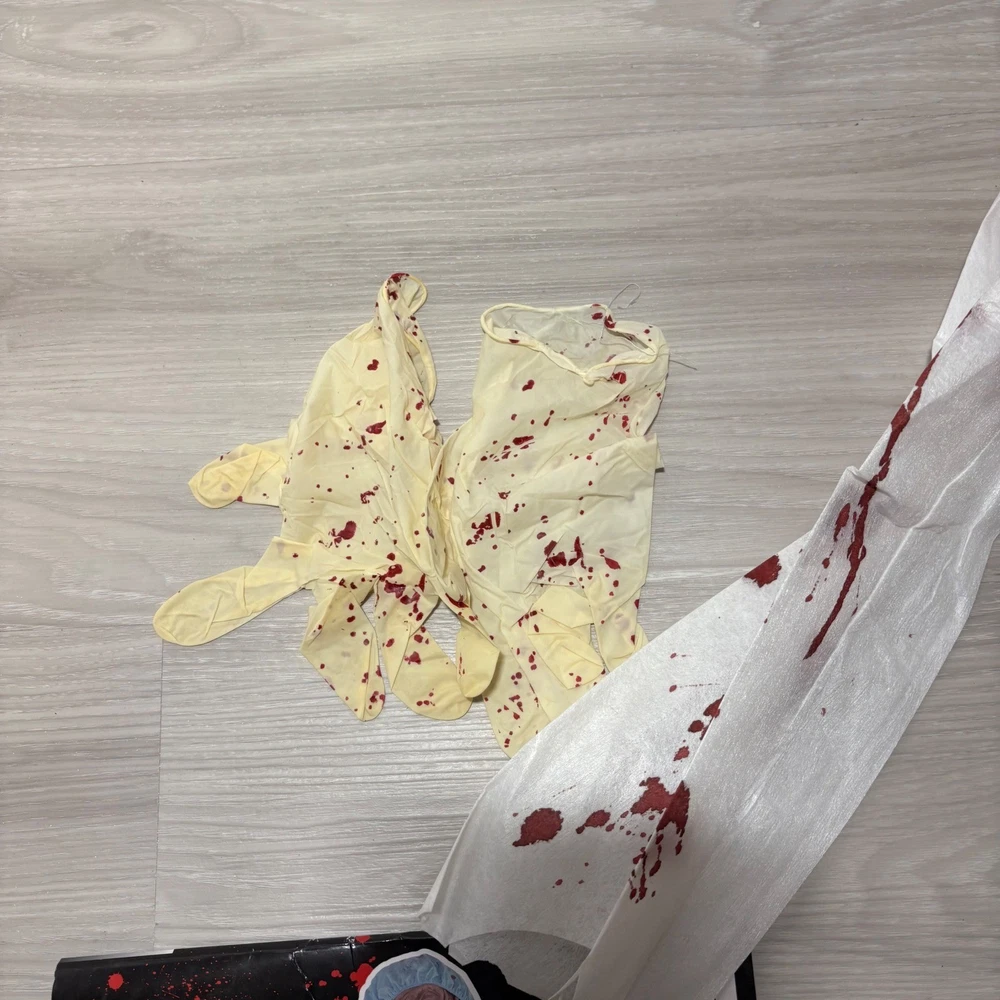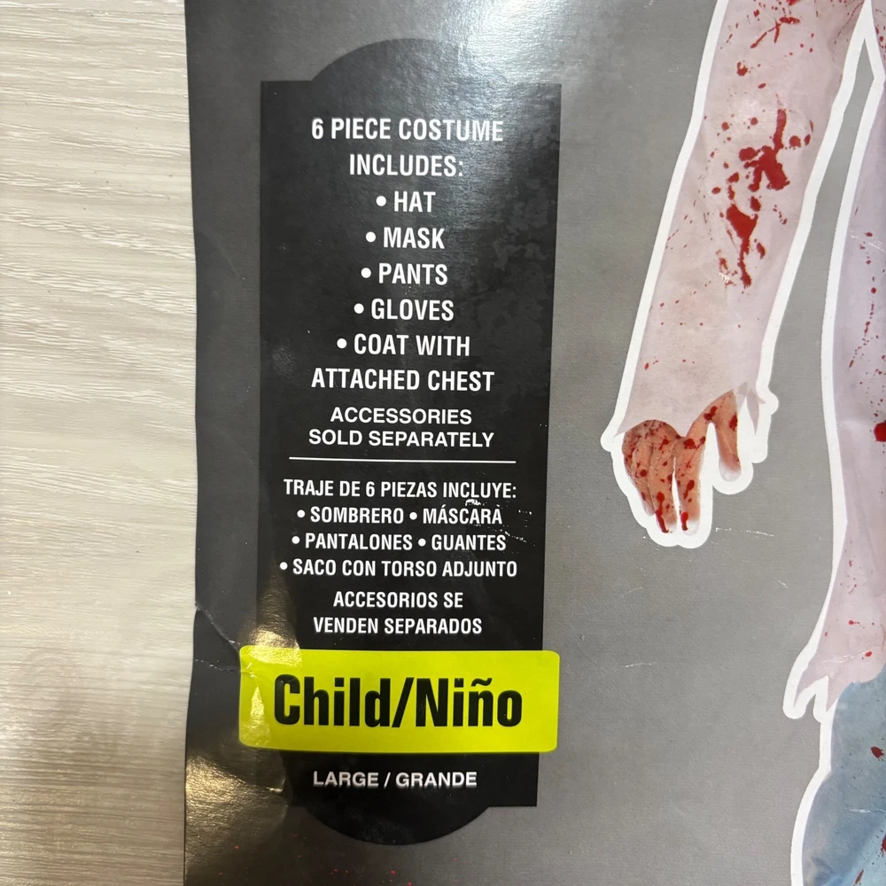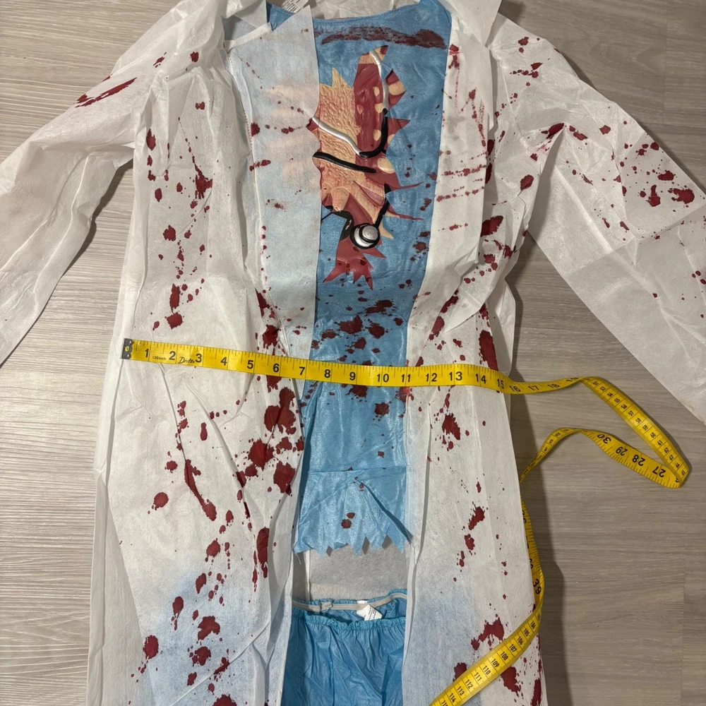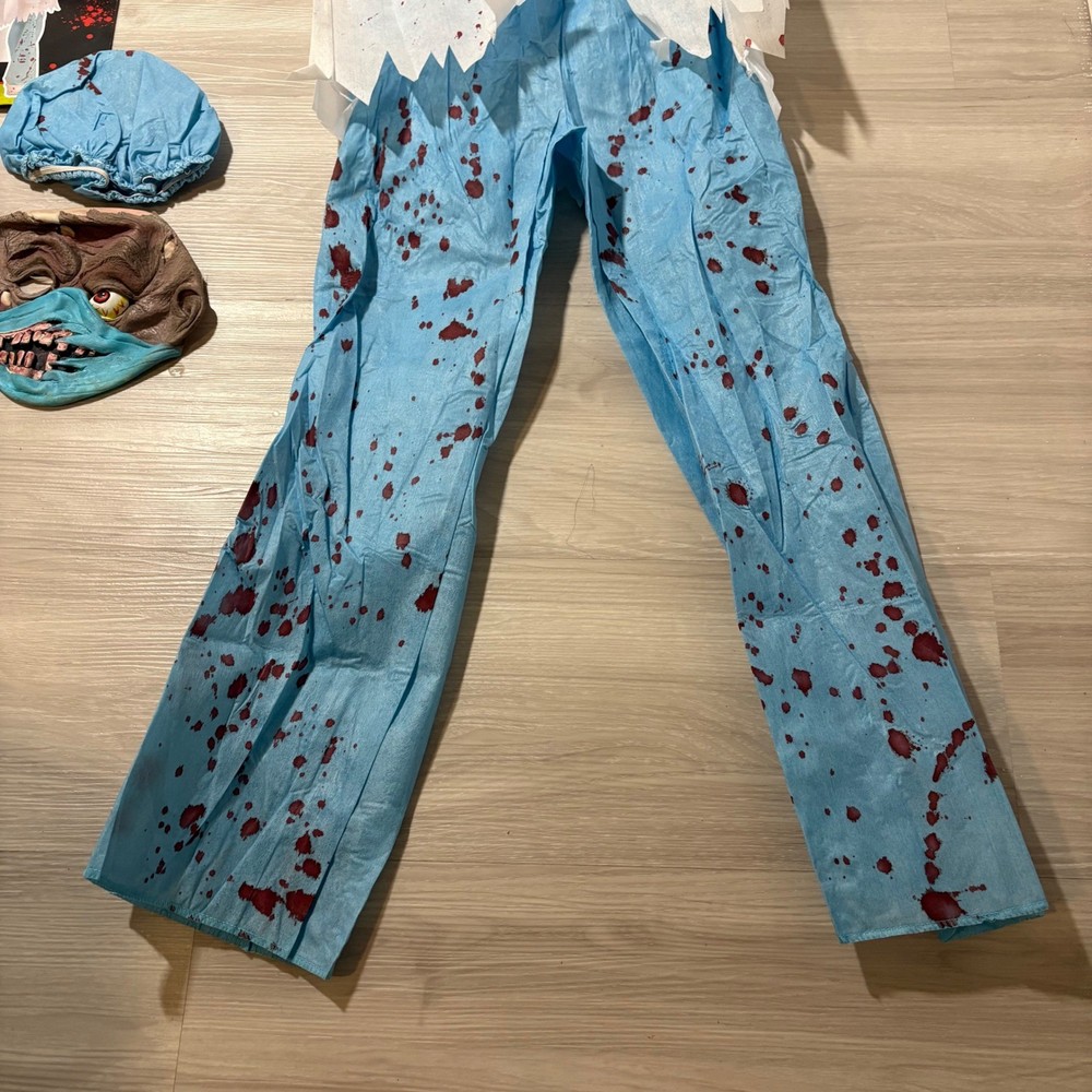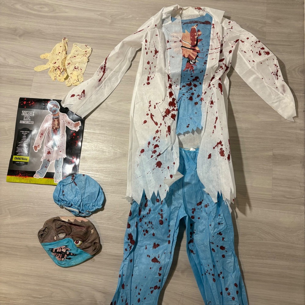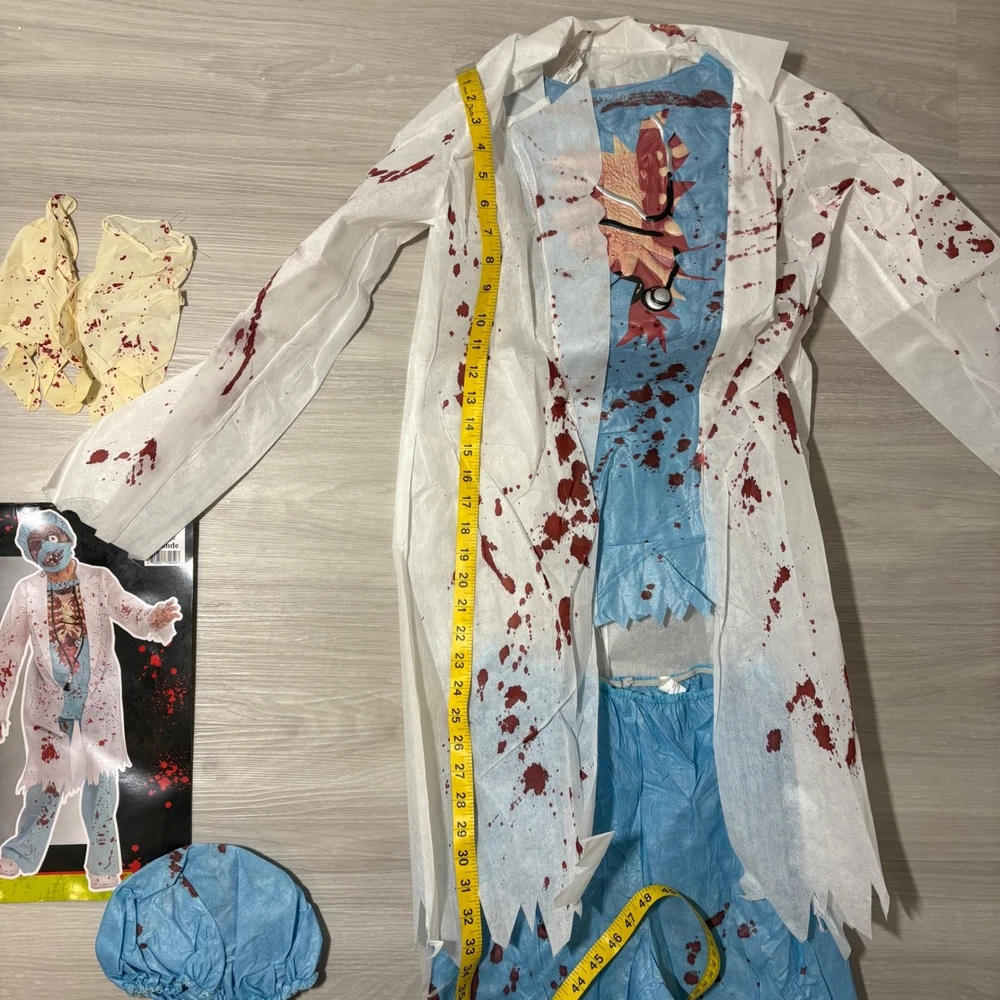 Unleash spine-chilling terror with this Zombie M.D. Doctor Zombie costume, ready to transform your child into the most fearsome figure this Halloween. This frightful 6-piece costume includes a blood-splattered lab coat, matching pants, a gruesome mask, a coordinating hat, and eerie gloves, ensuring a complete and captivating look. Perfect for Halloween night, costume parties, or spooky-themed events, this Zombie M.D. costume is guaranteed to make a haunting impression. Measurements: • Pants inseam: 27 inches • Chest Width: 15 inches • Coat Length: 31 inches Theme: Ghosts & Monsters Style: Complete Outfit Keywords: Zombie Doctor Costume, Halloween Costume Kids, MD Costume, Doctor Costume, Zombie Costume, Child Costume, Large Costume, Grande Costume, Halloween Outfit, Kids Halloween, Costume Party, 6-Piece Costume, Zombie MD Costume
